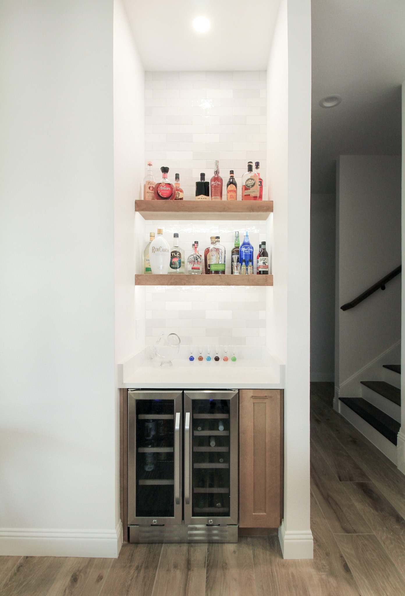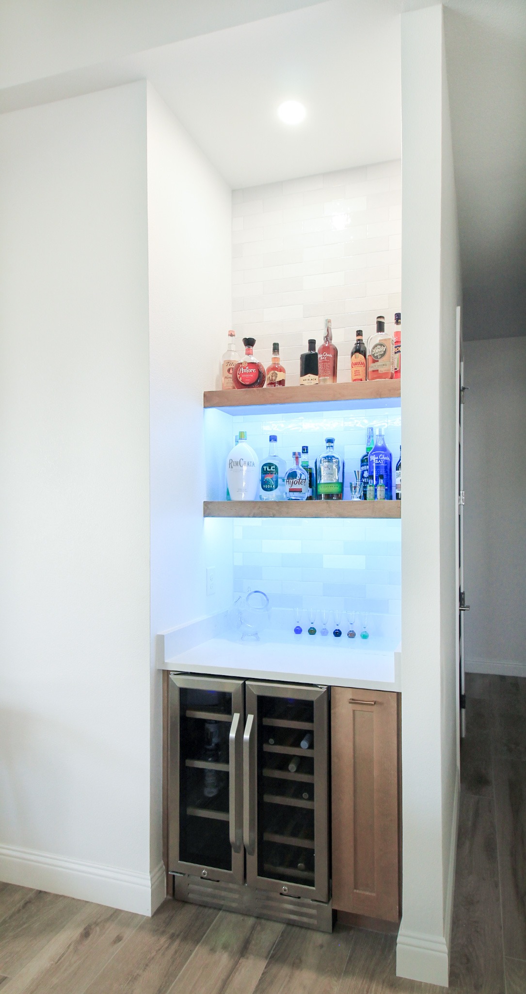 Before the fire, the kitchen included a separate dry bar. We rebuilt it with new cabinets, a tile backsplash, and floating shelves with color-changing LED lighting underneath — a fun detail.