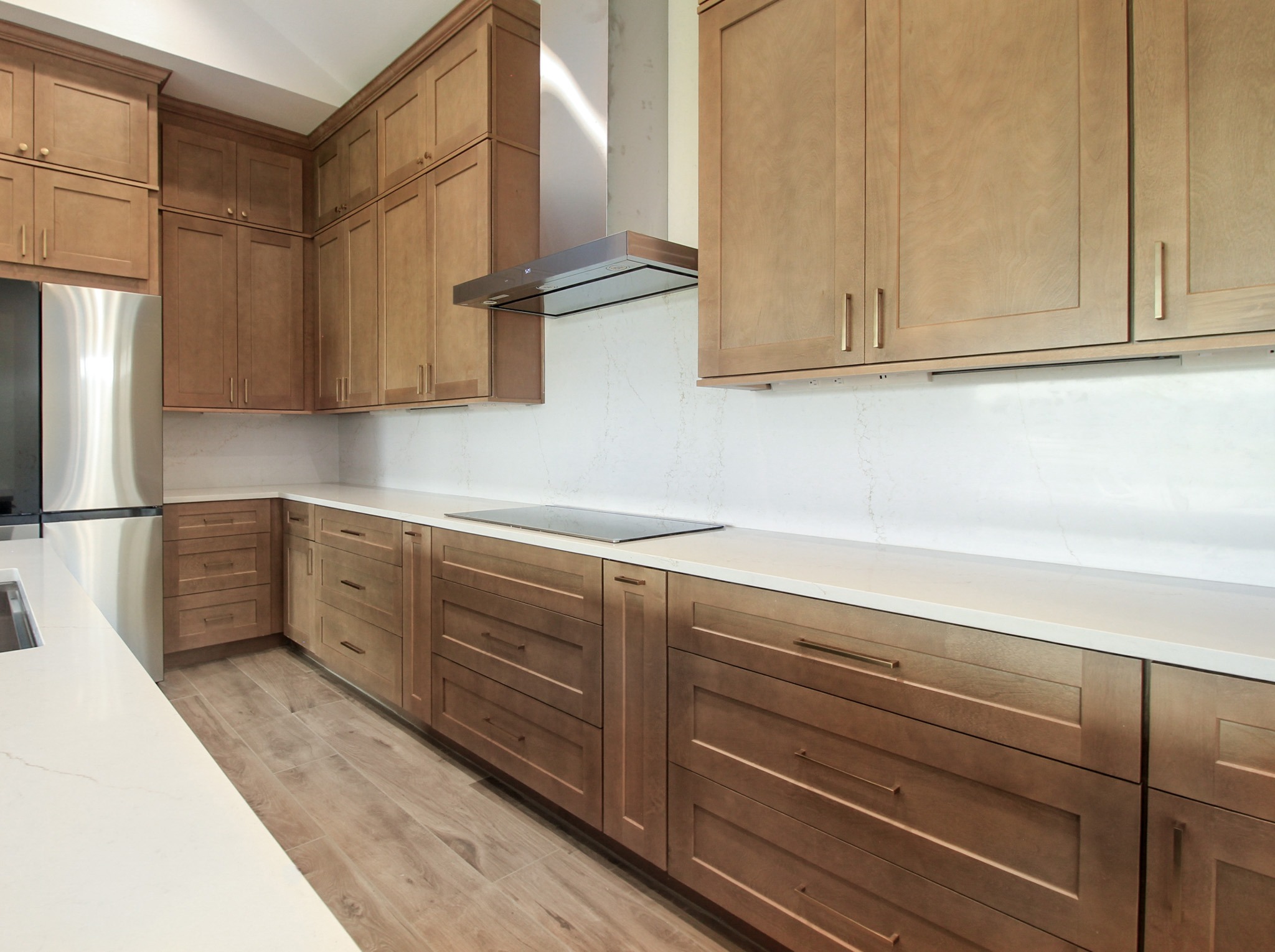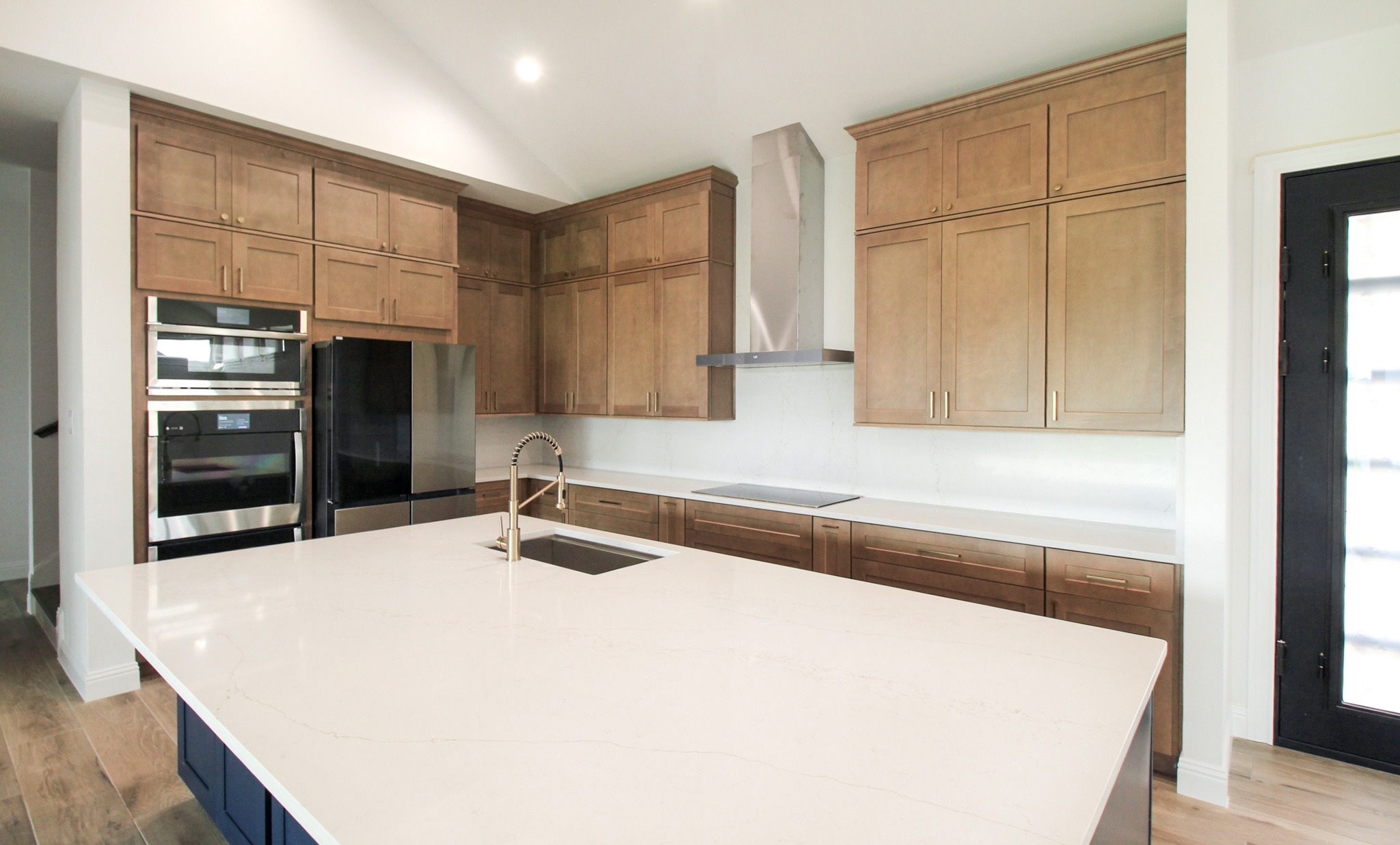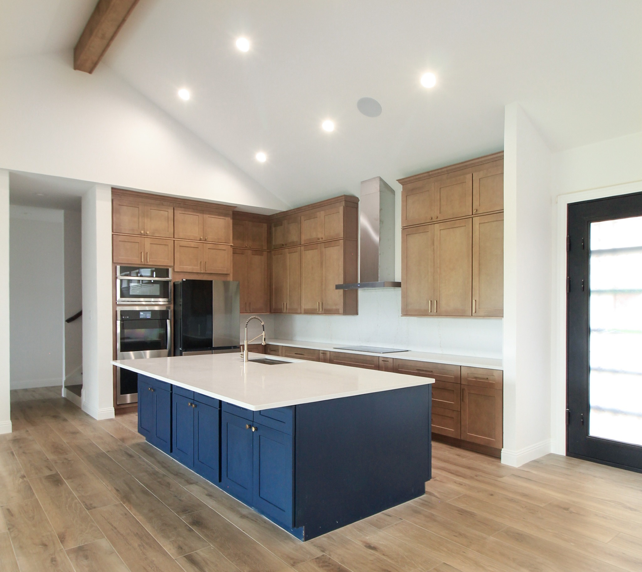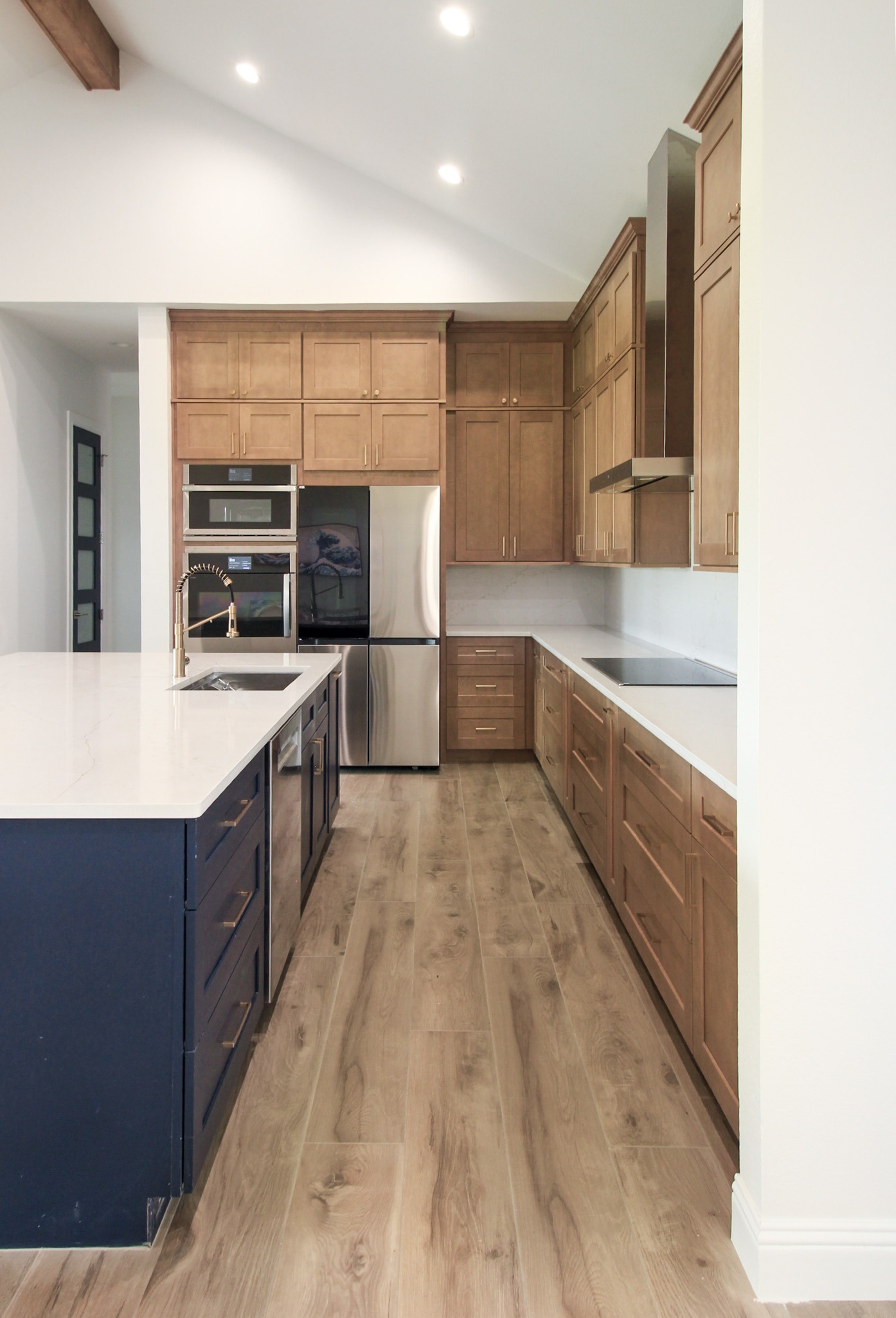 Downstairs, we installed wood-look tile throughout, giving the entire level a cohesive feel. Our clients selected ready-made kitchen cabinets in a beautiful two-toned design: light wood-stained perimeter cabinets paired with a bold navy island. Quartz countertops and a matching quartz backsplash create a clean, contemporary look, complemented by a sleek stainless steel vent hood and elegant gold accents.