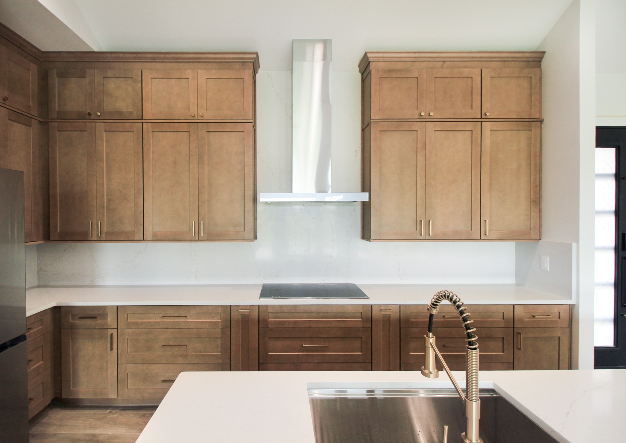 The kitchen is equipped with modern features and appliances, including an induction cooktop and a double oven with side-opening doors. The sink includes a convenient cup washer, and the faucet features a built-in filtered water spout connected to the new reverse osmosis system we installed.