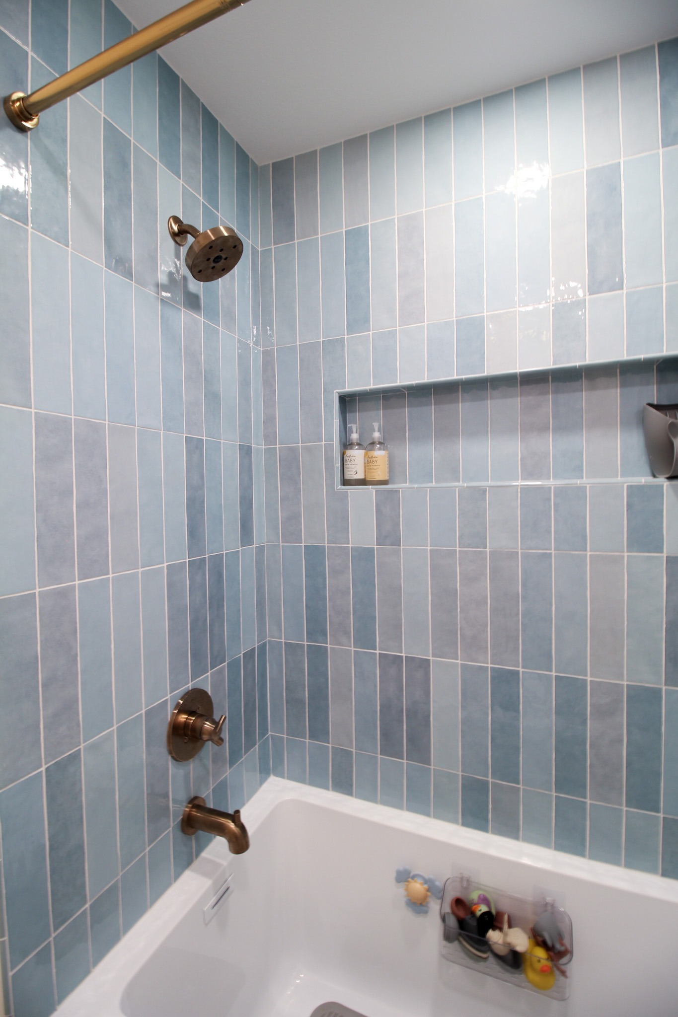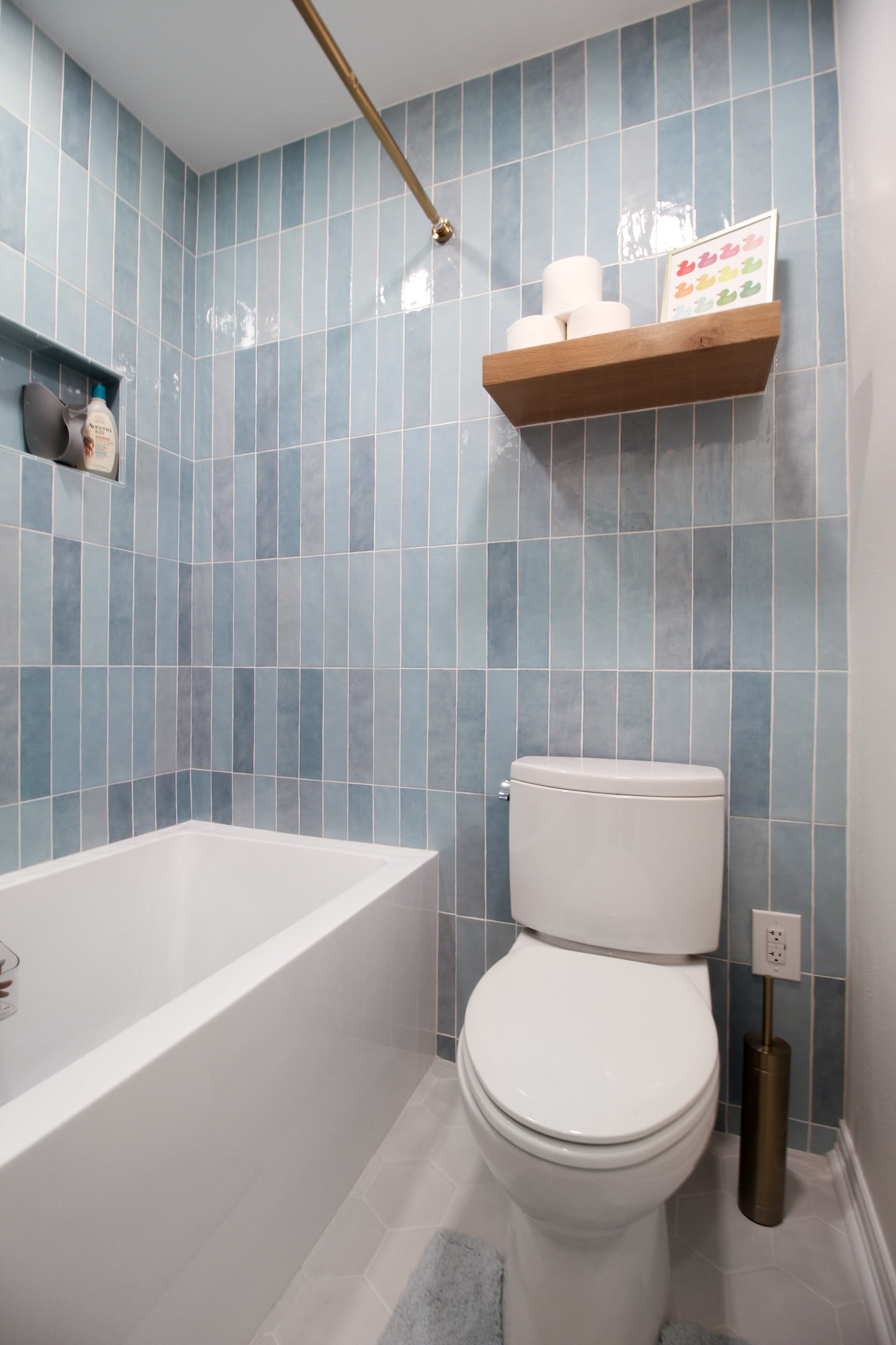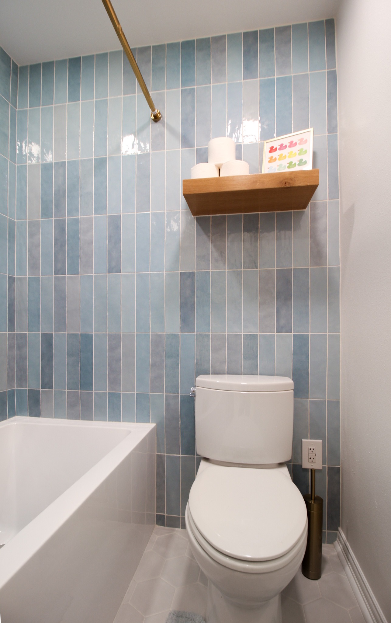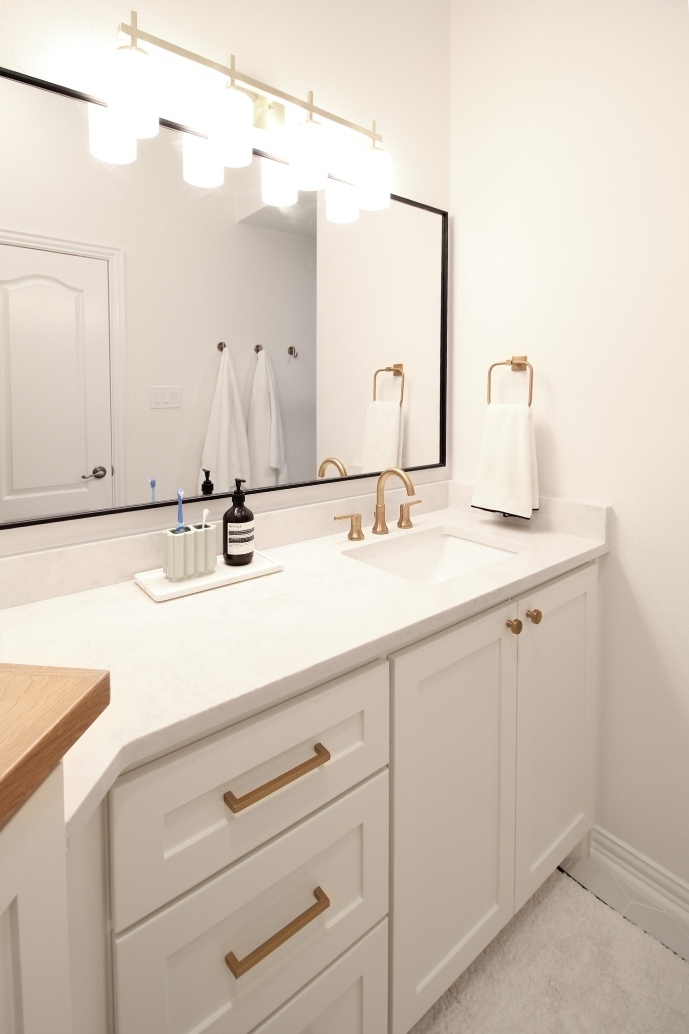 This family in Bedford was ready to improve their dark and outdated bathroom. Because this space was shared by two young children, they decided to transform the space into something bright, fun, and more age-appropriate. The loud, beige wallpaper was the first thing to go. We replaced tile floors, created a custom cabinet configuration for the angled wall, and installed quartz countertops. The new shower tile wraps around the toilet area and into the shampoo niche. We love the modern tile layout, gold fixtures, and natural wood accents in this room. The transformation is incredible!