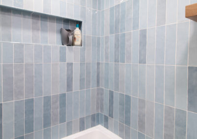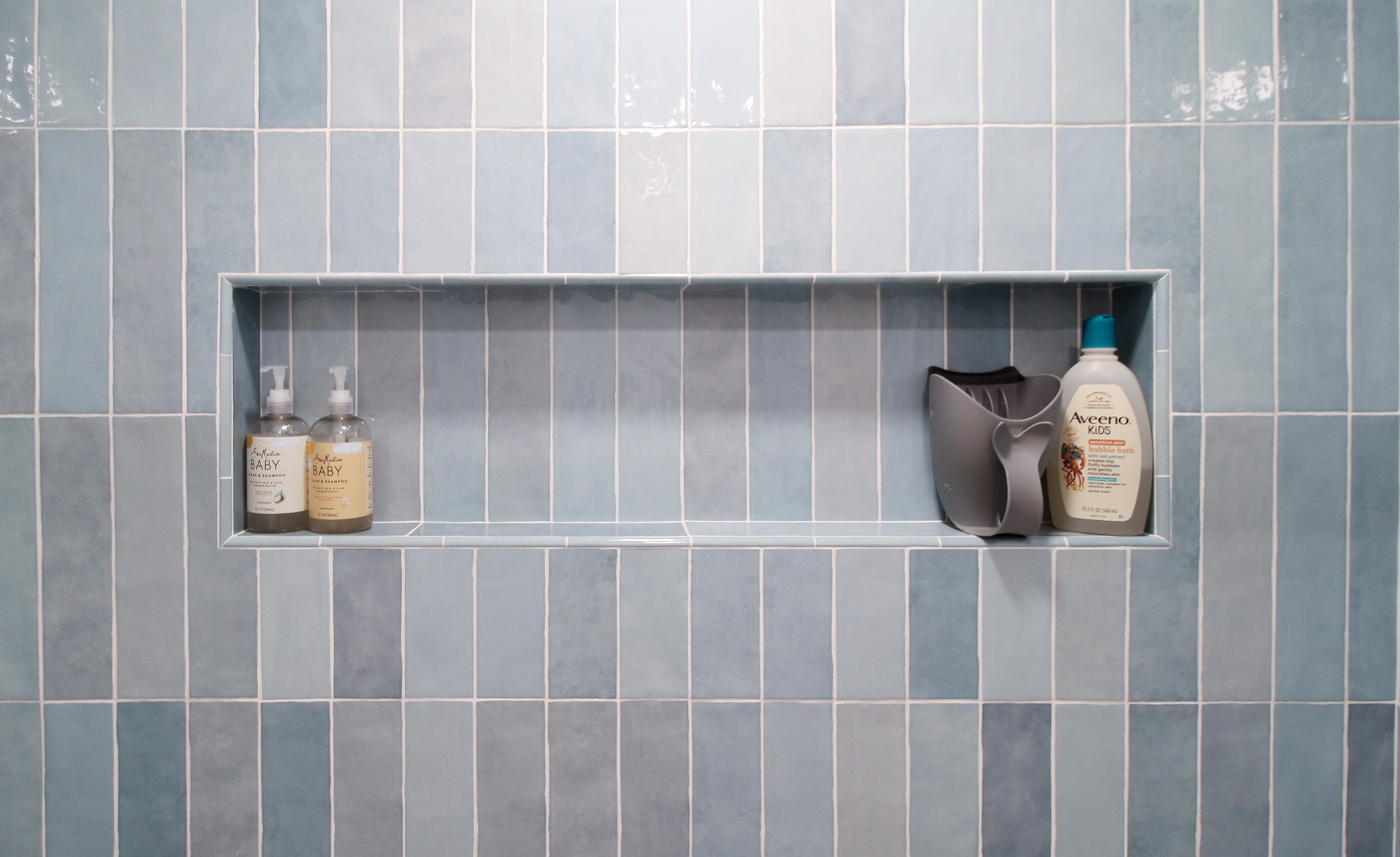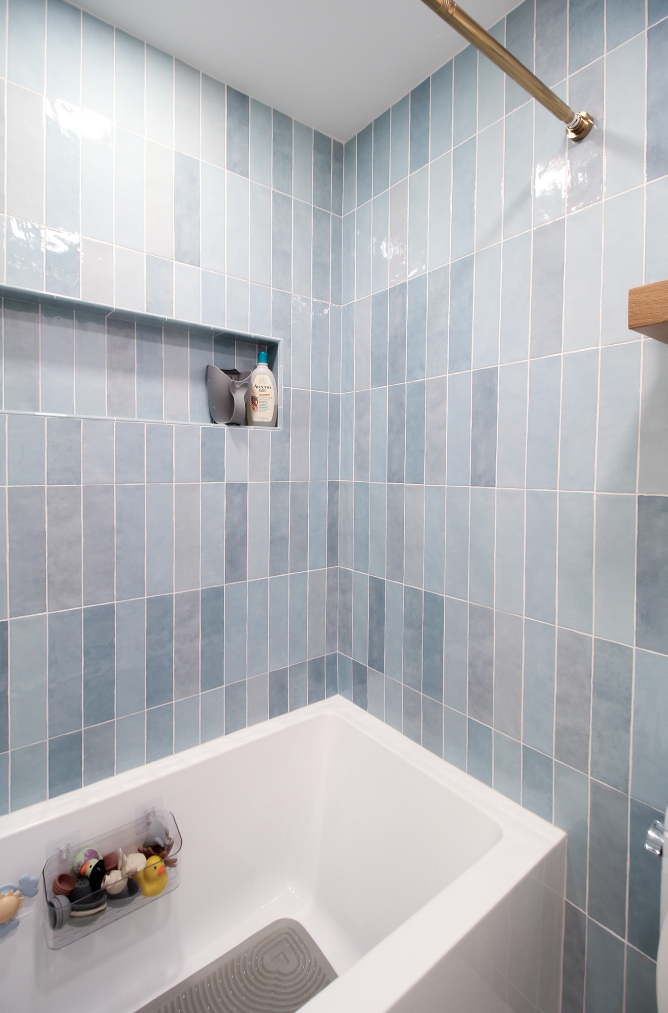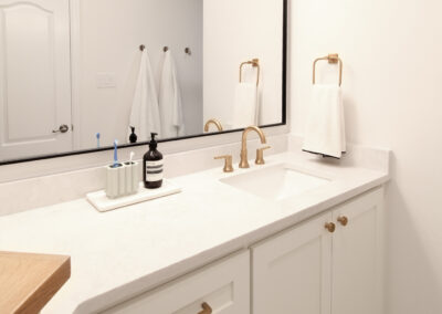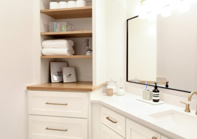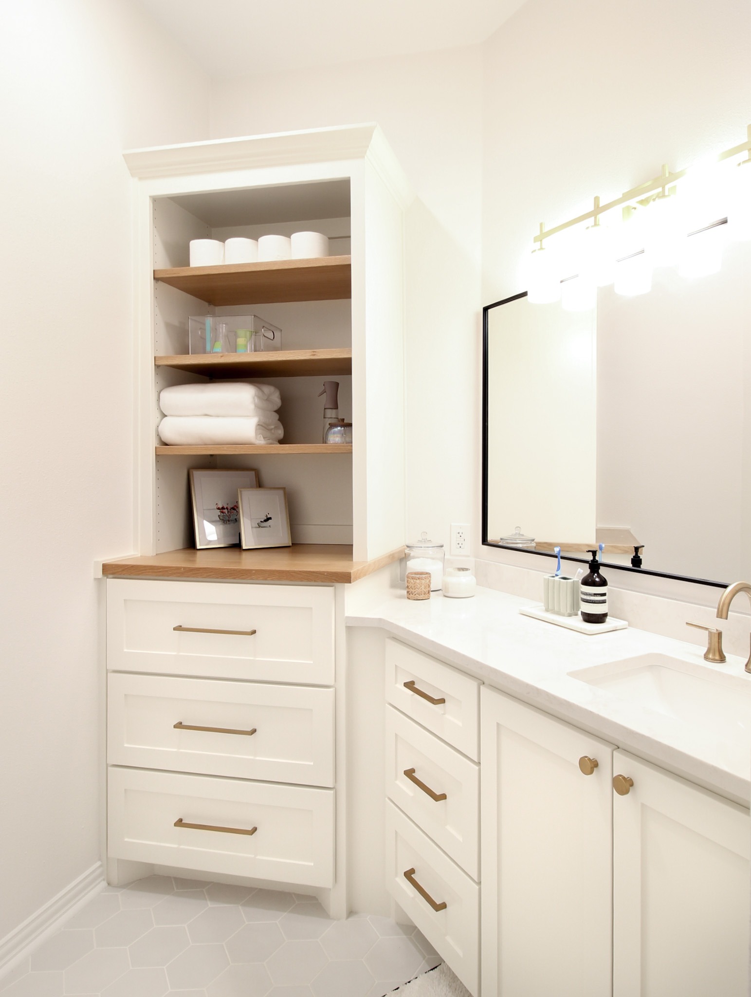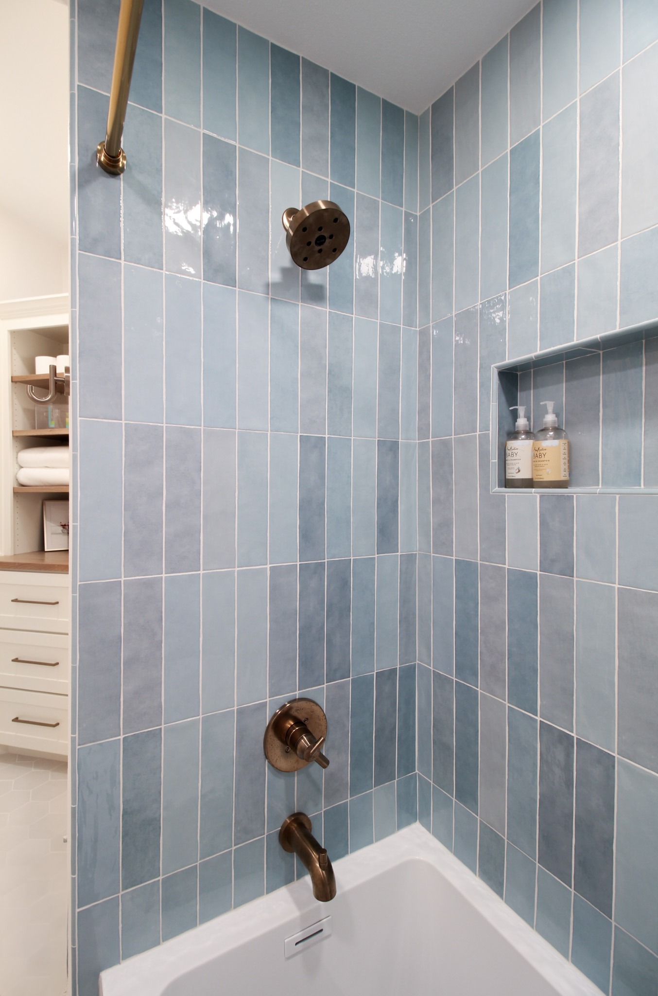 This family in Bedford was ready to improve their dark and outdated bathroom. Because this space was shared by two young children, they decided to transform the space into something bright, fun, and more age-appropriate. The loud, beige wallpaper was the first thing to go. We replaced tile floors, created a custom cabinet configuration for the angled wall, and installed quartz countertops. The new shower tile wraps around the toilet area and into the shampoo niche. We love the modern tile layout, gold fixtures, and natural wood accents in this room. The transformation is incredible!