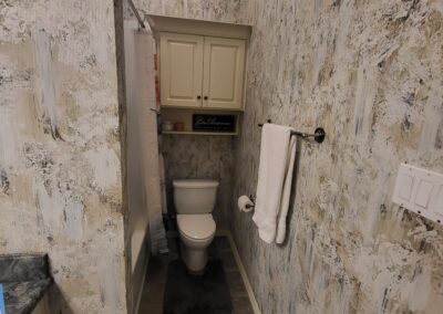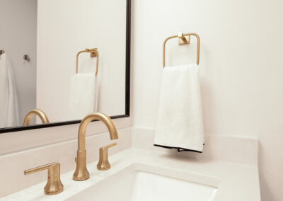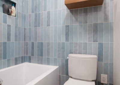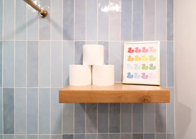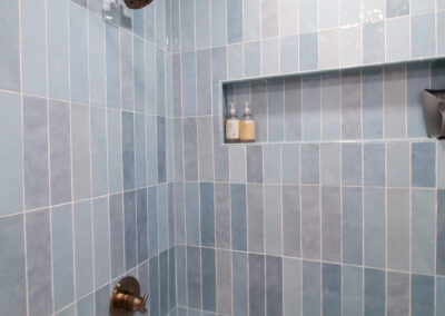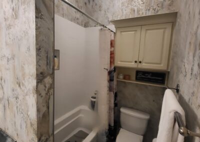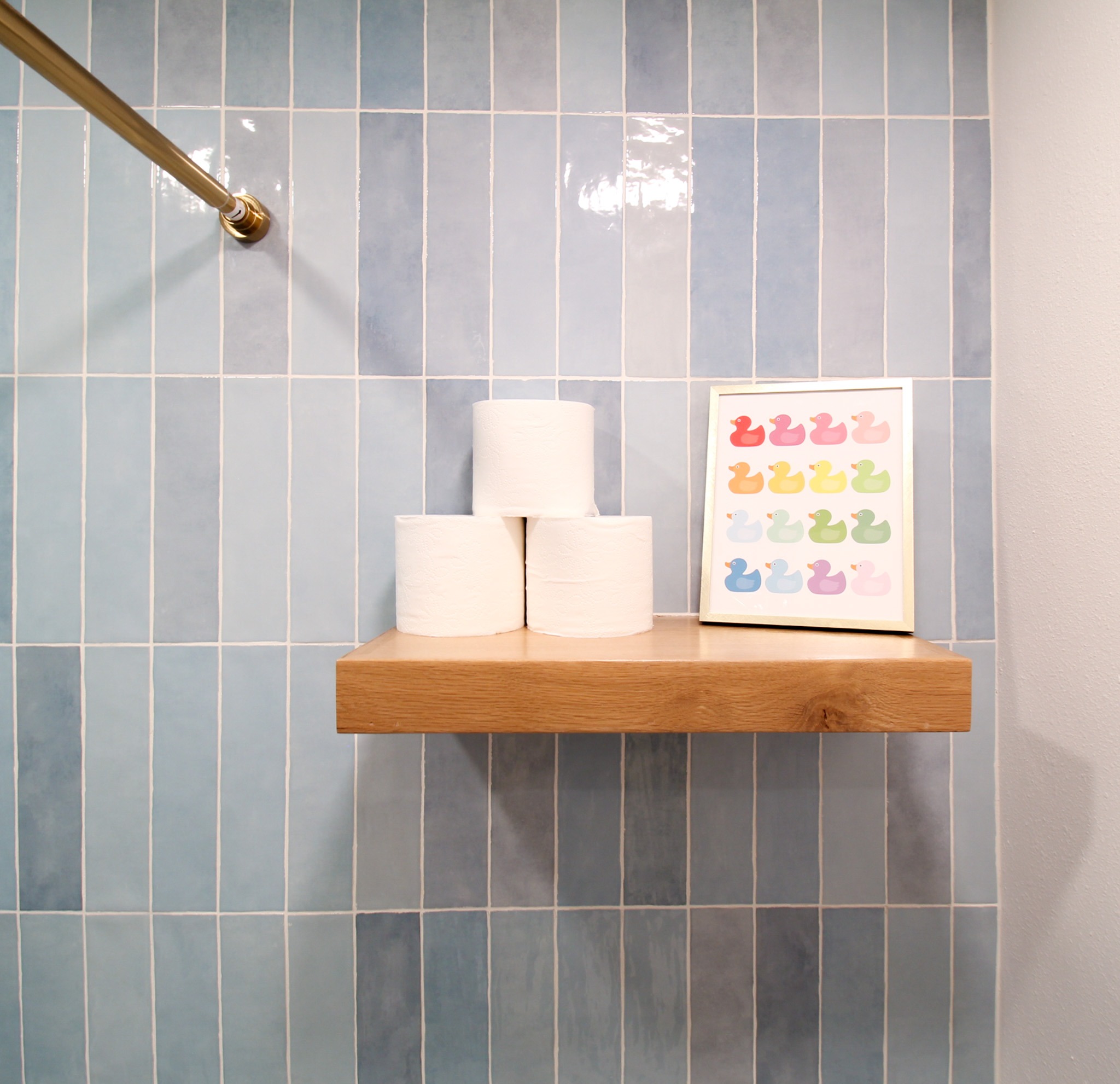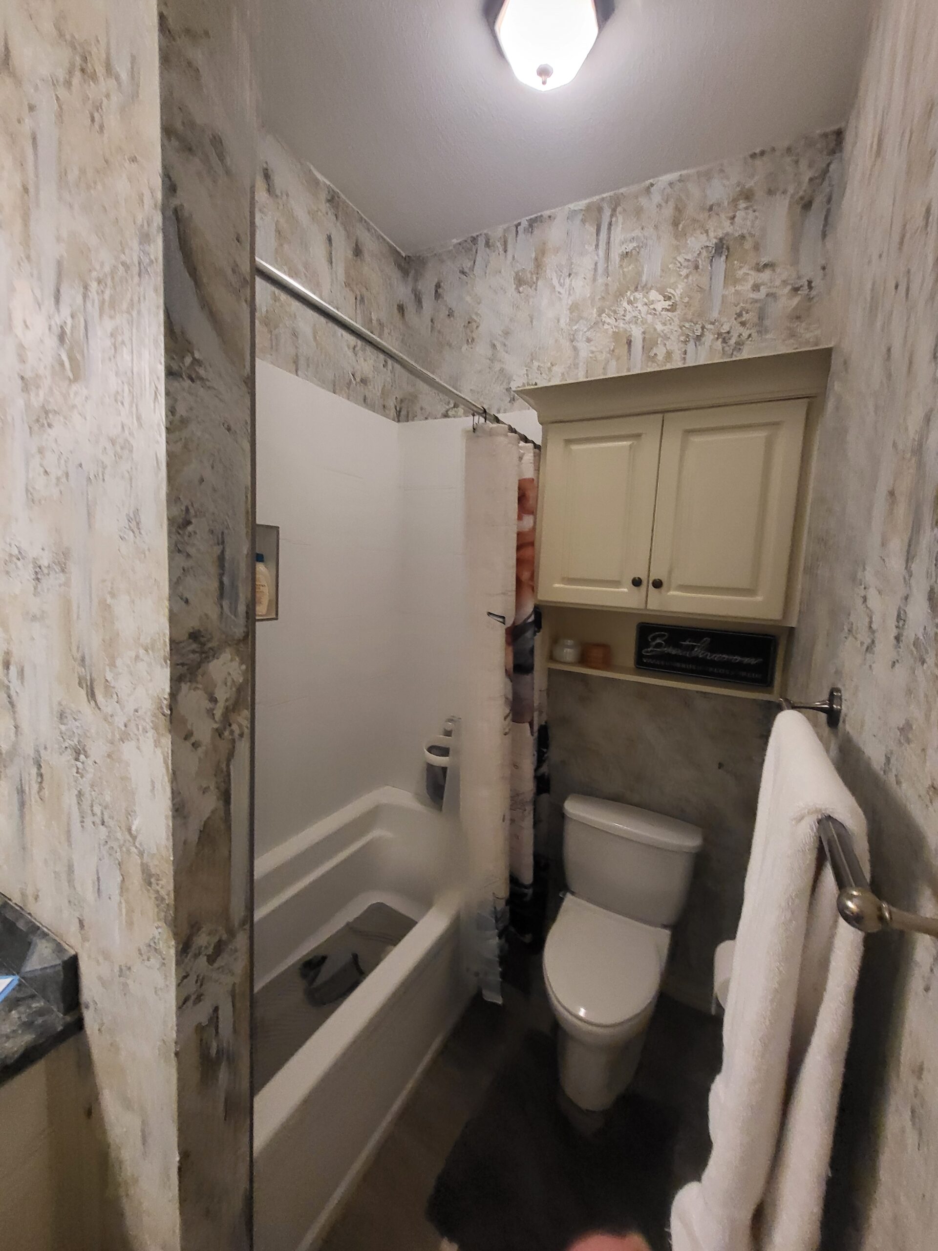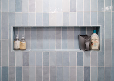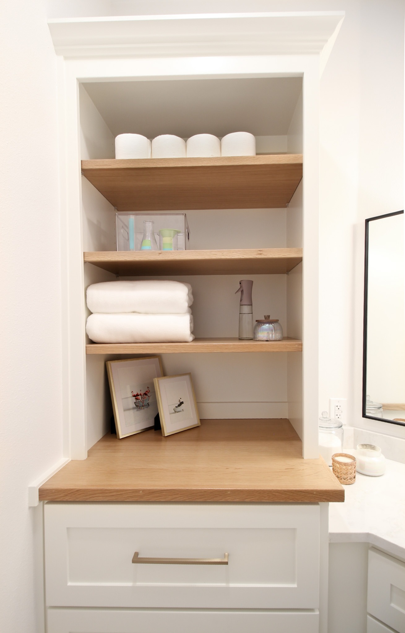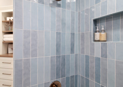 This family in Bedford was ready to improve their dark and outdated bathroom. Because this space was shared by two young children, they decided to transform the space into something bright, fun, and more age-appropriate. The loud, beige wallpaper was the first thing to go. We replaced tile floors, created a custom cabinet configuration for the angled wall, and installed quartz countertops. The new shower tile wraps around the toilet area and into the shampoo niche. We love the modern tile layout, gold fixtures, and natural wood accents in this room. The transformation is incredible!