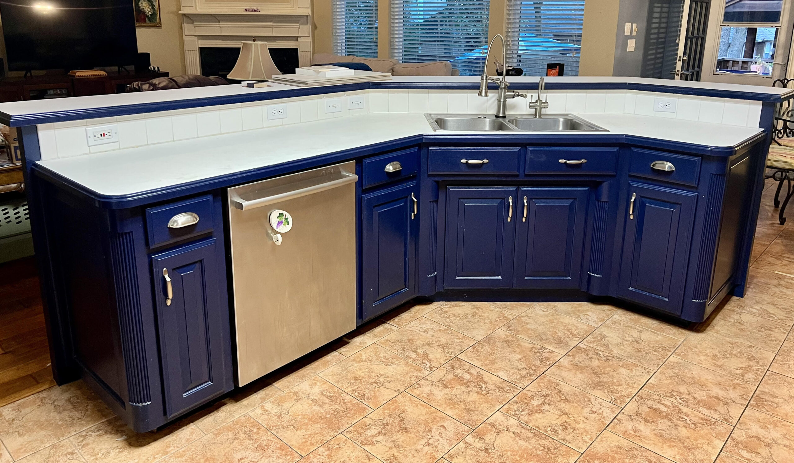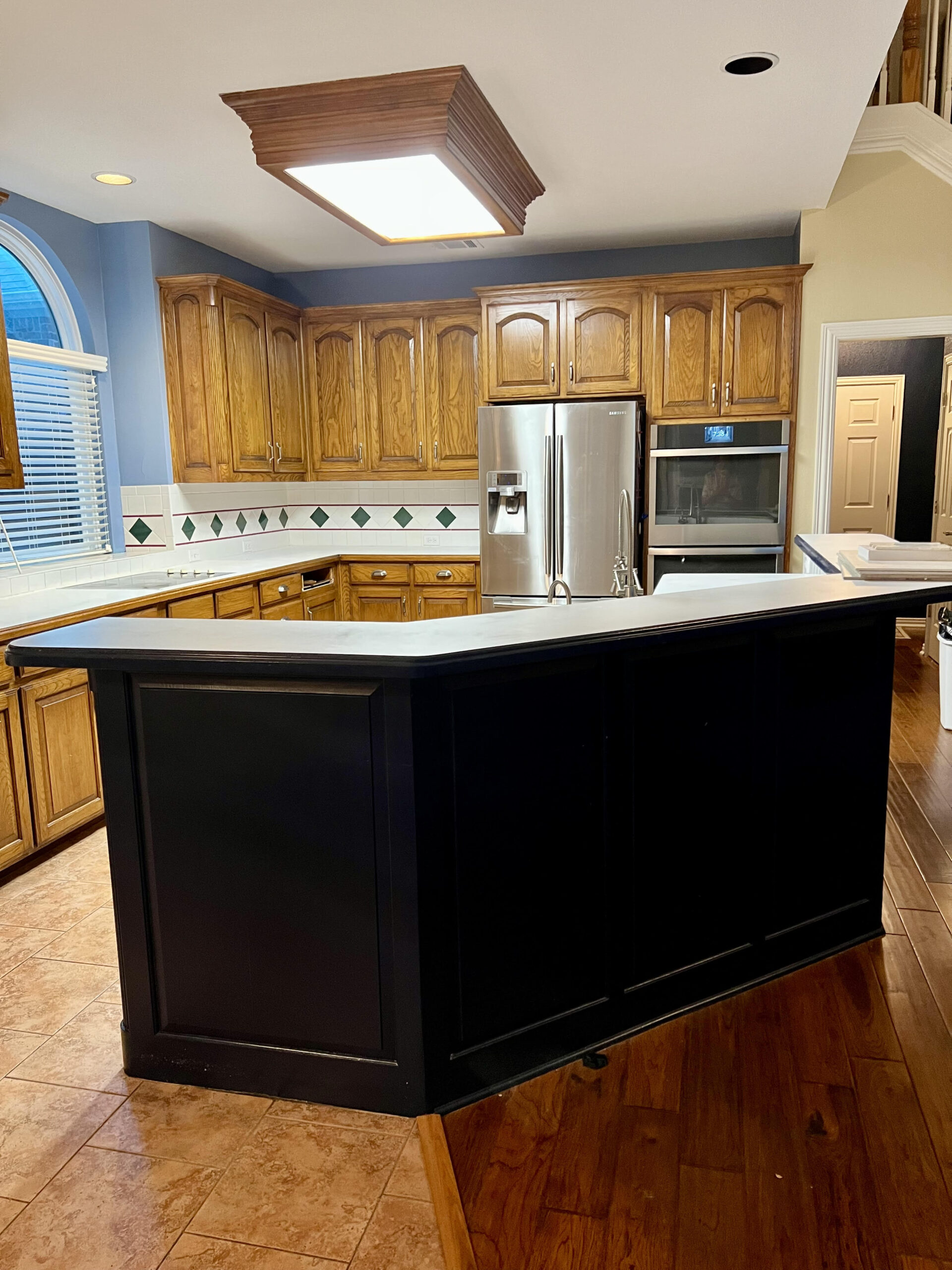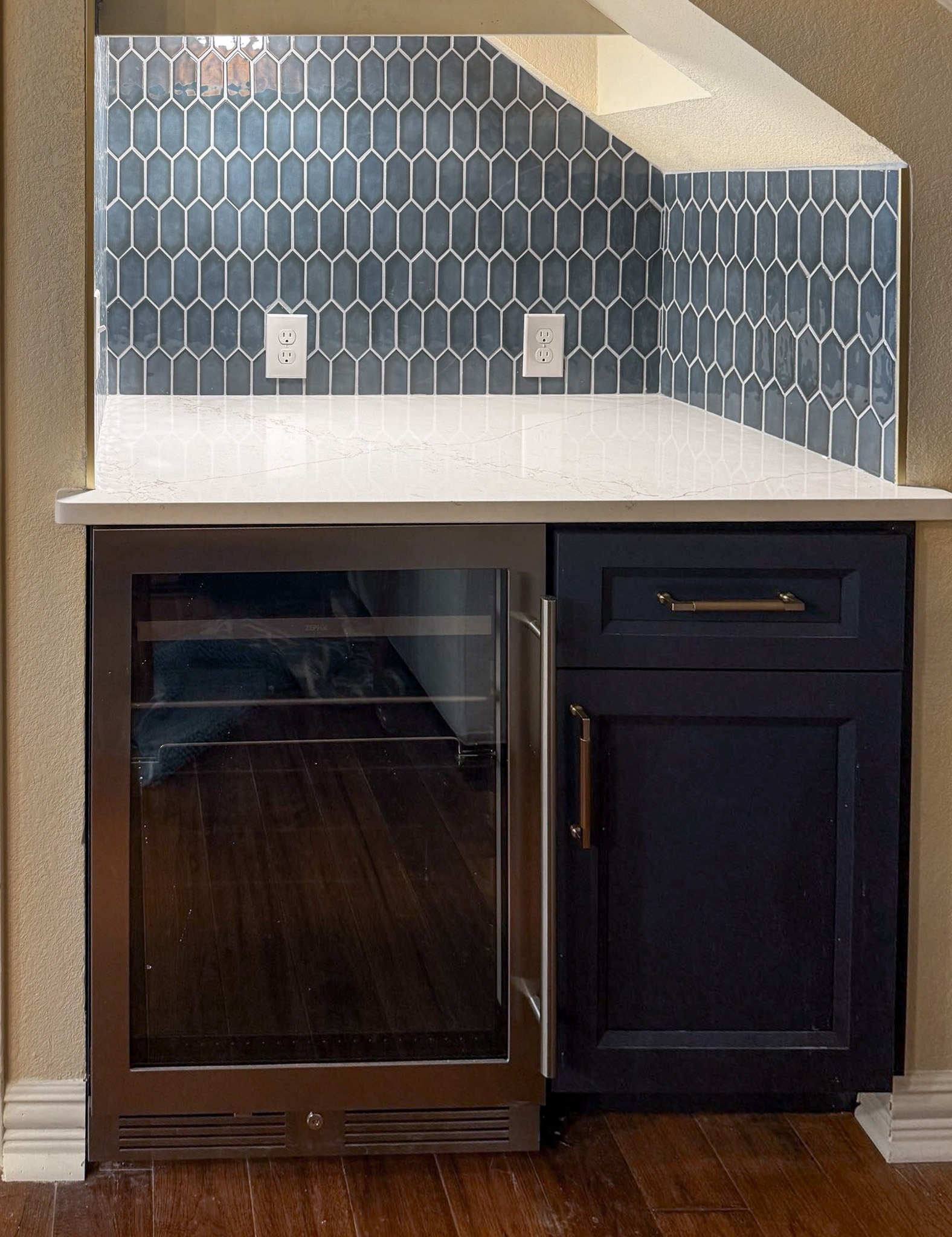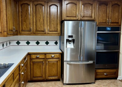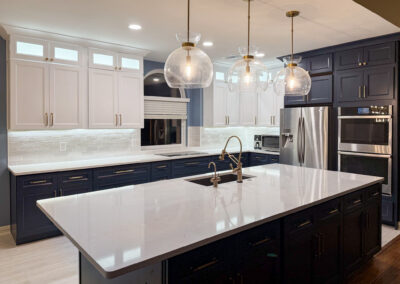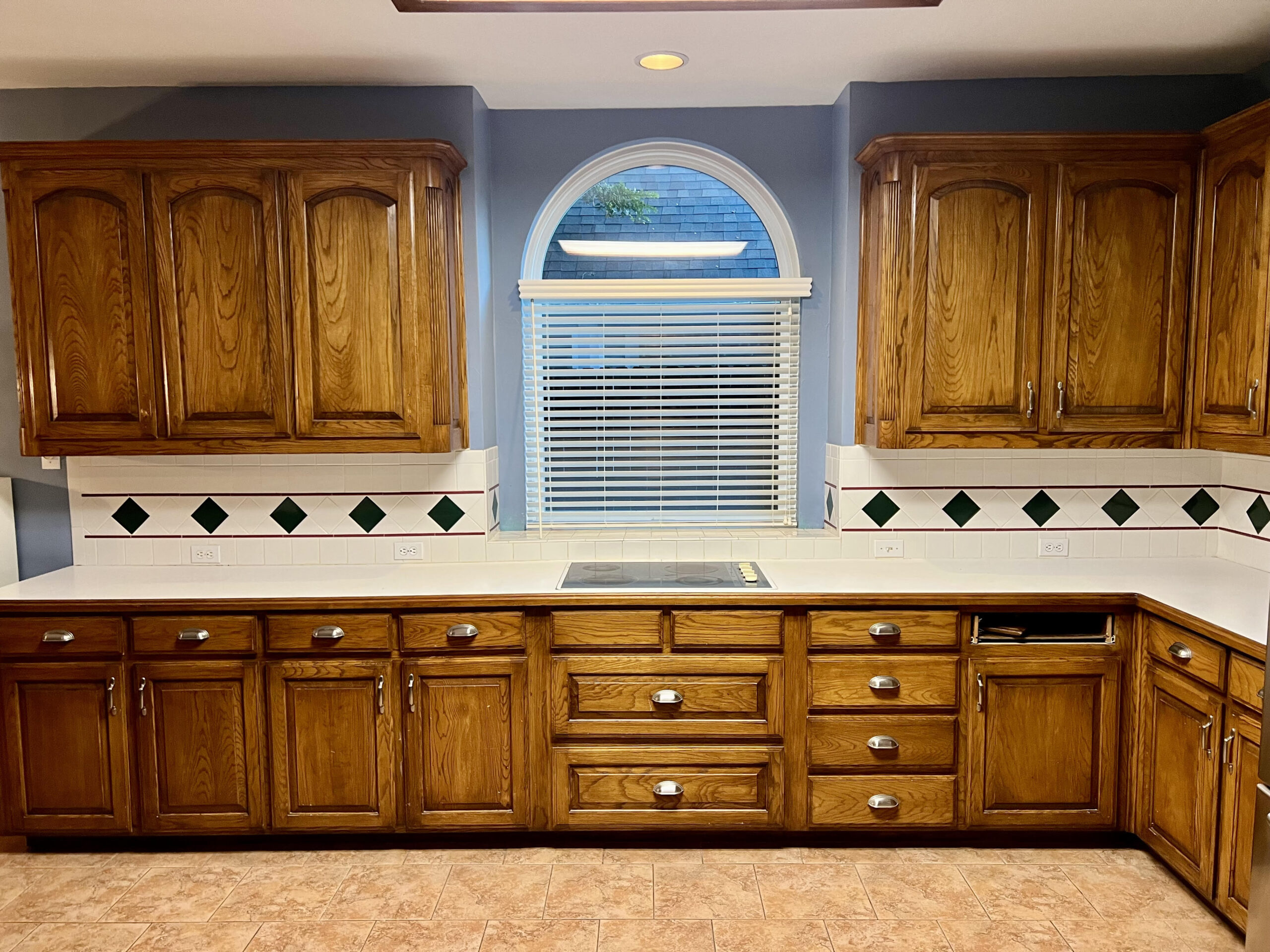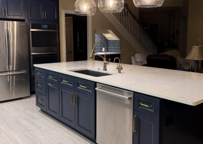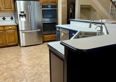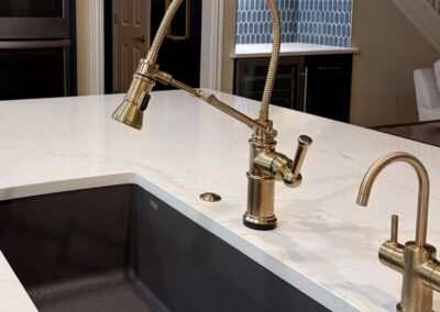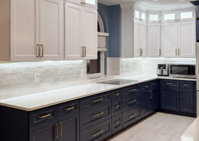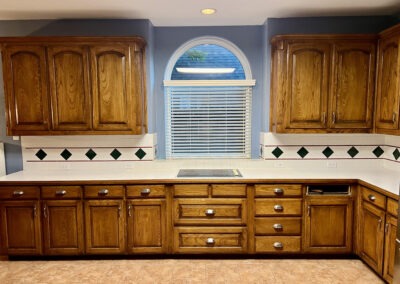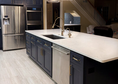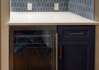 This kitchen in Bedford was showing its age, with the traditional-style cabinets, diamond tile and the multi-level island. We helped to transform this kitchen by replacing the tile floors and adding new, semi-custom cabinets, quartz countertops, and a zellige tile backsplash. This project included a small beverage center off of the living room where we installed a fun accent tile. We think that the changes in this kitchen helped it feel much brighter and more modern.