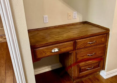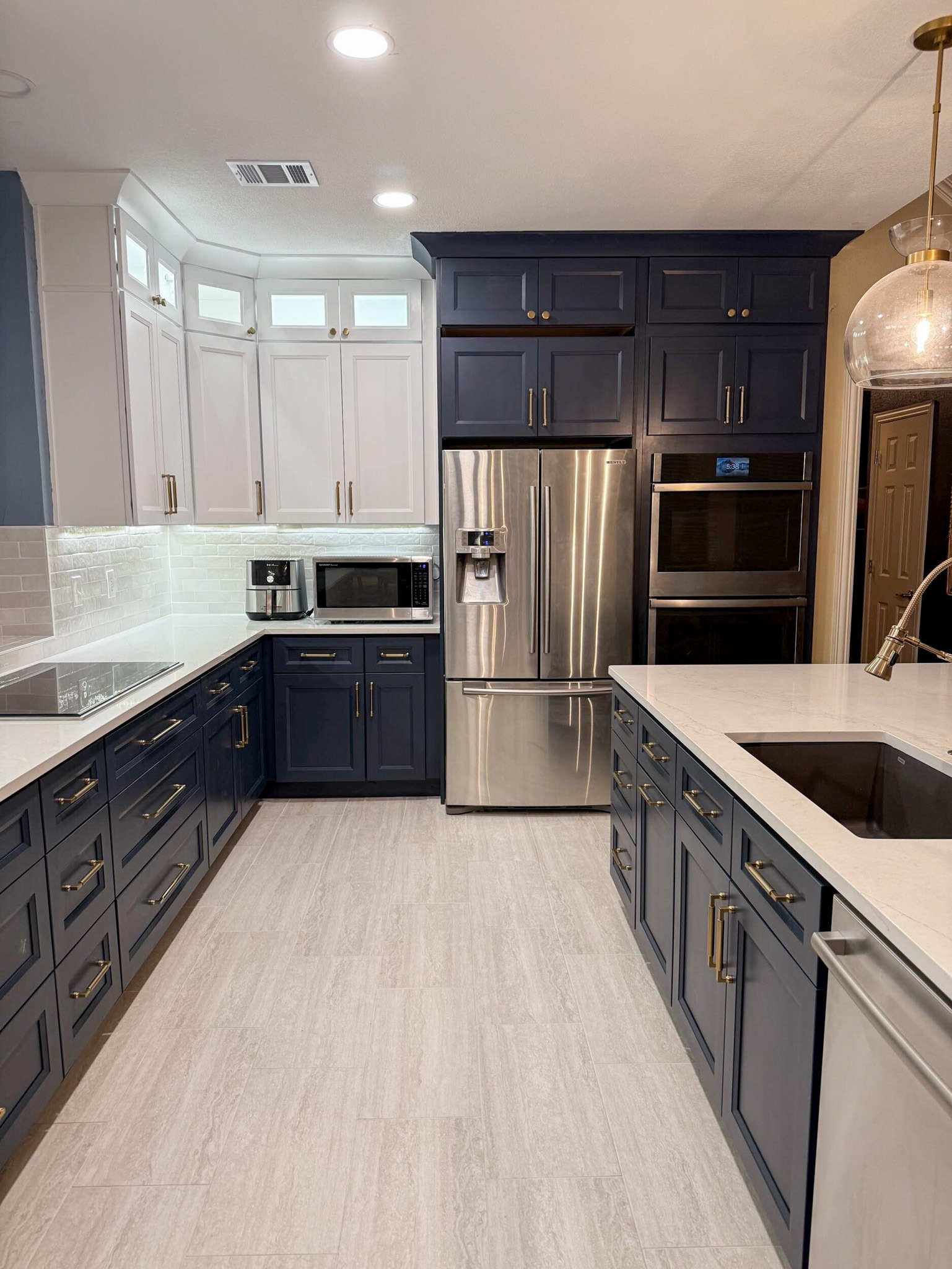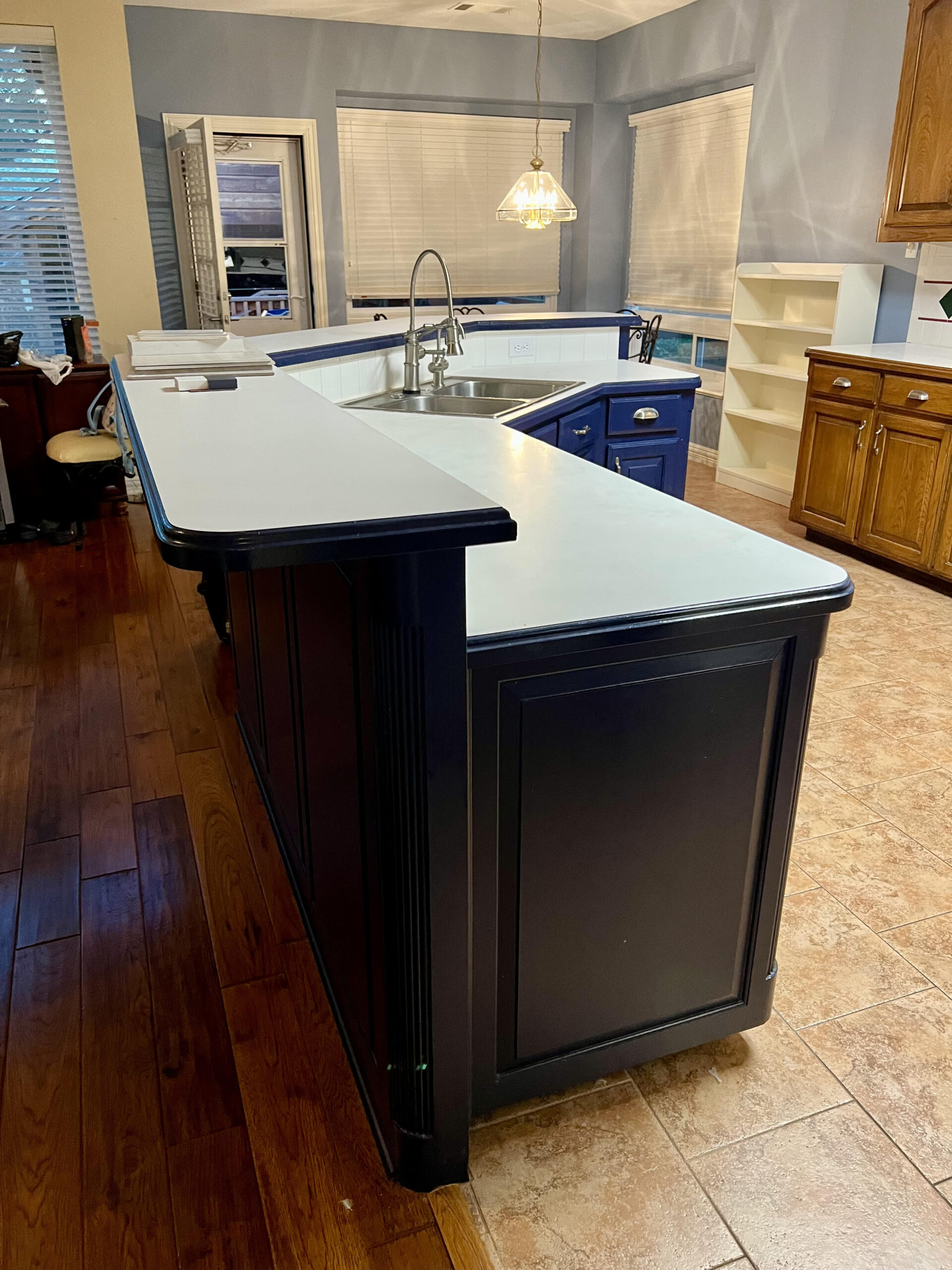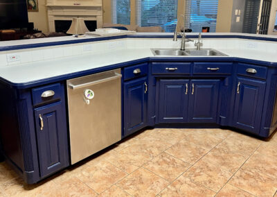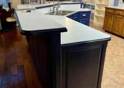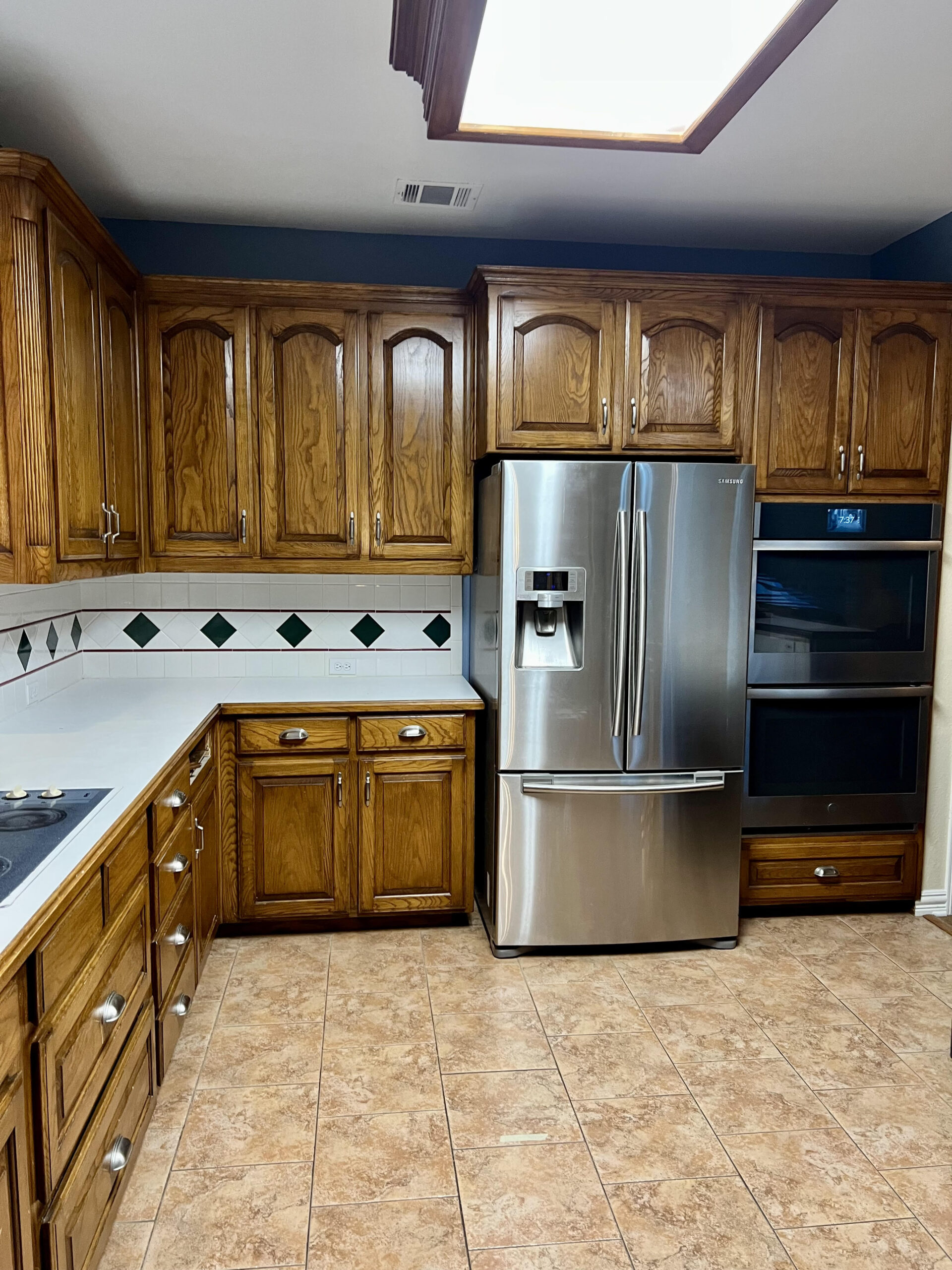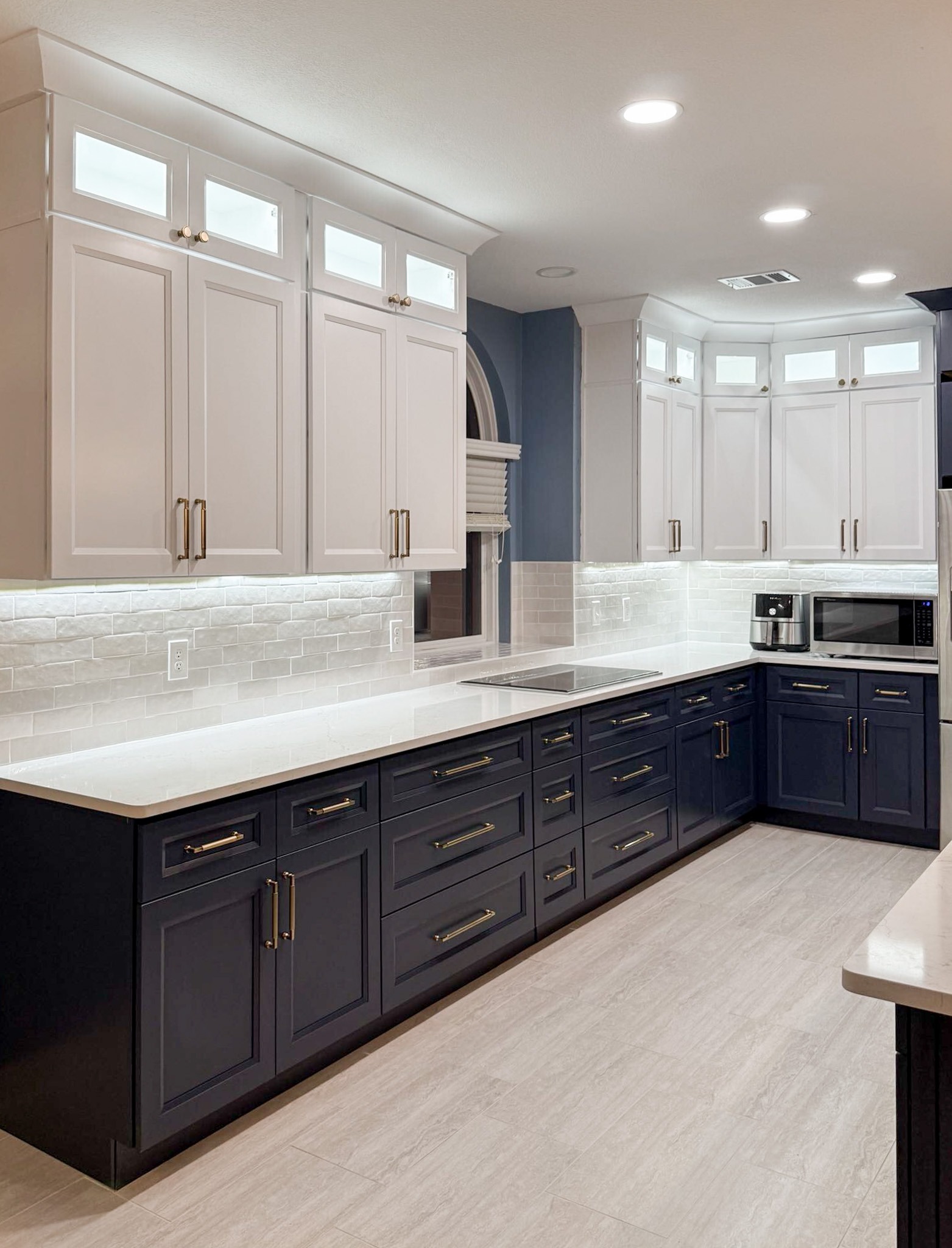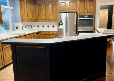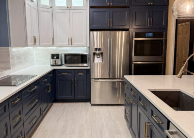 This kitchen in Bedford was showing its age, with the traditional-style cabinets, diamond tile and the multi-level island. We helped to transform this kitchen by replacing the tile floors and adding new, semi-custom cabinets, quartz countertops, and a zellige tile backsplash. This project included a small beverage center off of the living room where we installed a fun accent tile. We think that the changes in this kitchen helped it feel much brighter and more modern.