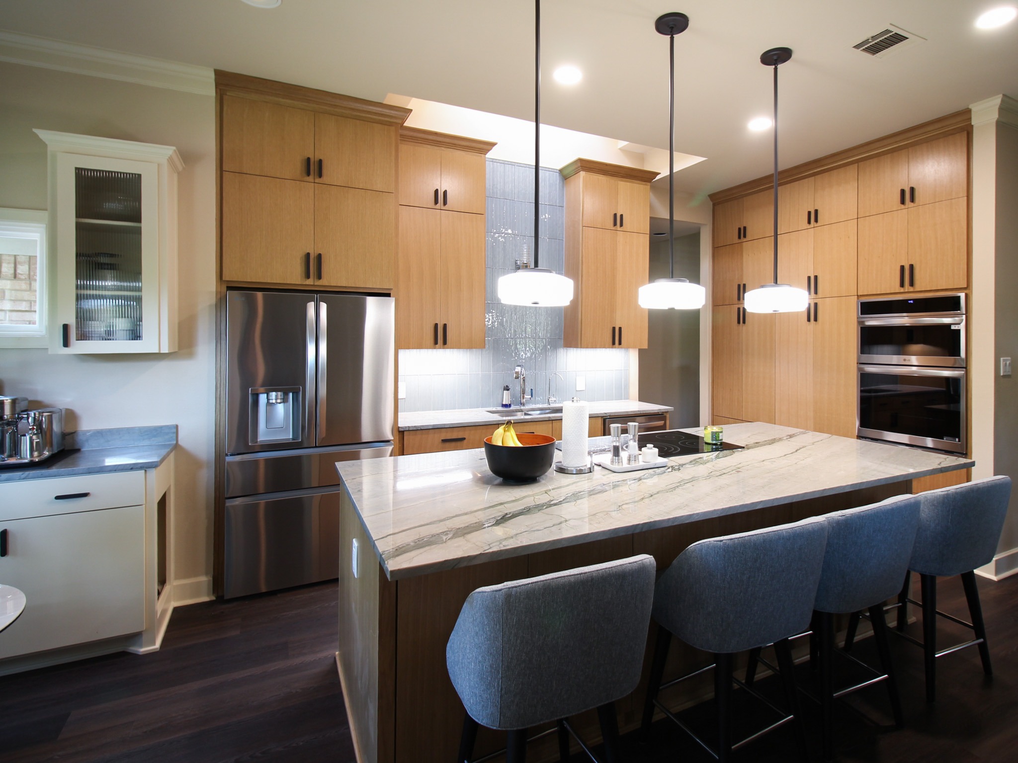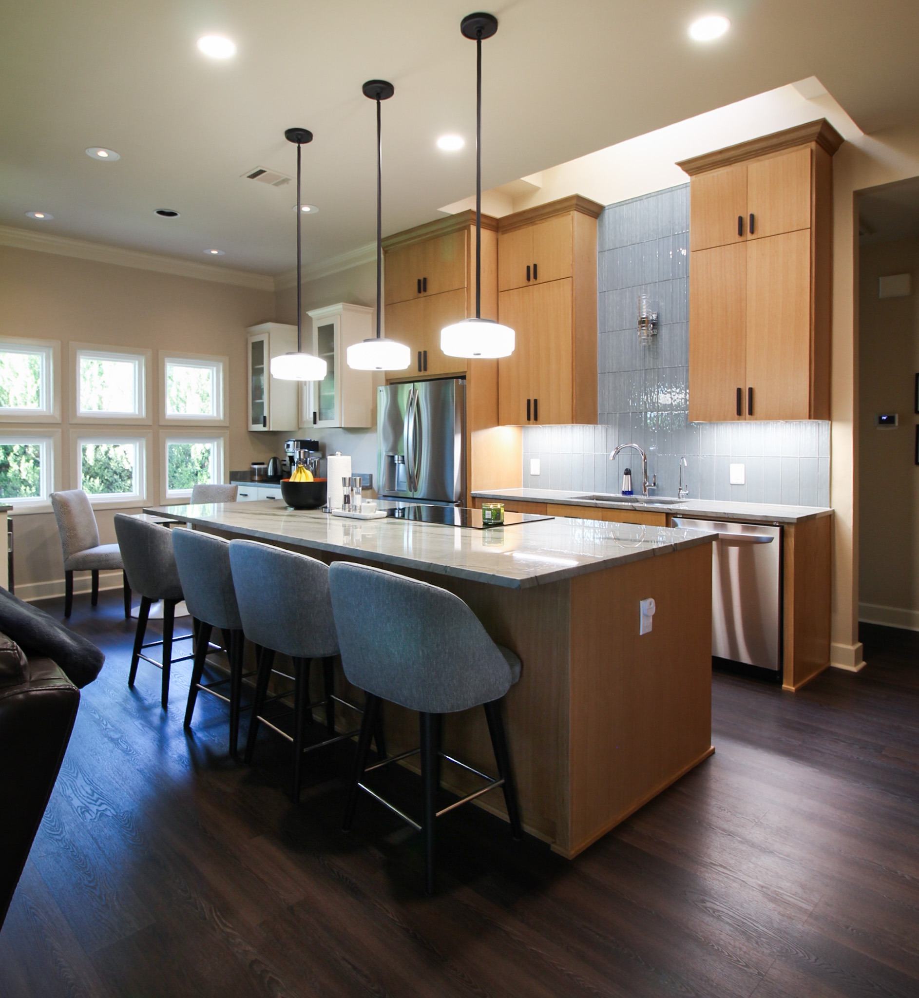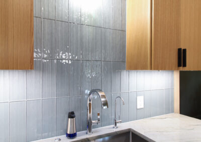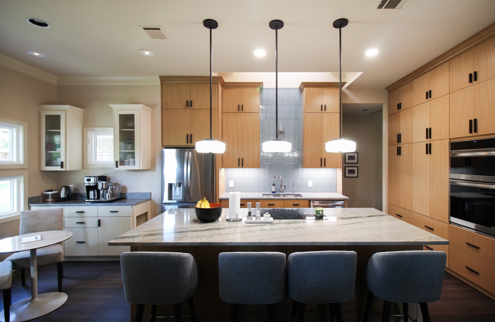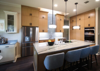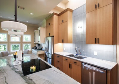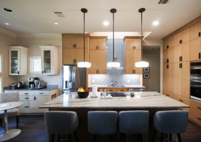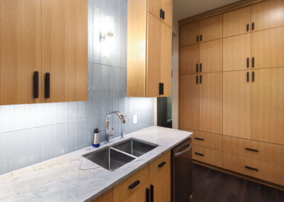 These clients love the mid-century modern style and thought that it would complement the unique, square windows. With help from our in-house designer, they decided on flat front, white oak cabinets with a natural finish. The natural wood cabinets and the glass tile backsplash pair perfectly with the ocean blue quartzite countertops (which might be the most beautiful countertops we’ve ever installed). Our team also installed LVP flooring throughout the home.
