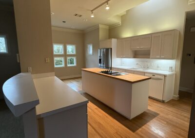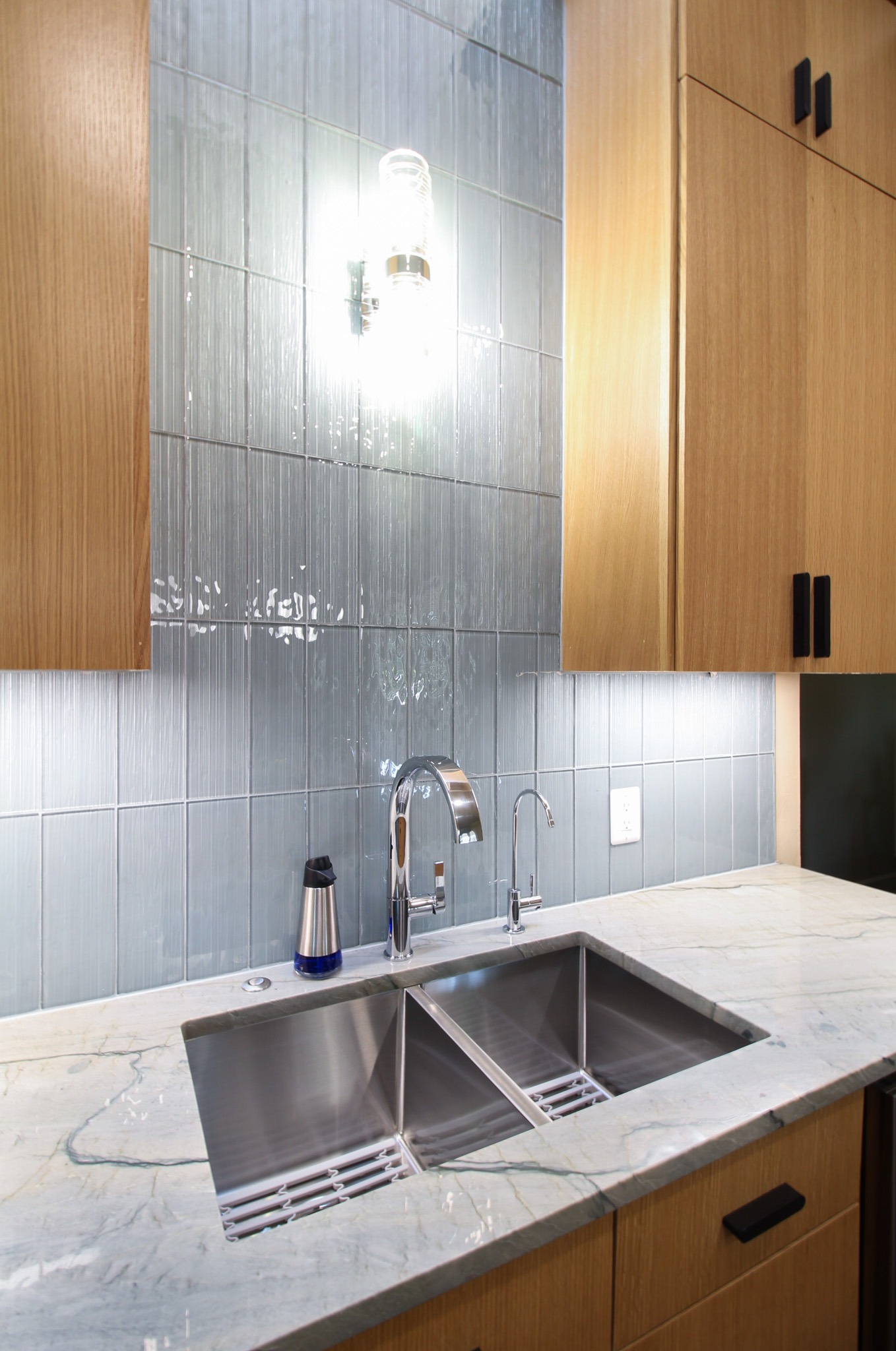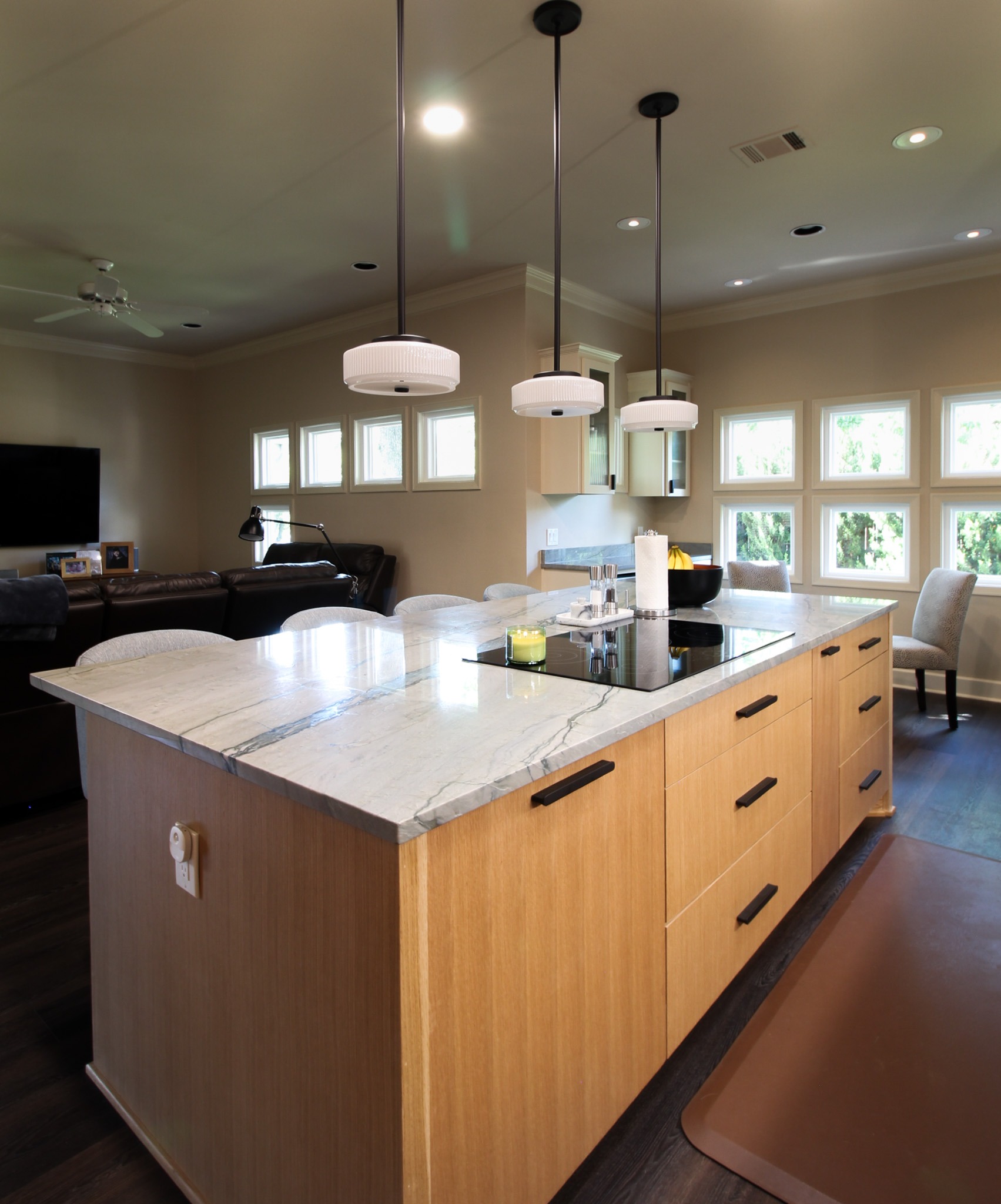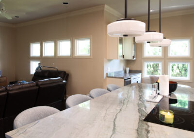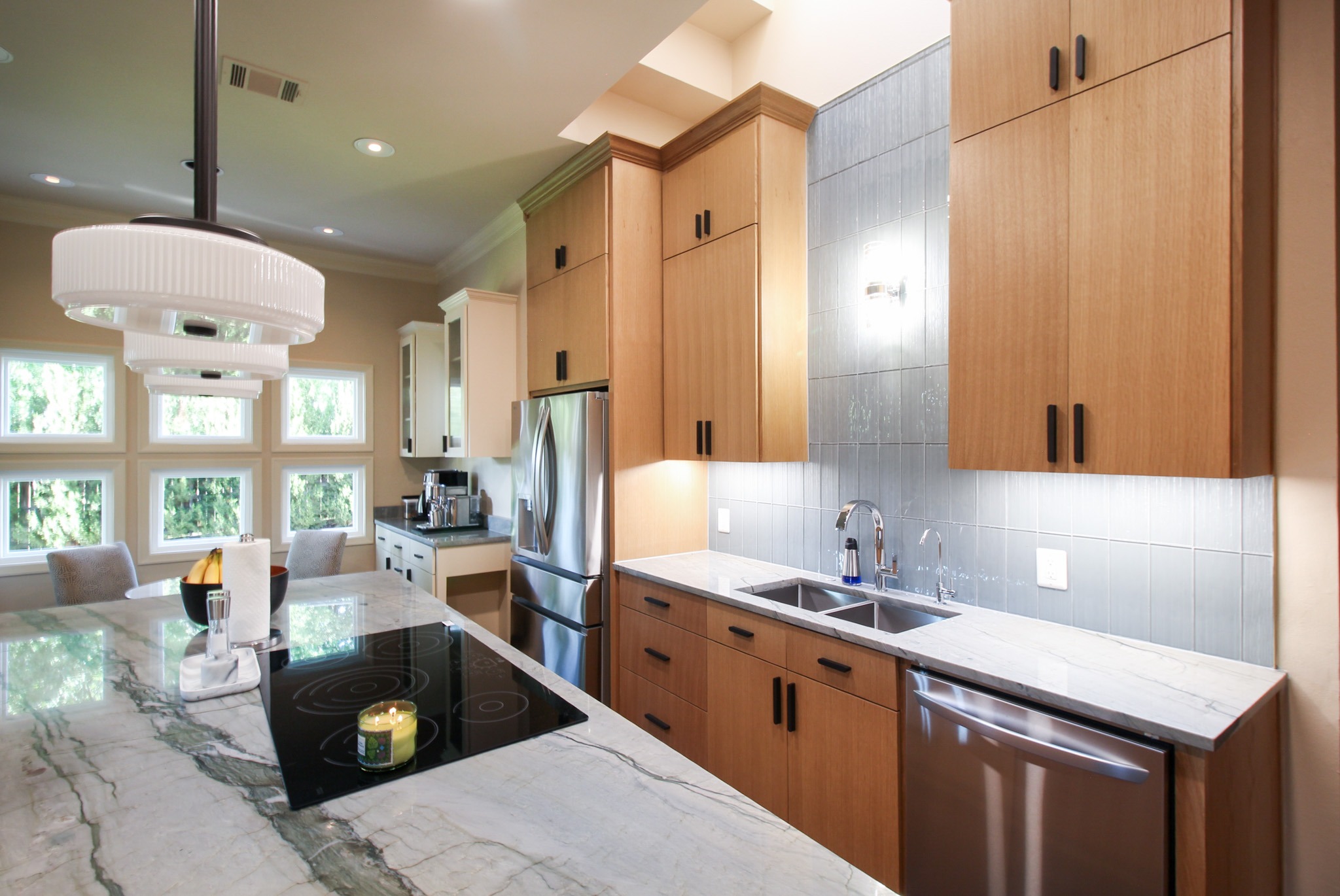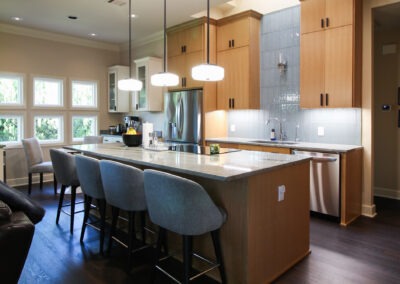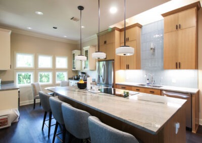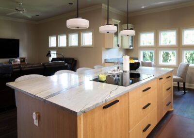 These clients love the mid-century modern style and thought that it would complement the unique, square windows. With help from our in-house designer, they decided on flat front, white oak cabinets with a natural finish. The natural wood cabinets and the glass tile backsplash pair perfectly with the ocean blue quartzite countertops (which might be the most beautiful countertops we’ve ever installed). Our team also installed LVP flooring throughout the home.