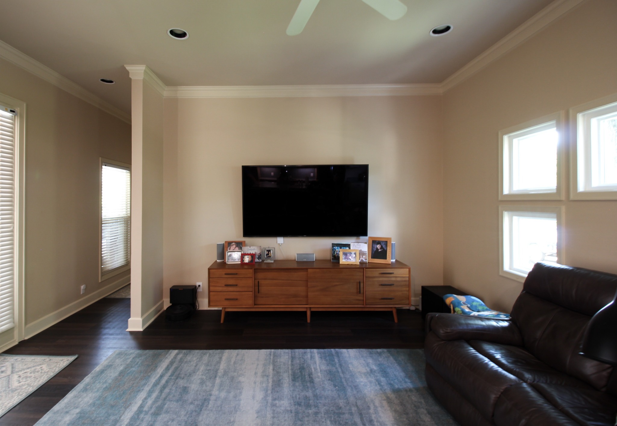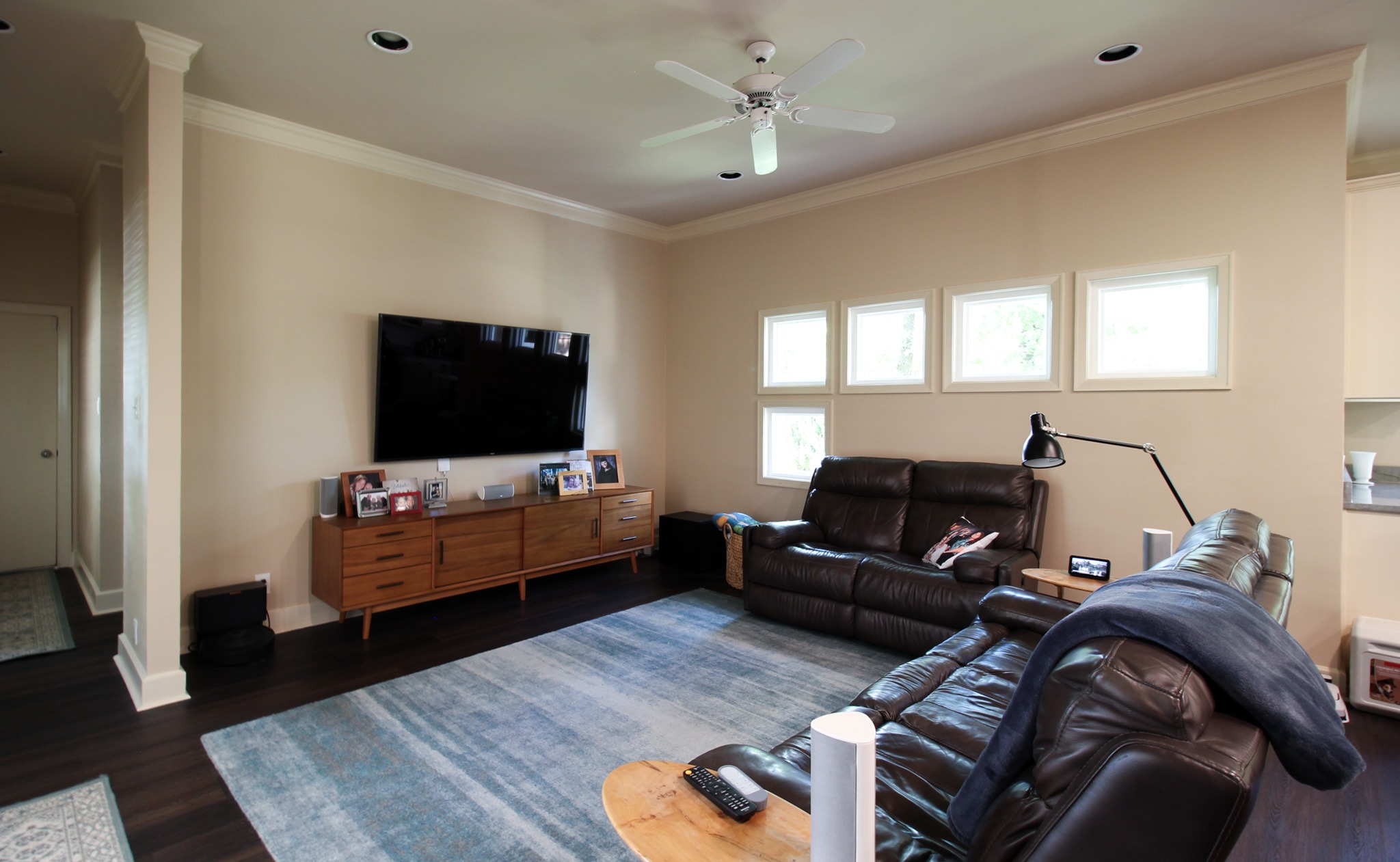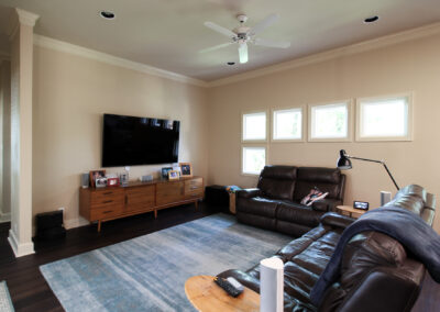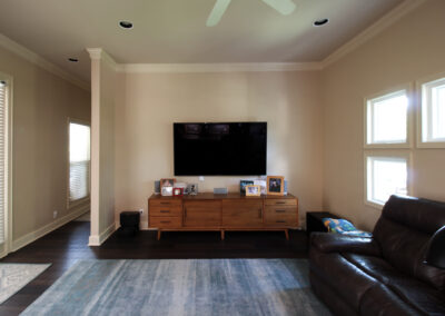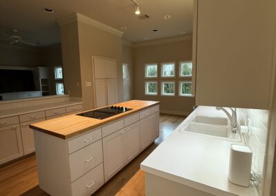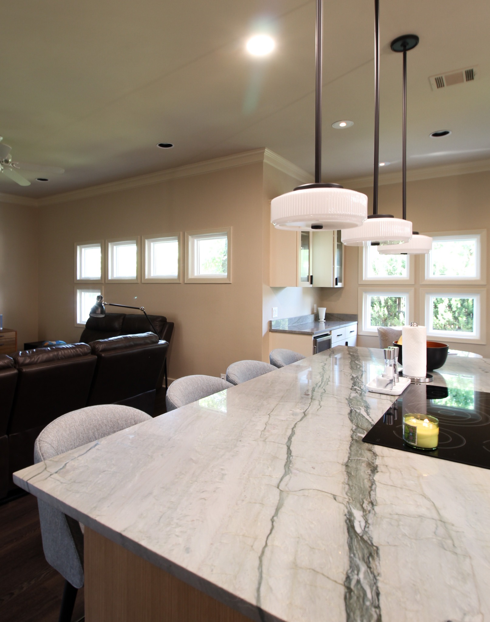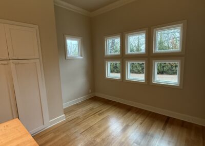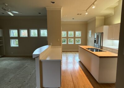 These clients love the mid-century modern style and thought that it would complement the unique, square windows. With help from our in-house designer, they decided on flat front, white oak cabinets with a natural finish. The natural wood cabinets and the glass tile backsplash pair perfectly with the ocean blue quartzite countertops (which might be the most beautiful countertops we’ve ever installed). Our team also installed LVP flooring throughout the home.