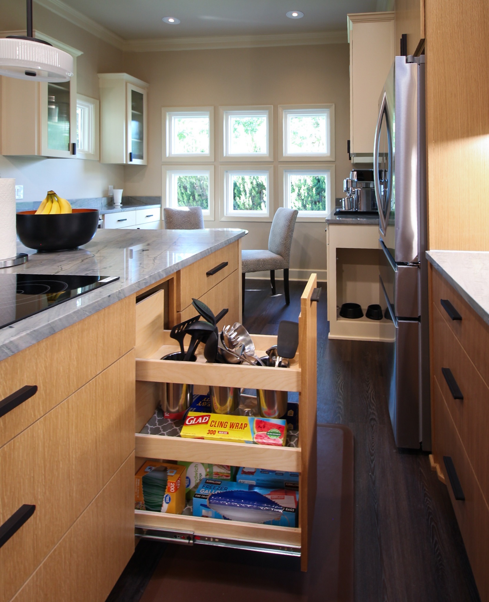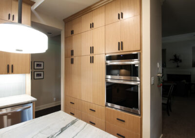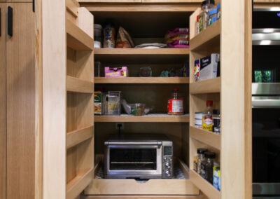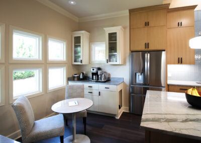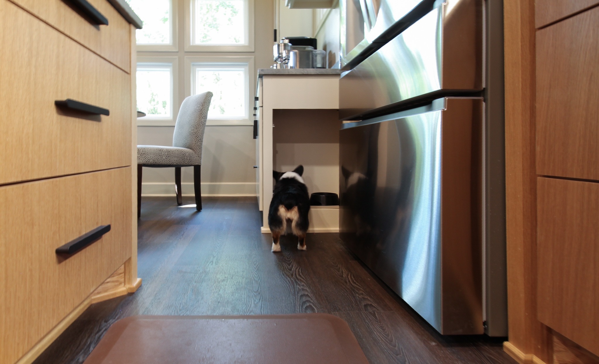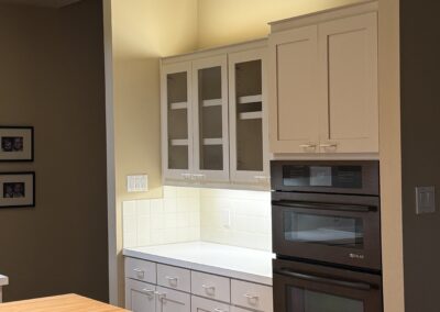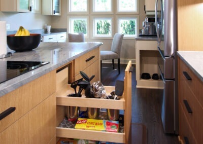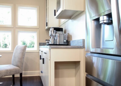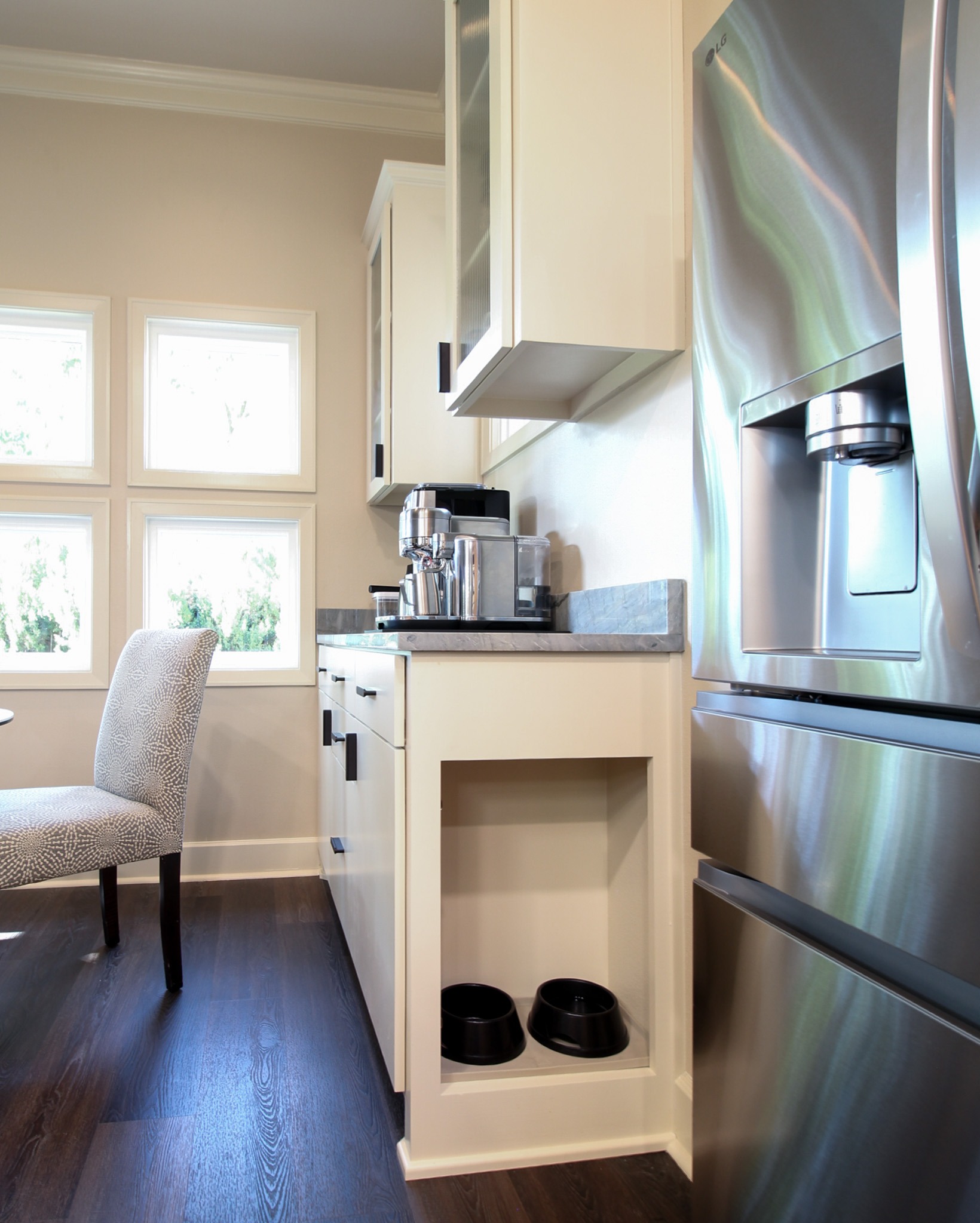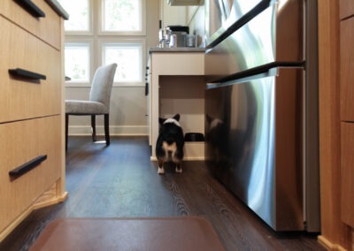 They started with our advanced design package and worked closely with our designers to create the perfect design. We removed the built-in pantry and the peninsual to extend the kitchen. Their island doubled in size and moved away from the sink, giving them a very comfortable walkway. The pantry was moved next to the wall oven, where our custom cabinet maker installed floor-to-ceiling built-ins with can shelves and roll-out trays. We also added painted cabinet storage to both sides of the breakfast nook, which our clients now use as beverage centers. These cabinets also have a hidden nook where their corgi, Lilly, can eat comfortably and out of the way.