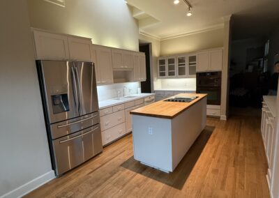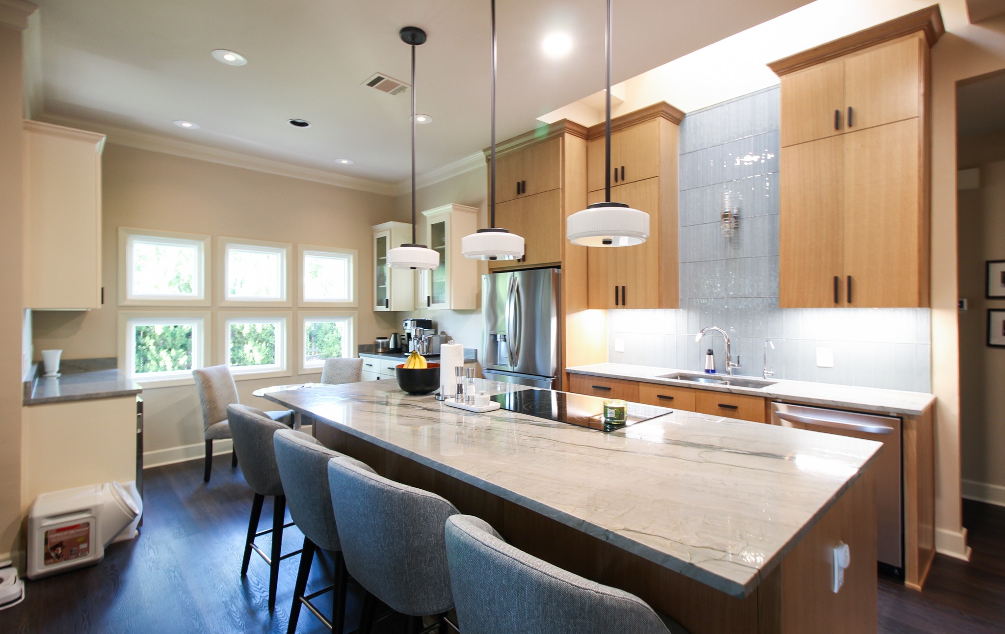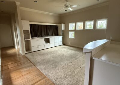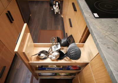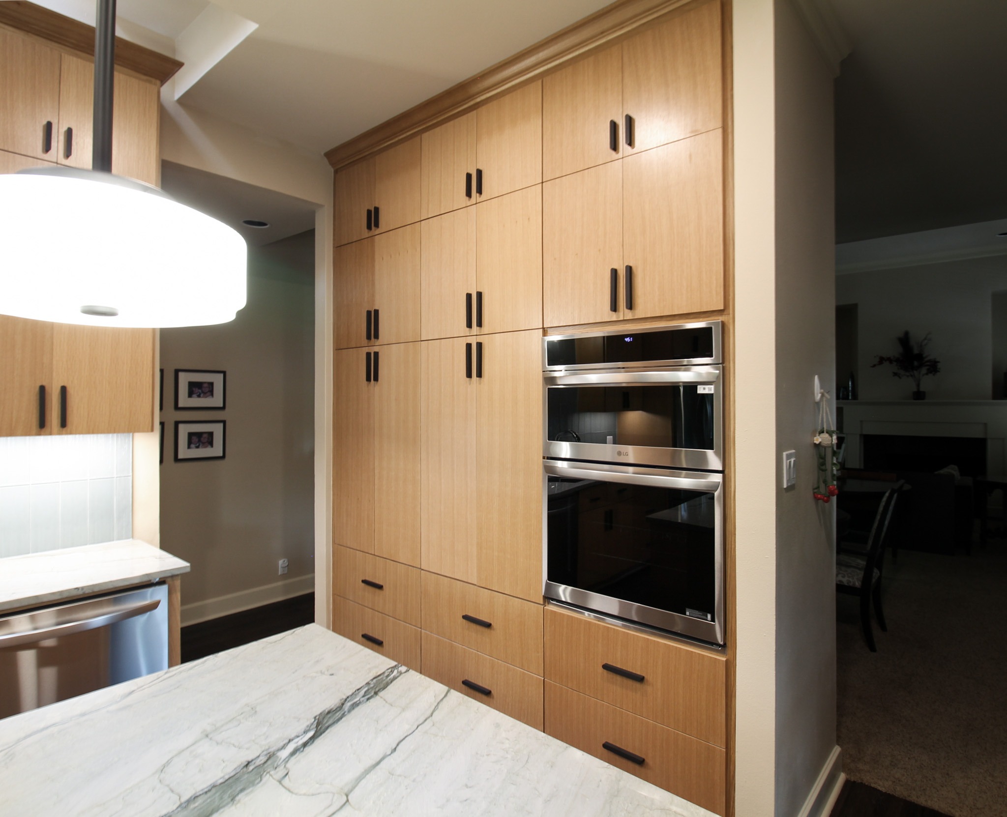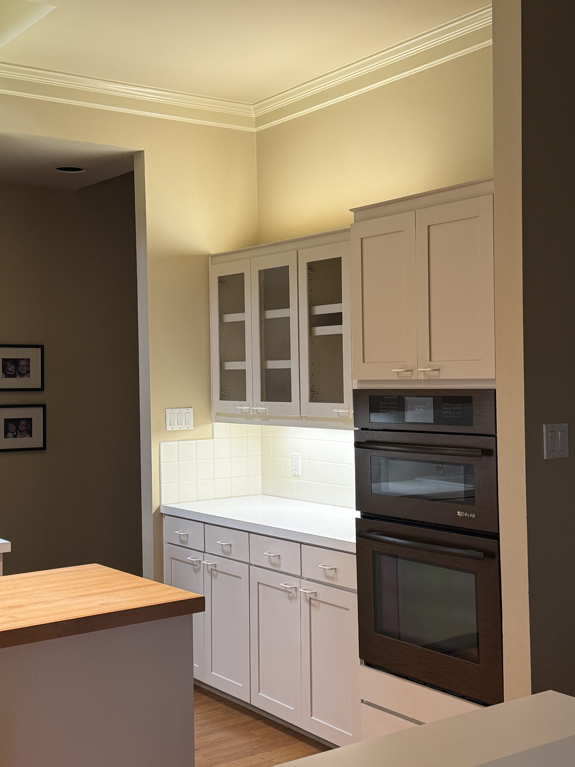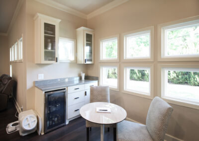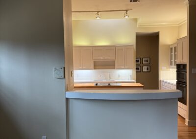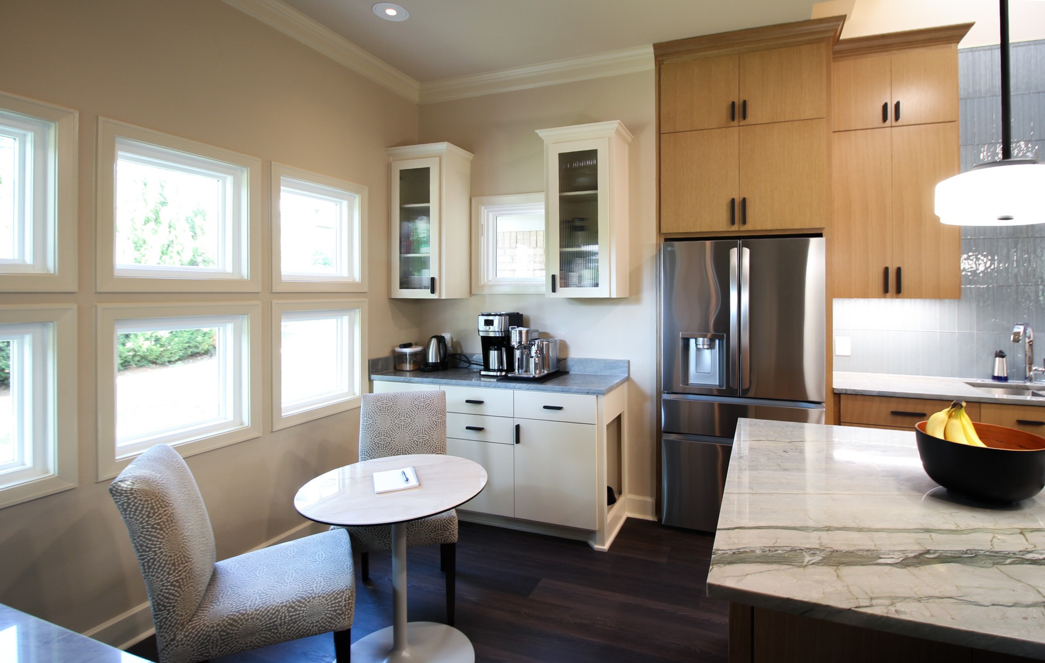 They started with our advanced design package and worked closely with our designers to create the perfect design. We removed the built-in pantry and the peninsual to extend the kitchen. Their island doubled in size and moved away from the sink, giving them a very comfortable walkway. The pantry was moved next to the wall oven, where our custom cabinet maker installed floor-to-ceiling built-ins with can shelves and roll-out trays. We also added painted cabinet storage to both sides of the breakfast nook, which our clients now use as beverage centers. These cabinets also have a hidden nook where their corgi, Lilly, can eat comfortably and out of the way.