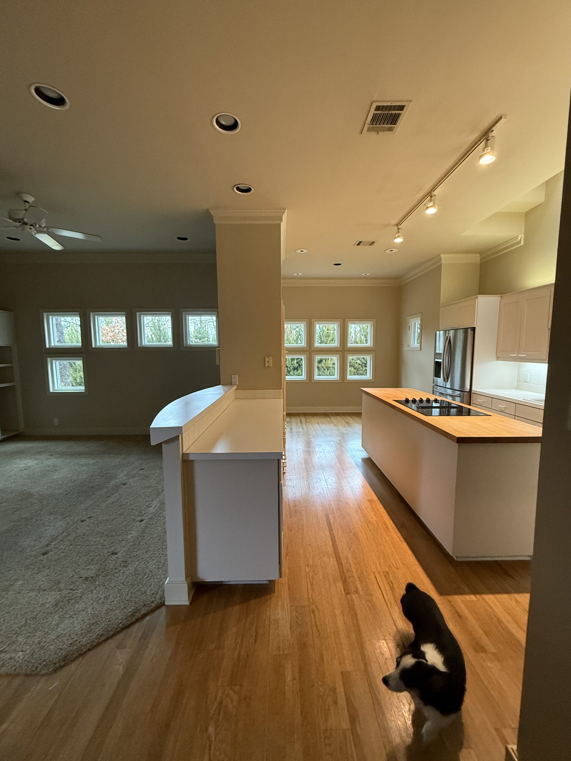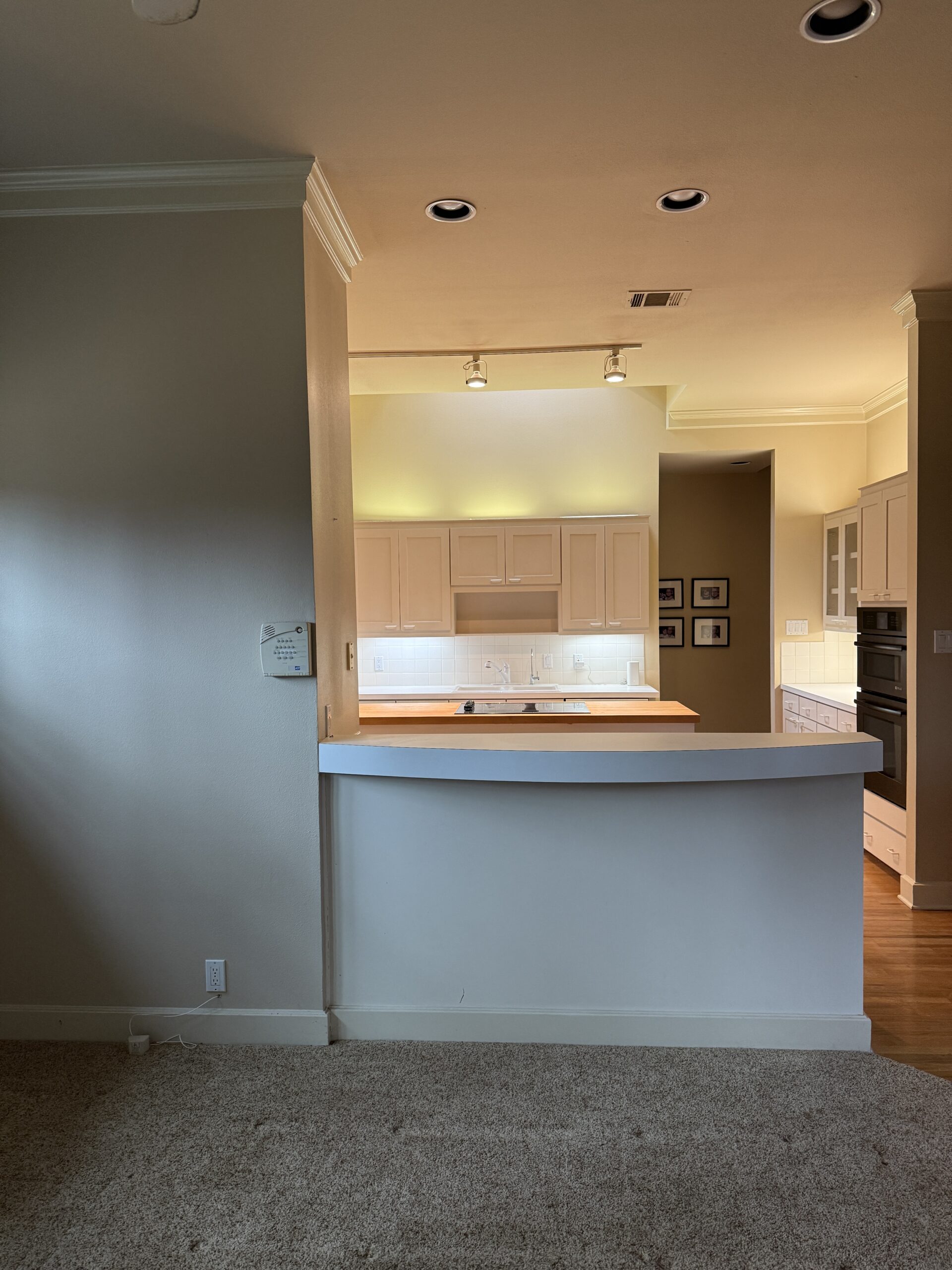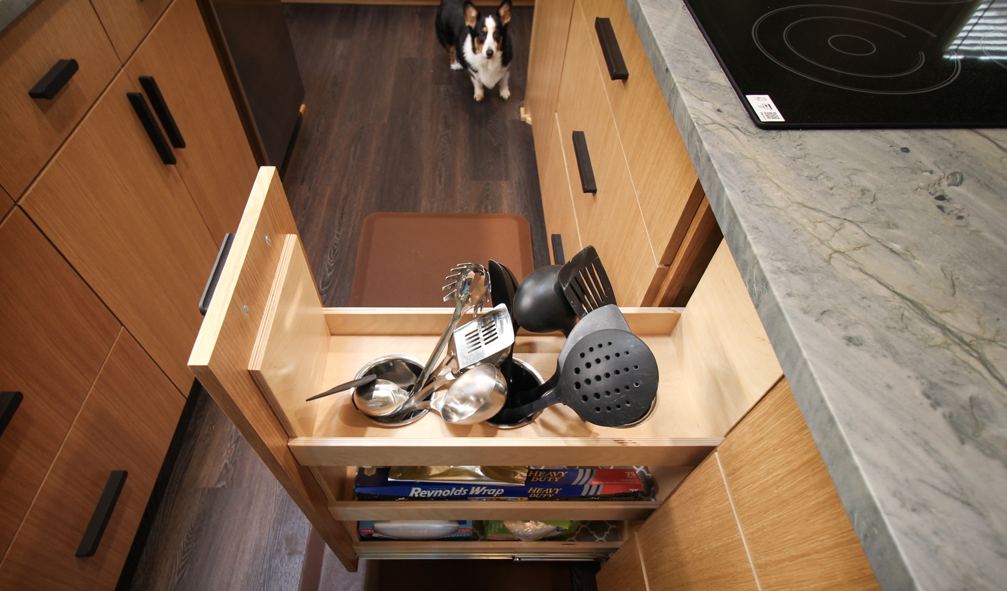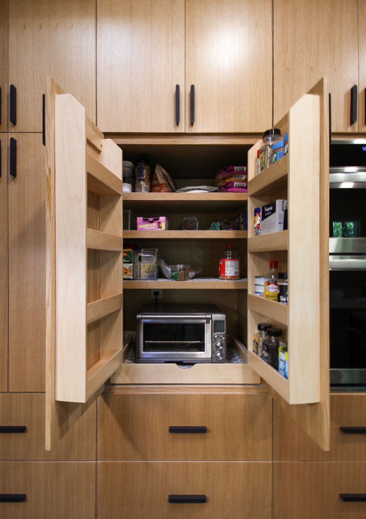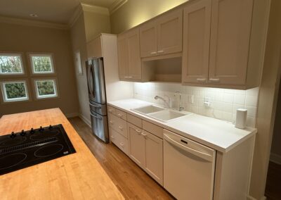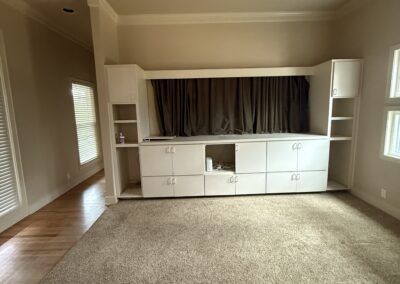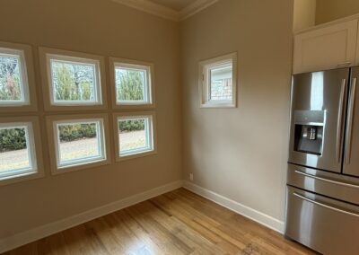 They started with our advanced design package and worked closely with our designers to create the perfect design. We removed the built-in pantry and the peninsual to extend the kitchen. Their island doubled in size and moved away from the sink, giving them a very comfortable walkway. The pantry was moved next to the wall oven, where our custom cabinet maker installed floor-to-ceiling built-ins with can shelves and roll-out trays. We also added painted cabinet storage to both sides of the breakfast nook, which our clients now use as beverage centers. These cabinets also have a hidden nook where their corgi, Lilly, can eat comfortably and out of the way.