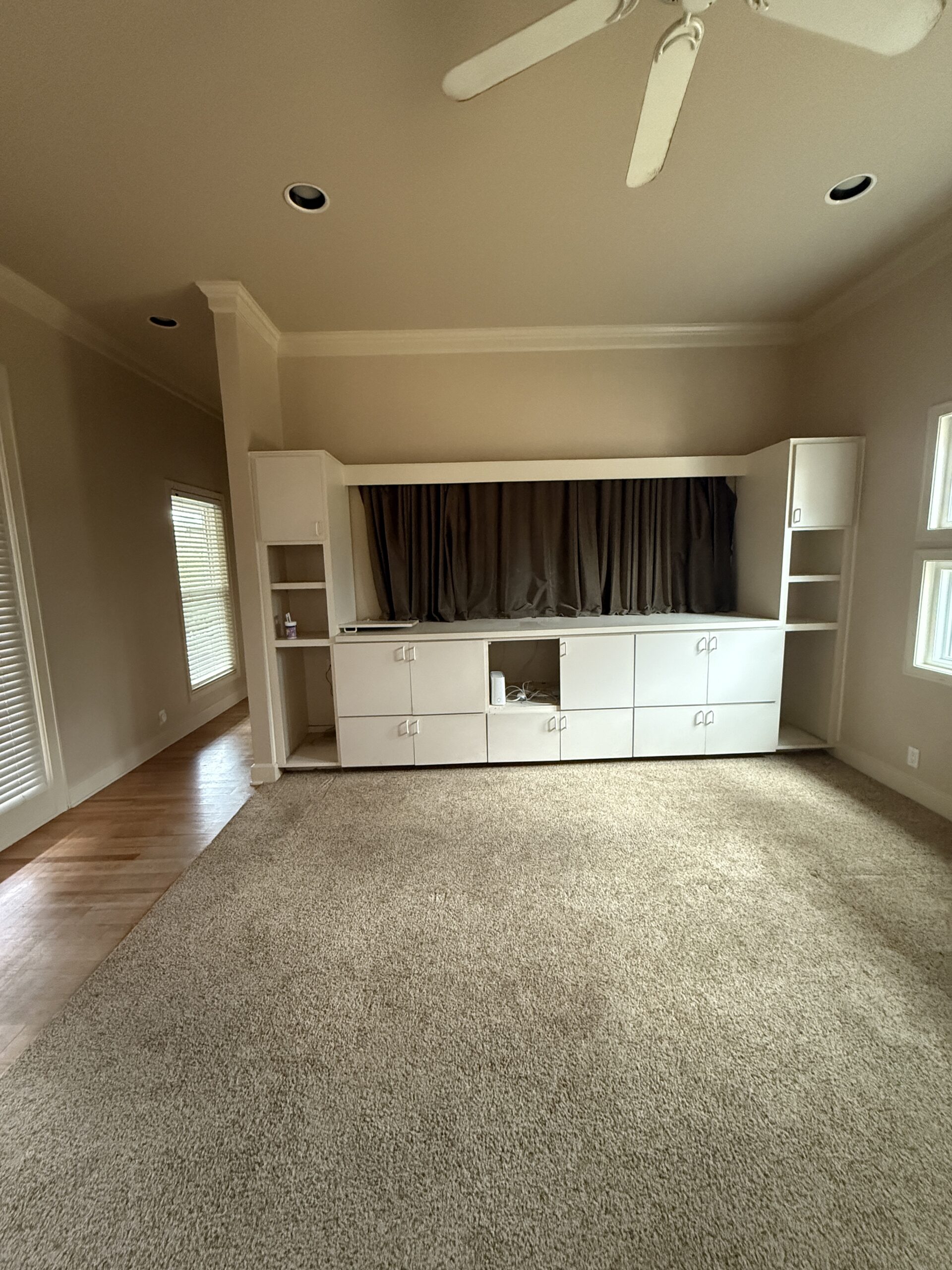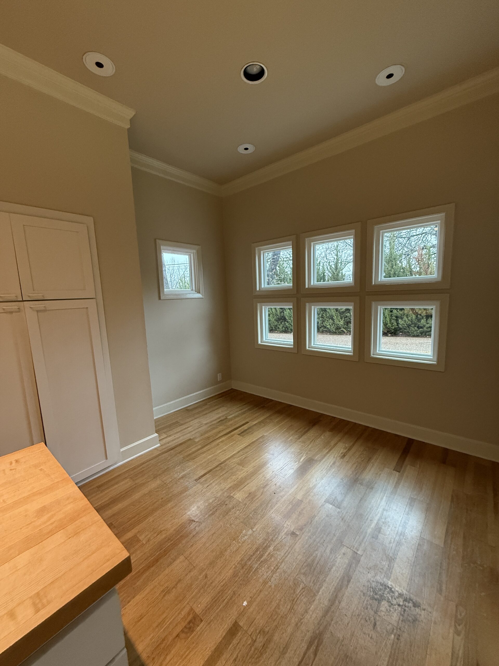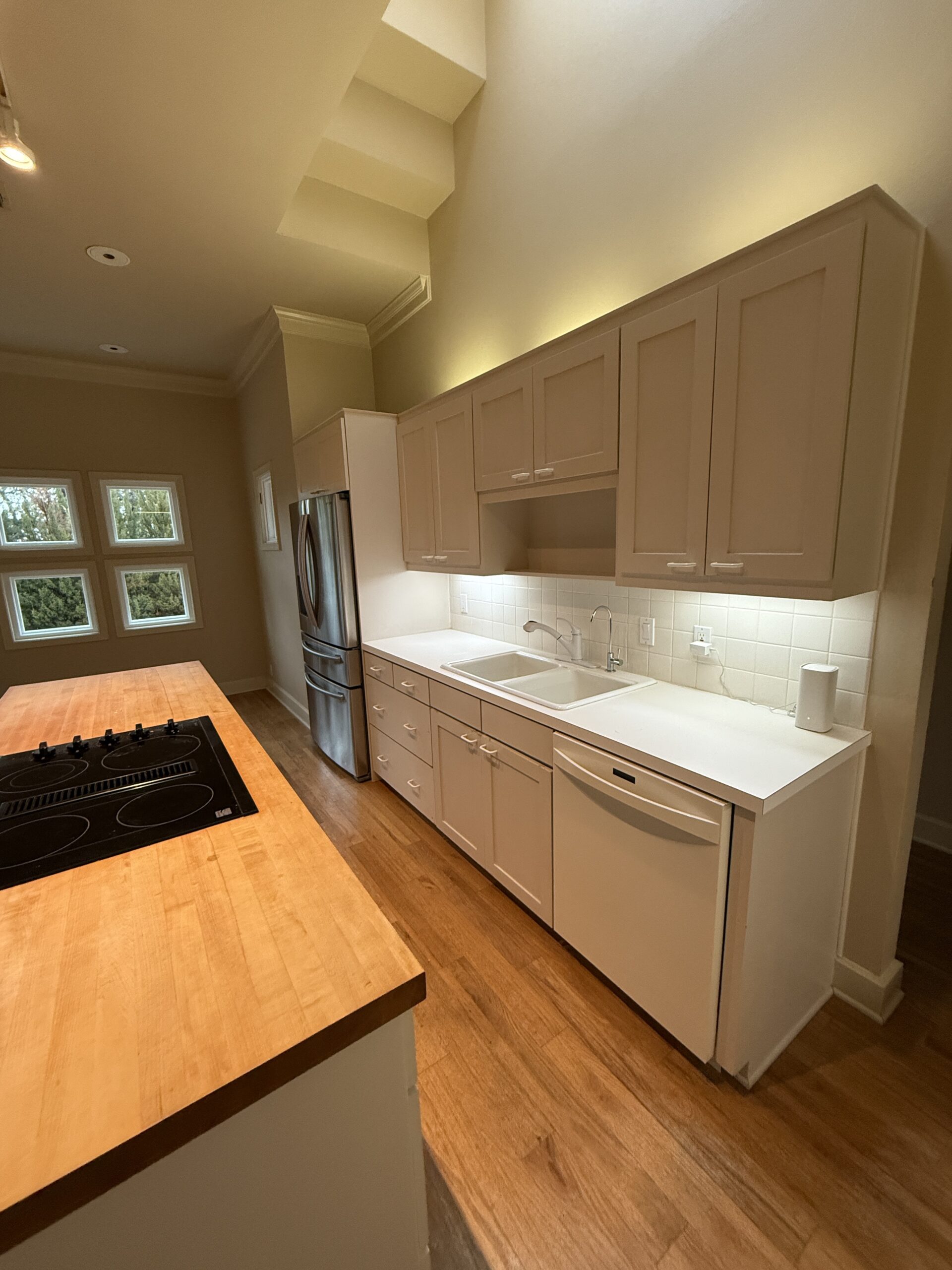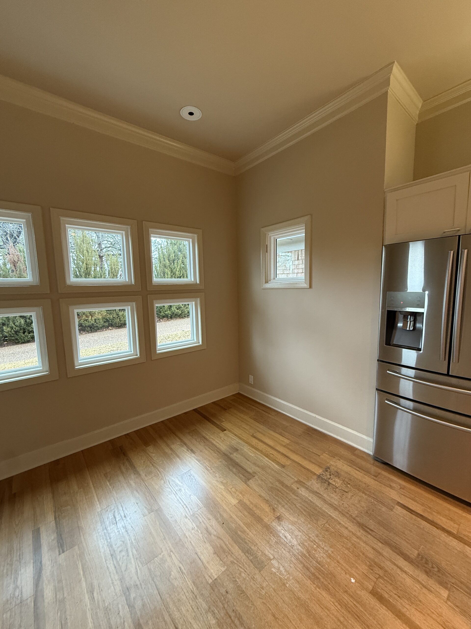 They started with our advanced design package and worked closely with our designers to create the perfect design. We removed the built-in pantry and the peninsual to extend the kitchen. Their island doubled in size and moved away from the sink, giving them a very comfortable walkway. The pantry was moved next to the wall oven, where our custom cabinet maker installed floor-to-ceiling built-ins with can shelves and roll-out trays. We also added painted cabinet storage to both sides of the breakfast nook, which our clients now use as beverage centers. These cabinets also have a hidden nook where their corgi, Lilly, can eat comfortably and out of the way.