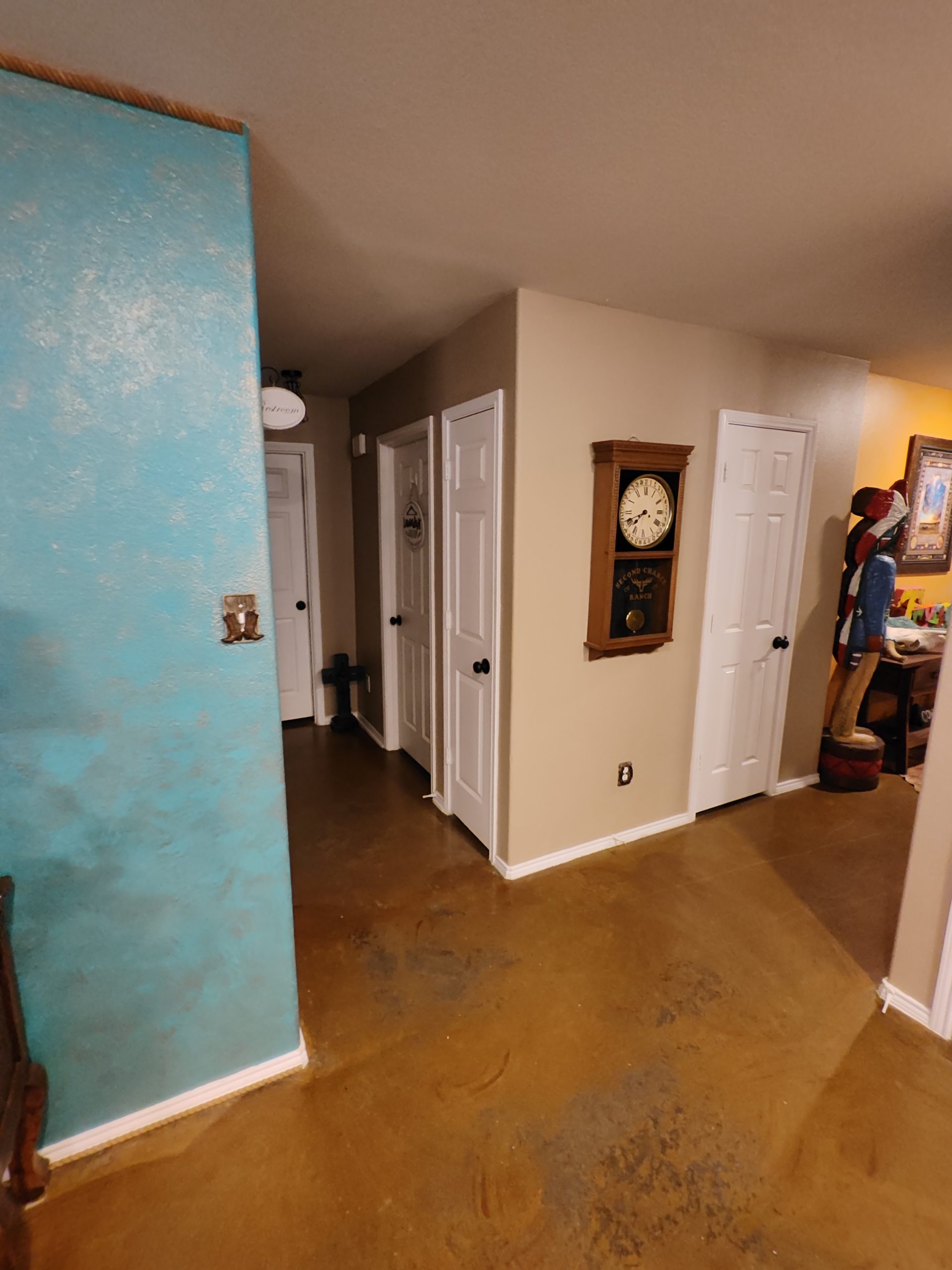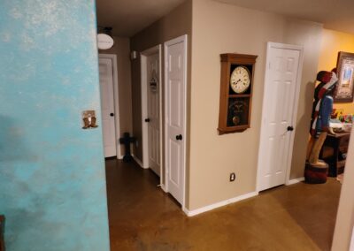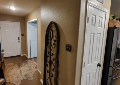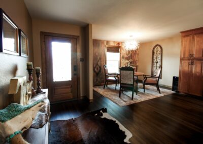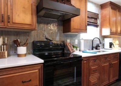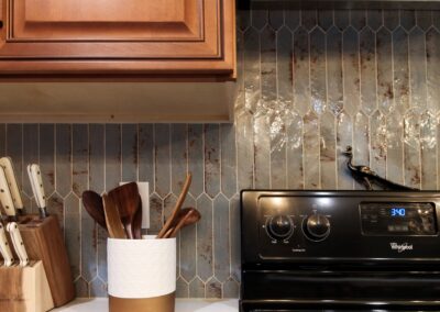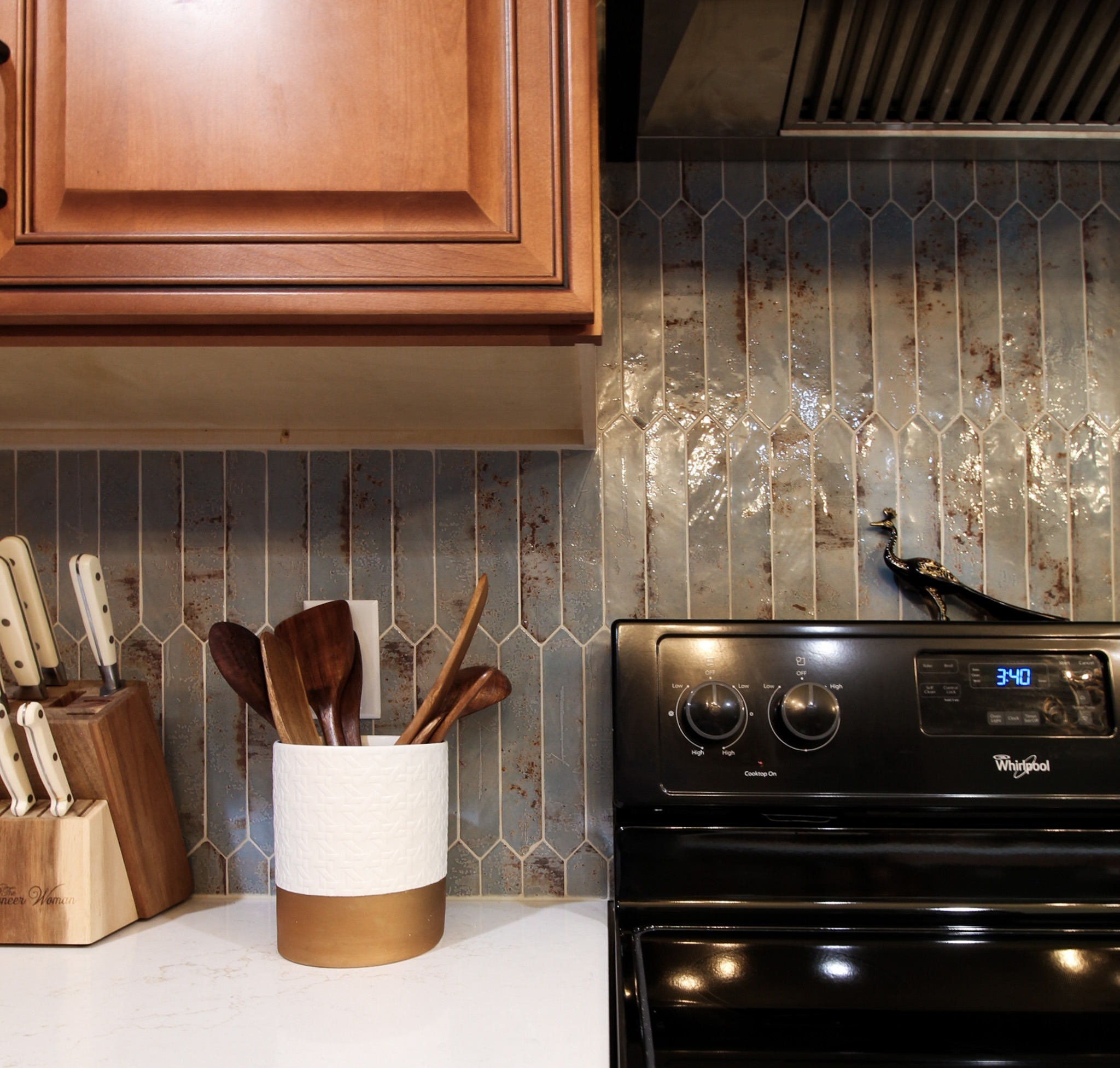 Decorative elements included a custom tiled backsplash with a fun picket shape, installing handmade chandeliers, unique drawer pulls, new flooring throughout the home, a wallpaper accent wall in the dining room, all new stained baseboards and wooden interior doors.
