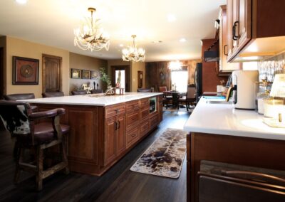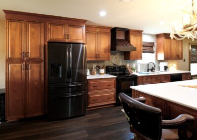 We started by removing 2 load-bearing walls between the kitchen and formal dining space to give more room to the kitchen and create a more open feel. The changes included relocating the refrigerator and range, installing new semi-custom cabinets, a beautiful hammered copper vent hood, granite composite sink, a large island, and quartz countertops.