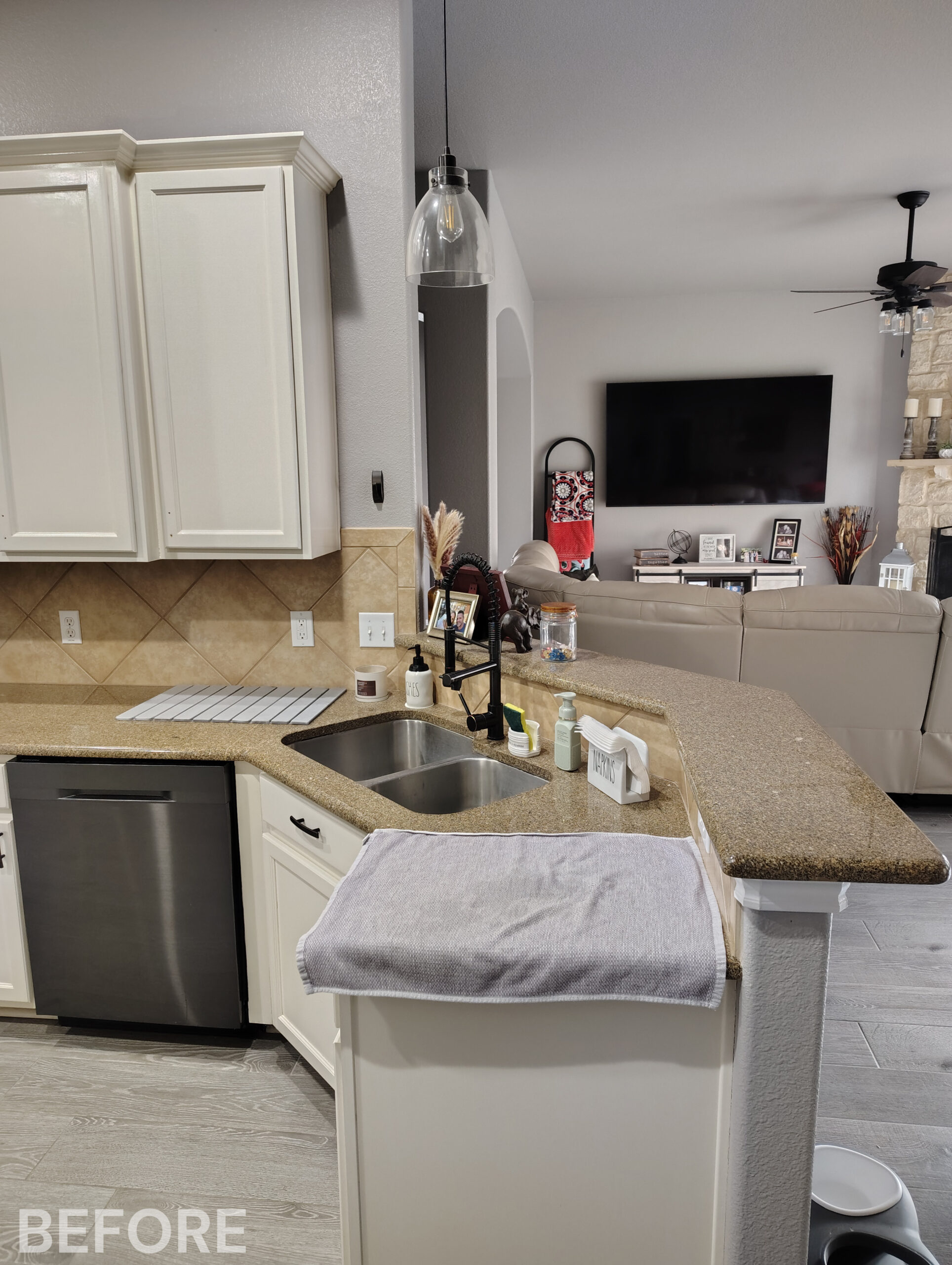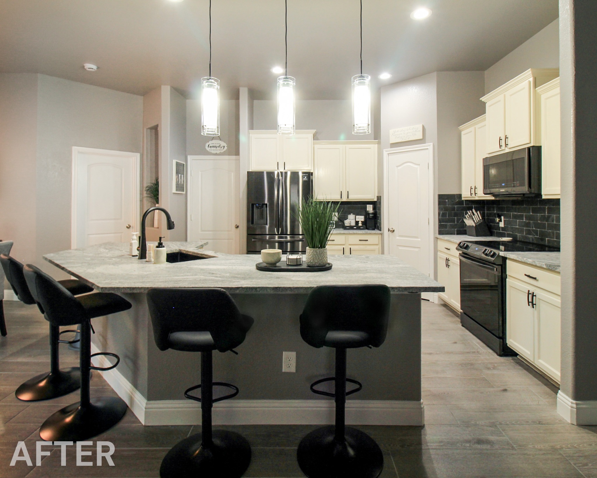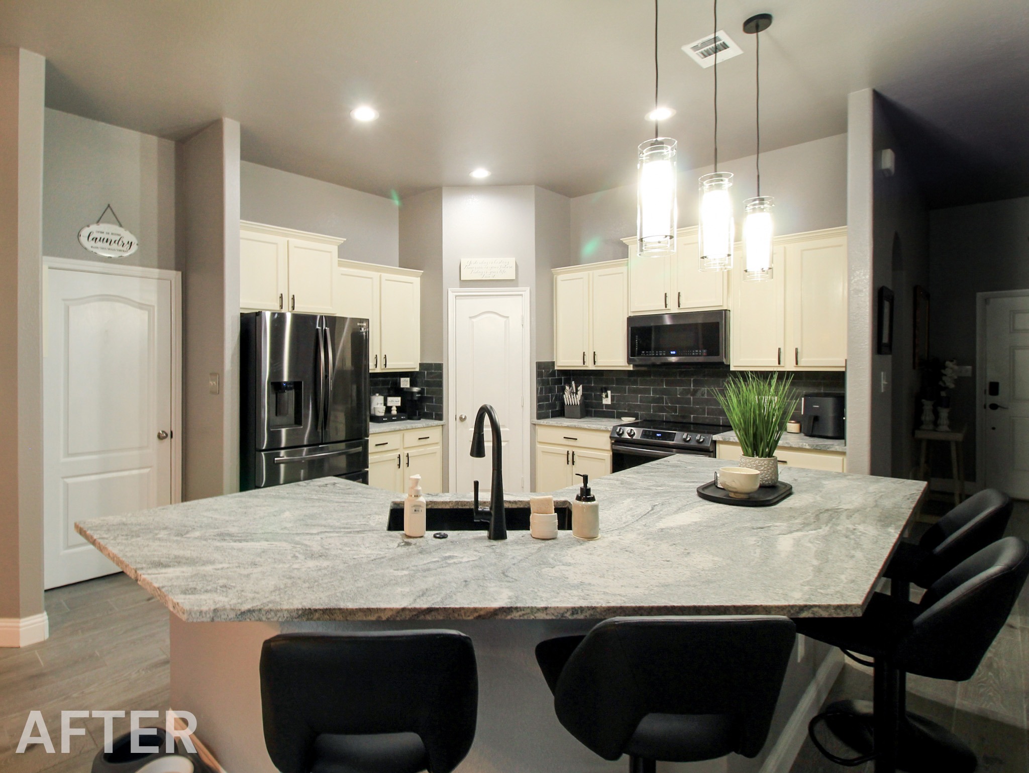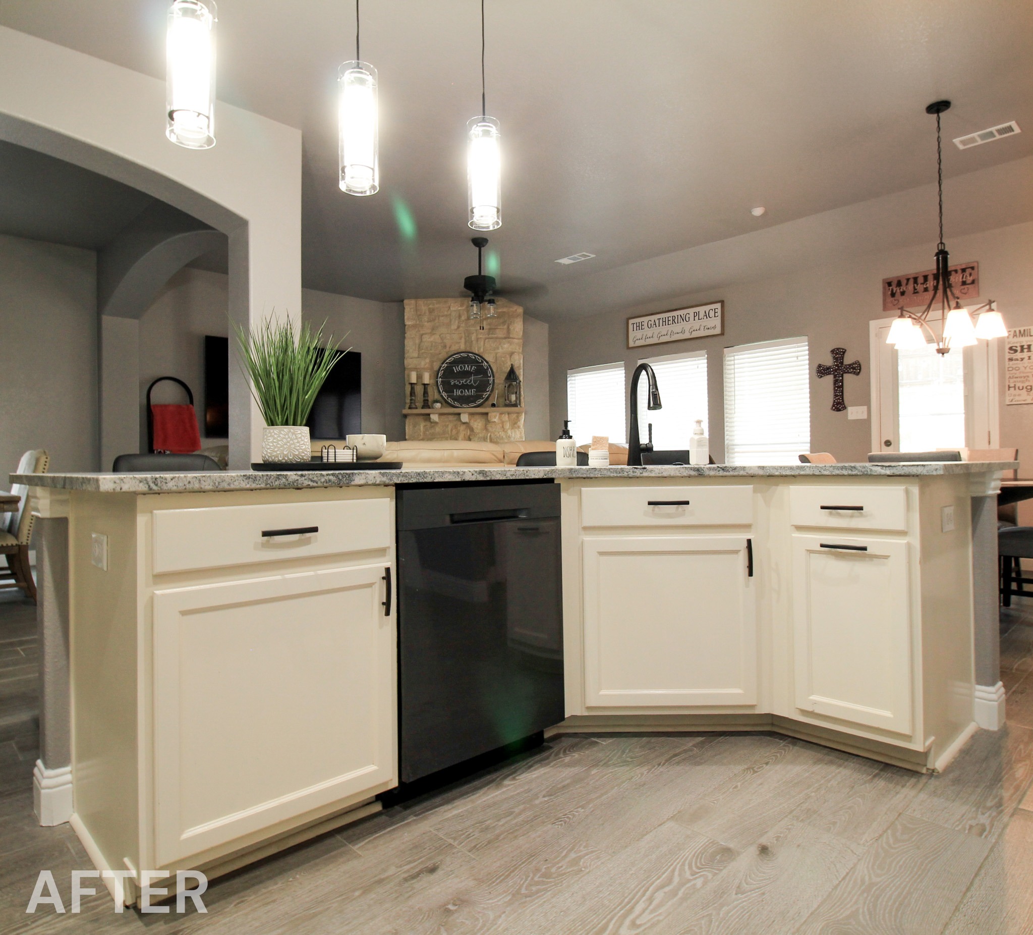 We helped this couple in Burleson transform their kitchen without replacing all of the existing elements. We removed a load-bearing wall to make the kitchen feel more open. We reused the existing cabinets as an island and leveled the countertop. Our clients chose to keep their existing floors, cabinets, and paint colors, but we intalled new granite countertops and a new tile backsplash.