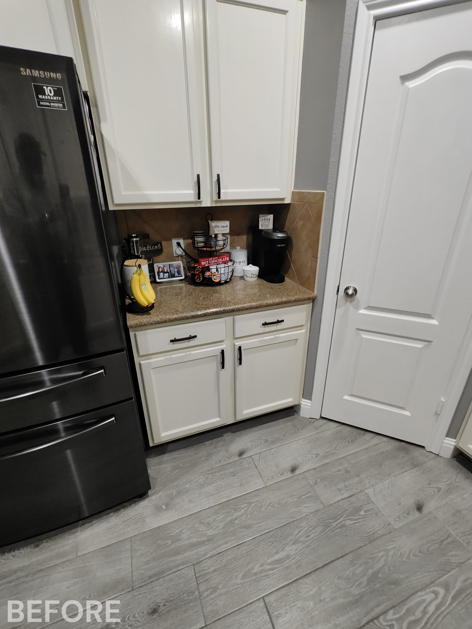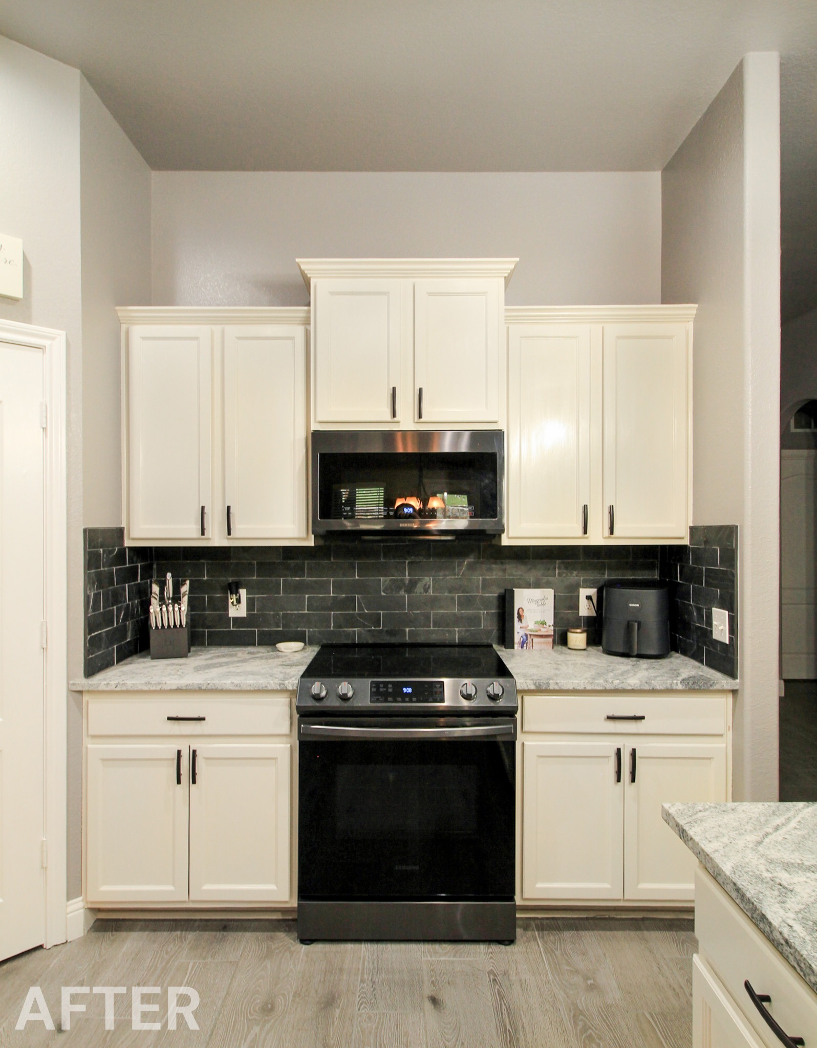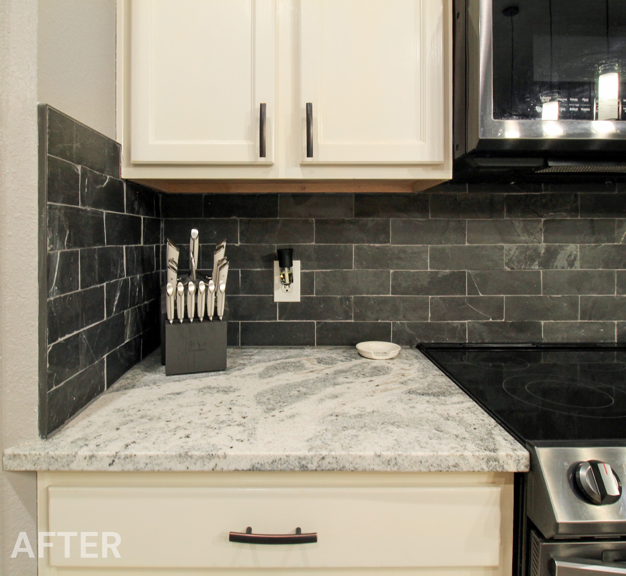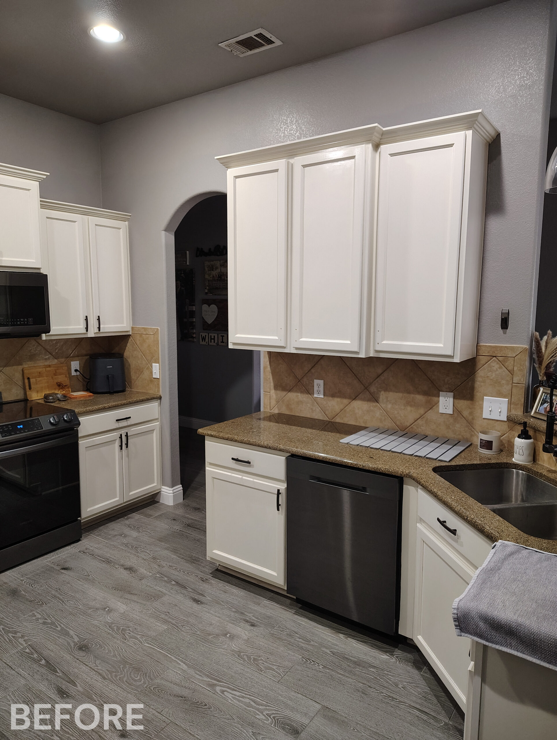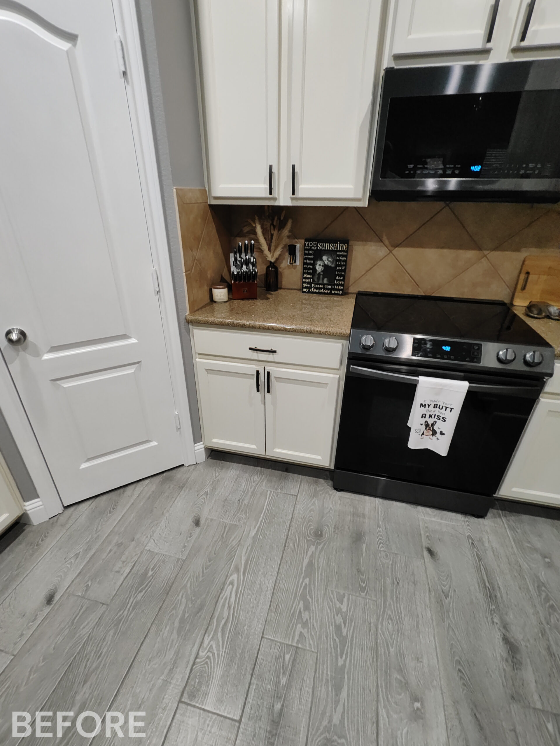We helped this couple in Burleson transform their kitchen without replacing all of the existing elements. We removed a load-bearing wall to make the kitchen feel more open. We reused the existing cabinets as an island and leveled the countertop. Our clients chose to keep their existing floors, cabinets, and paint colors, but we intalled new granite countertops and a new tile backsplash.