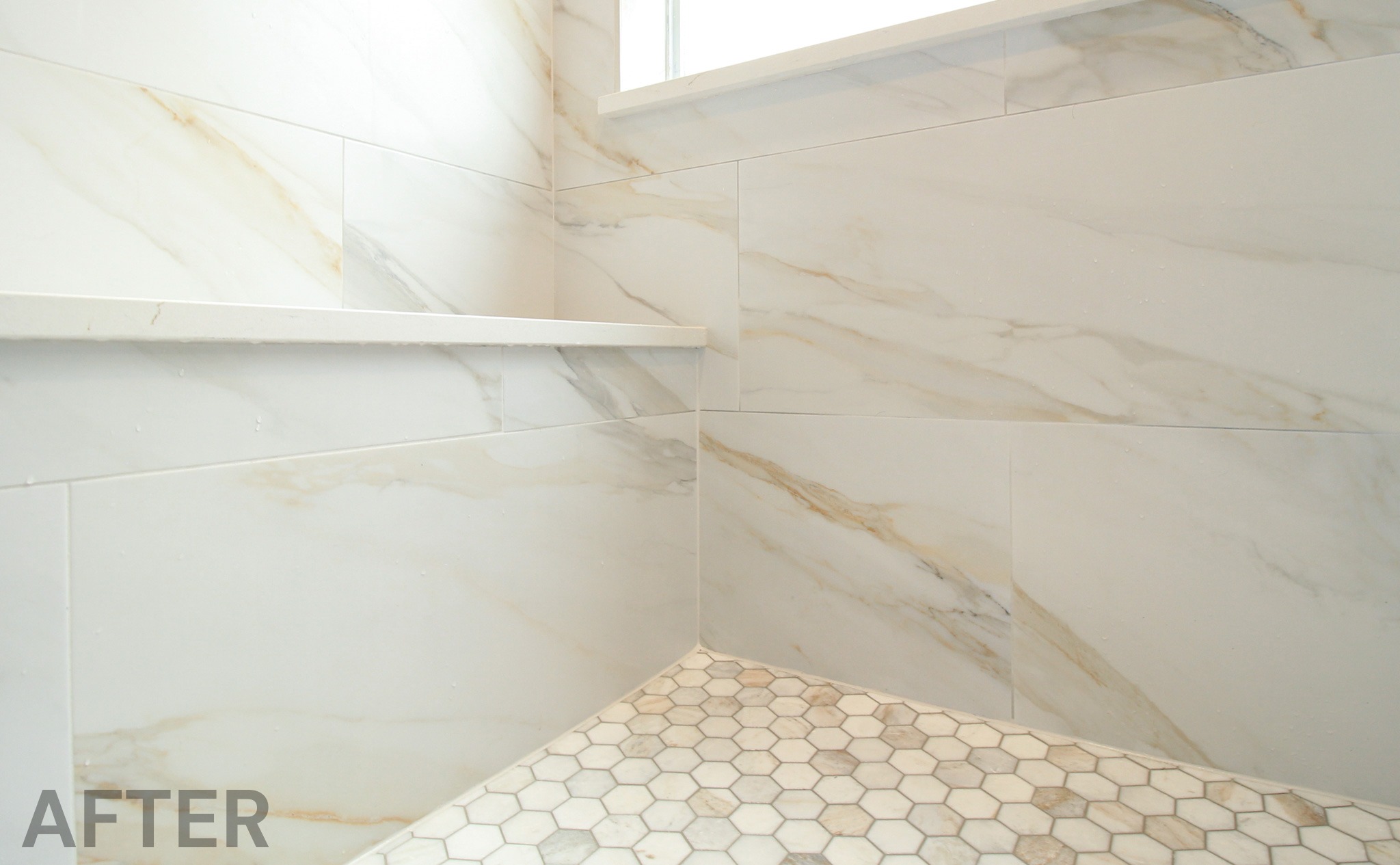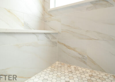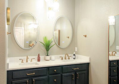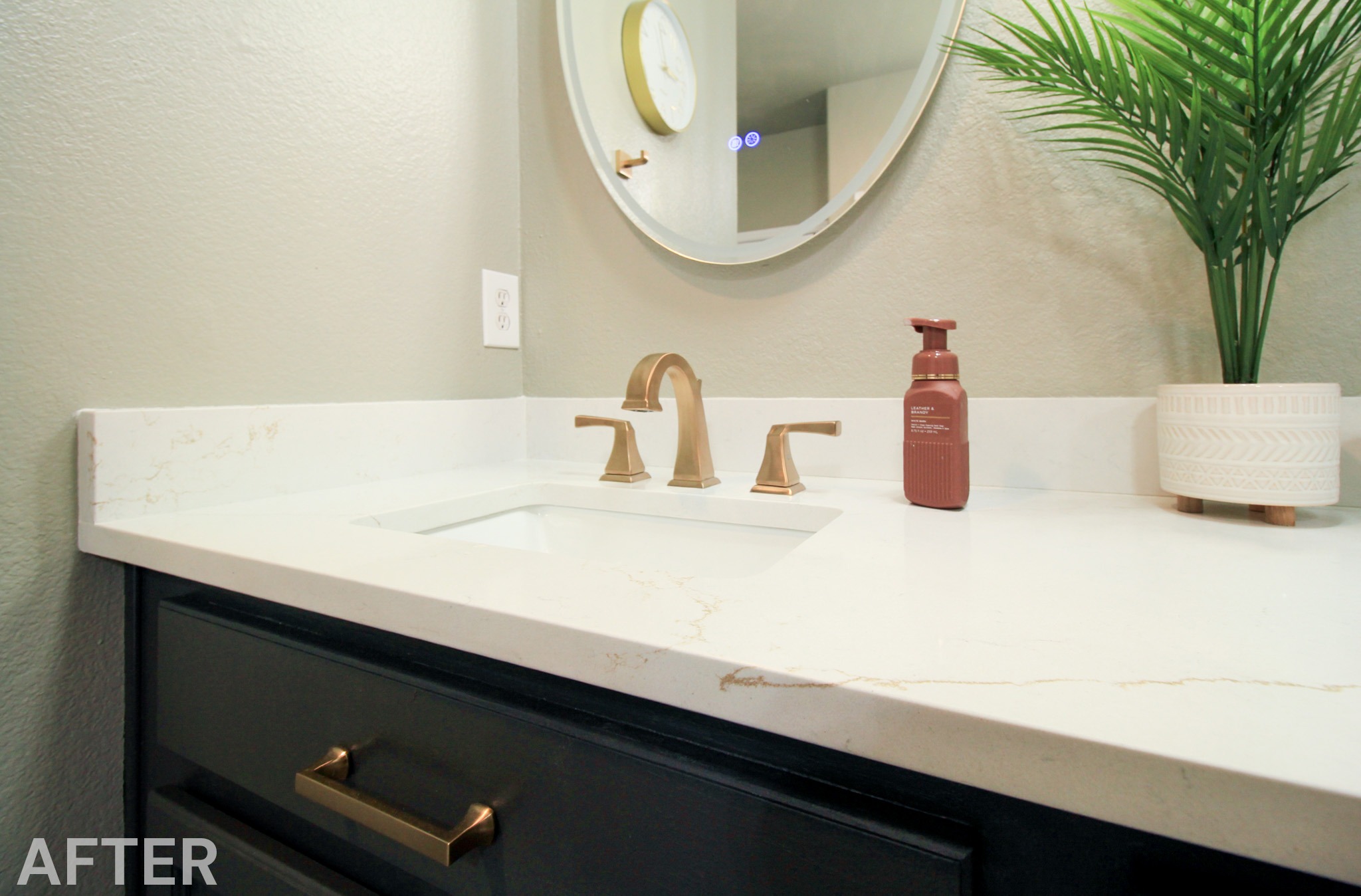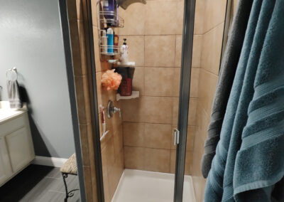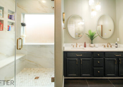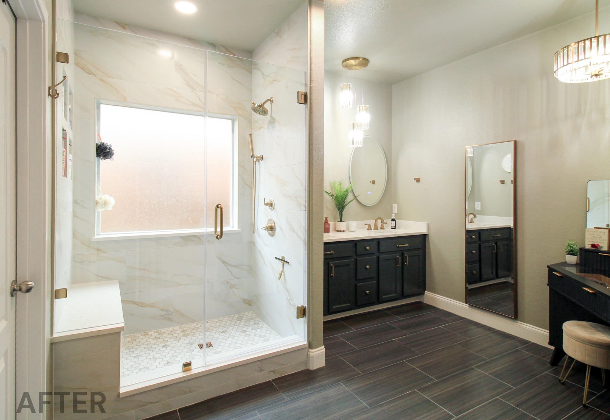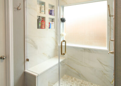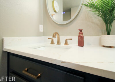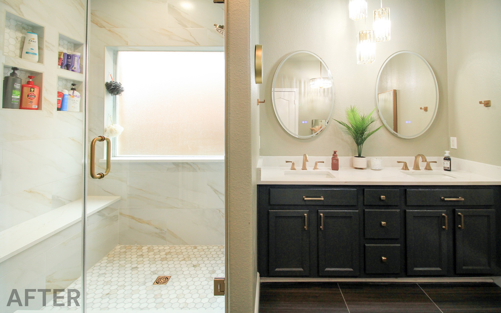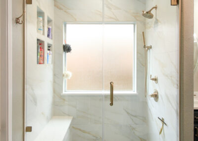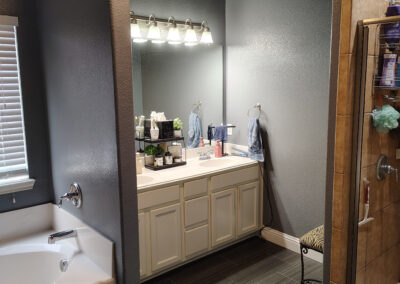 We removed the existing shower and replaced the bathtub with a spacious, custom walk-in shower. The homeowners chose to keep their original tile flooring and cabinetry, so we gave the cabinets a fresh coat of paint to match the updated aesthetic. New quartz countertops, stylish faucets, sleek mirrors, and updated light fixtures brought the whole space together. The result is a beautiful, functional bathroom that feels brand new while staying within budget.