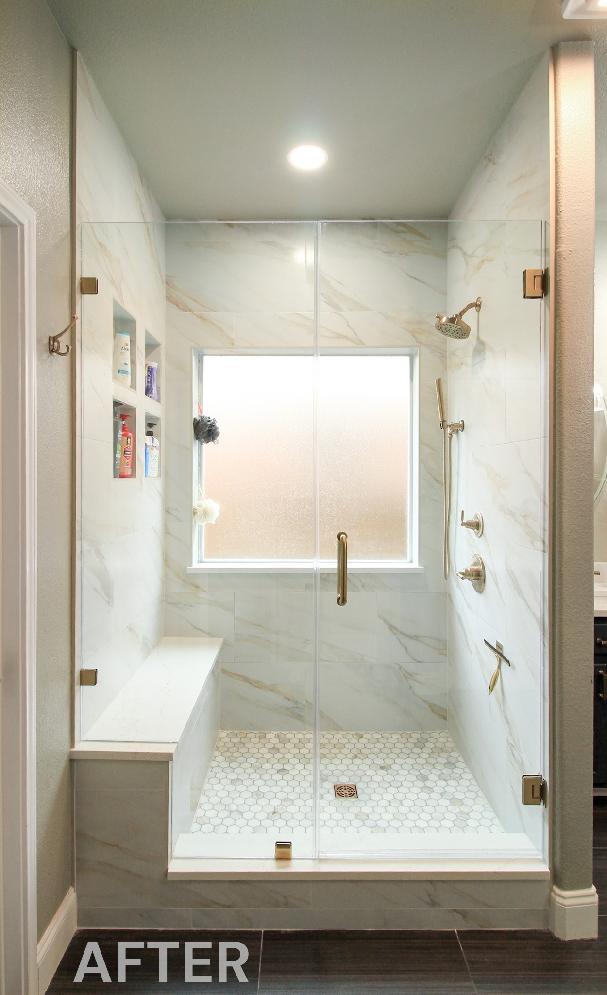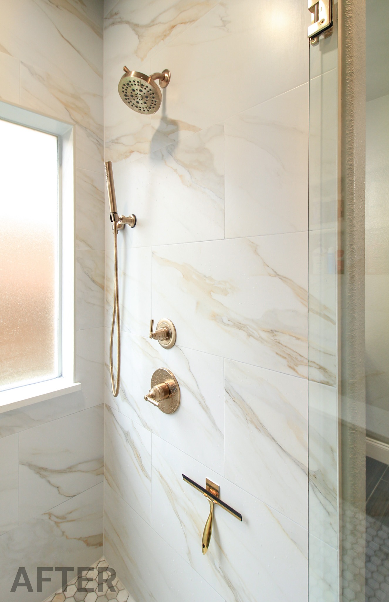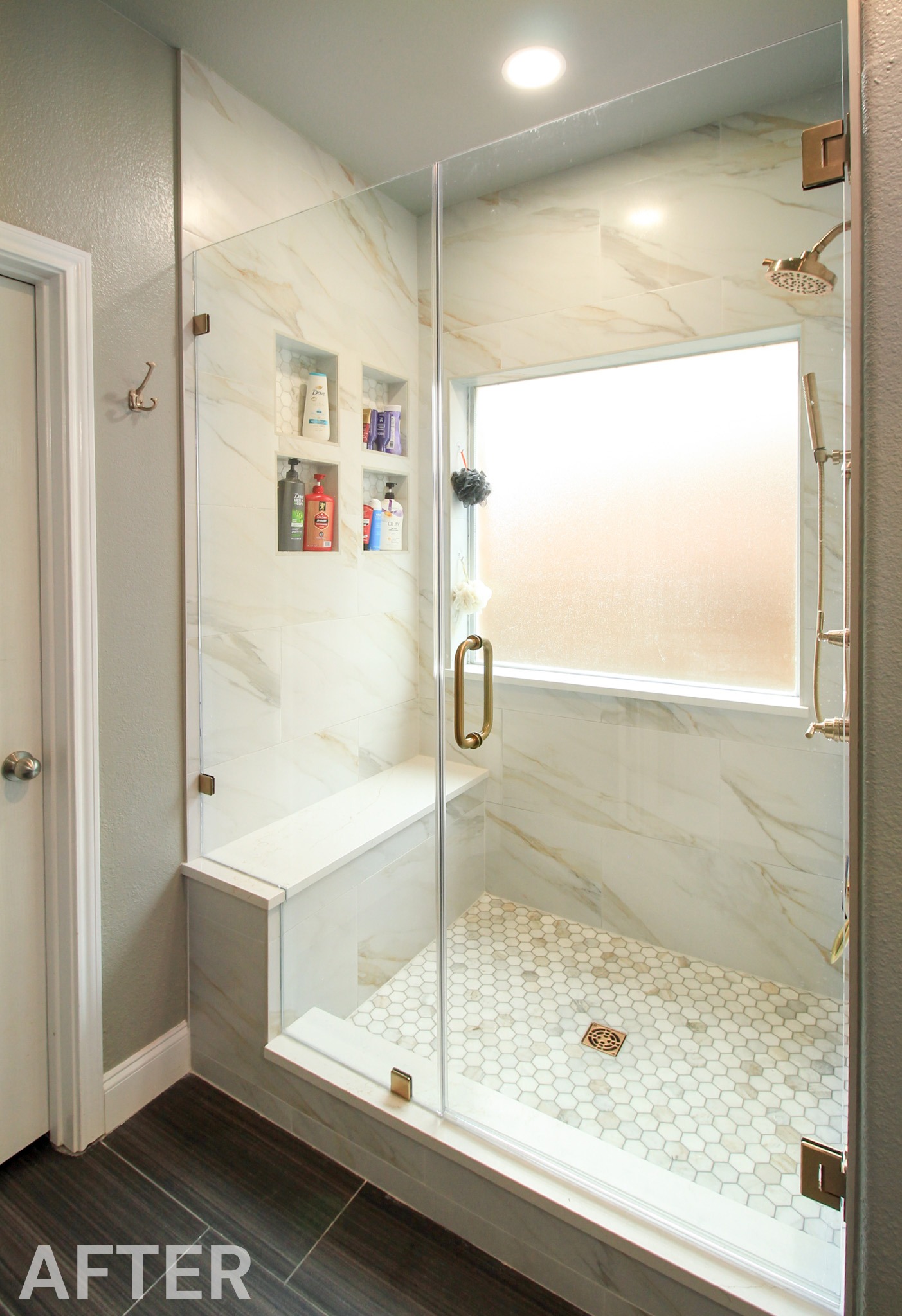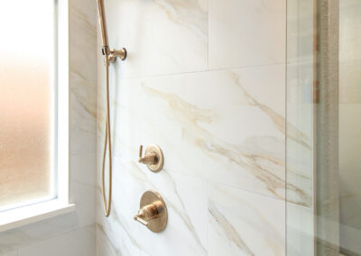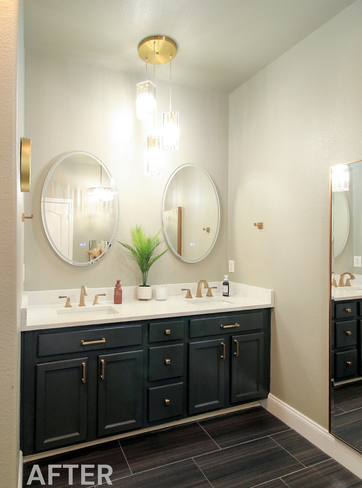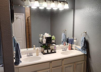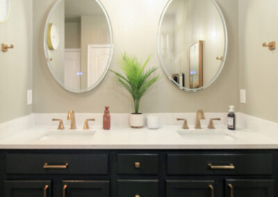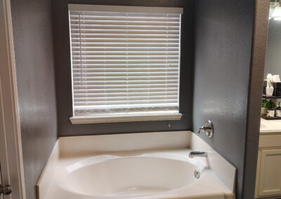 We removed the existing shower and replaced the bathtub with a spacious, custom walk-in shower. The homeowners chose to keep their original tile flooring and cabinetry, so we gave the cabinets a fresh coat of paint to match the updated aesthetic. New quartz countertops, stylish faucets, sleek mirrors, and updated light fixtures brought the whole space together. The result is a beautiful, functional bathroom that feels brand new while staying within budget.