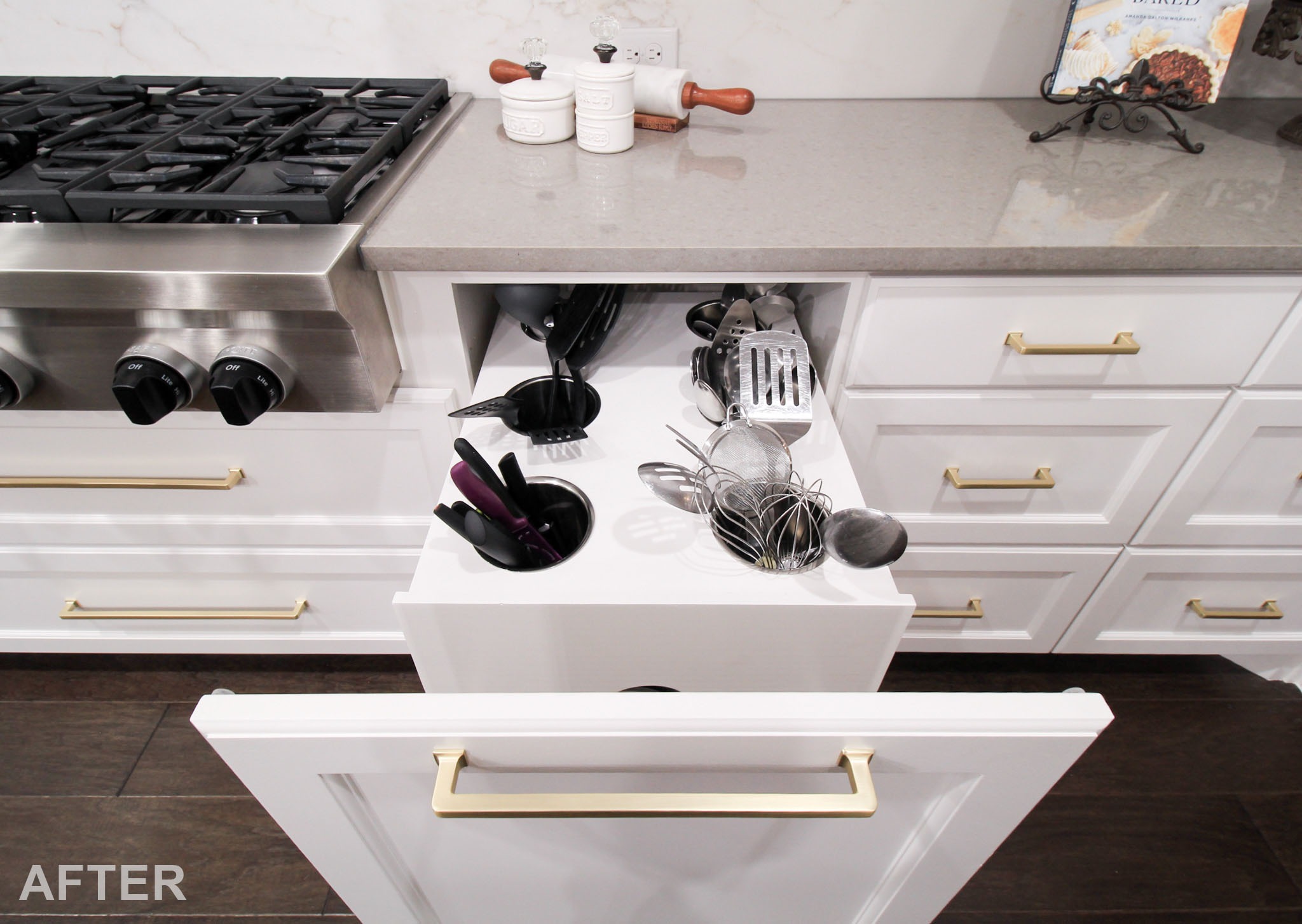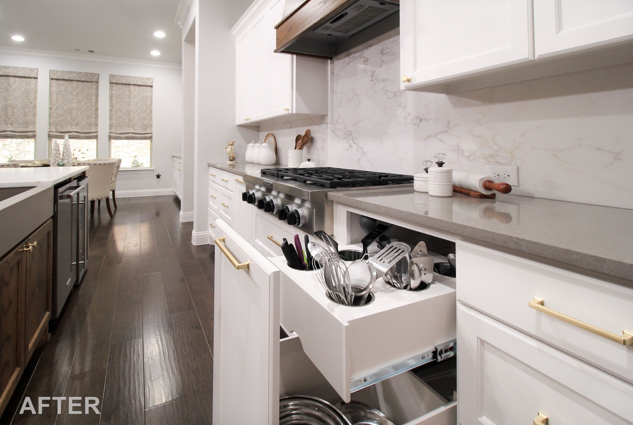 They already had beautiful hardwood floors in their kitchen and throughout the home, so we helped preserve them. By installing all new cabinetry, we were able to create a focal point using the custom-built, stain-grade wood island and matching vent hood. We installed new modified shaker-style cabinetry with customized storage like spice pull-outs, dedicated utensil organization, and a cookie sheet compartment above the refrigerator.