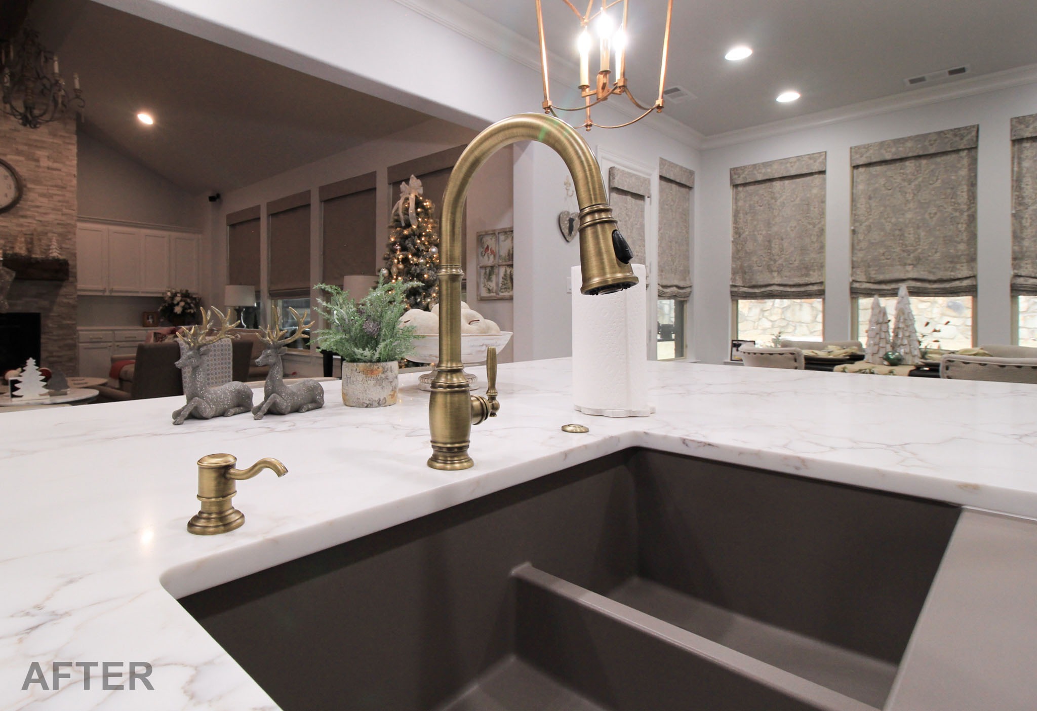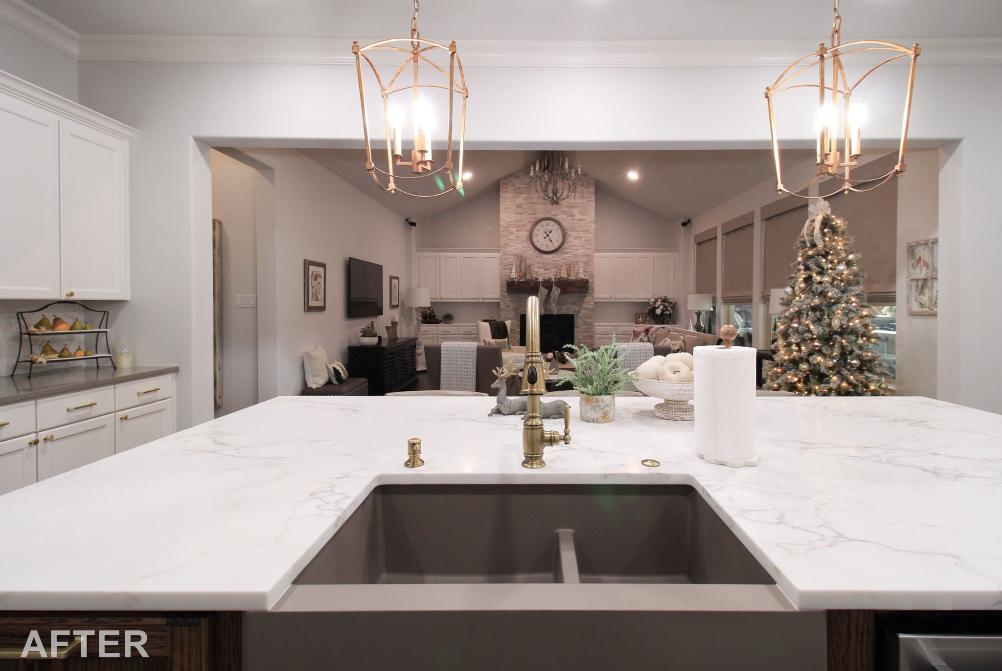 For durability, we used quartz countertops and a contrasting quartz backsplash, accented with a granite composite apron-front sink and warm gold fixtures.