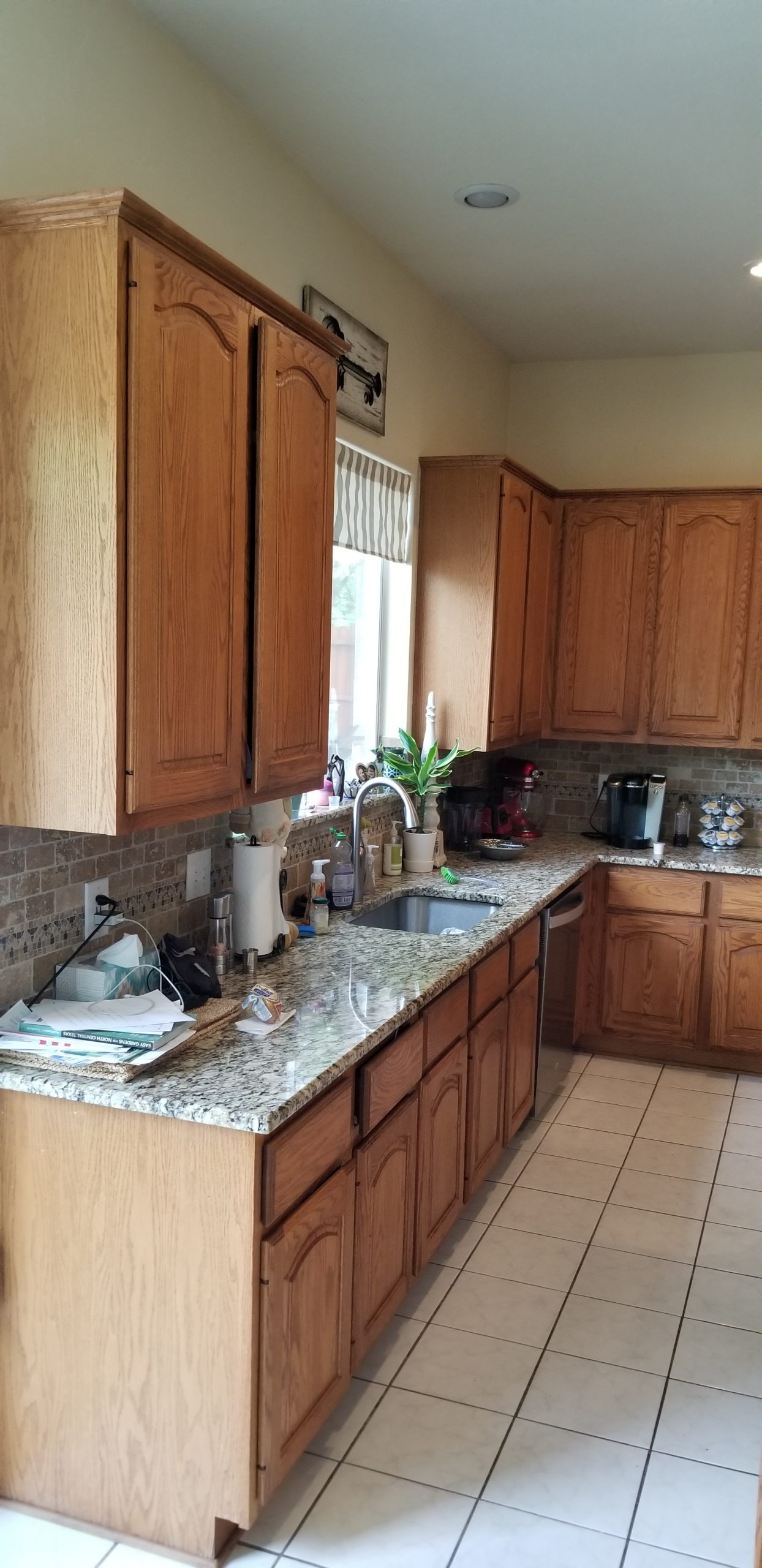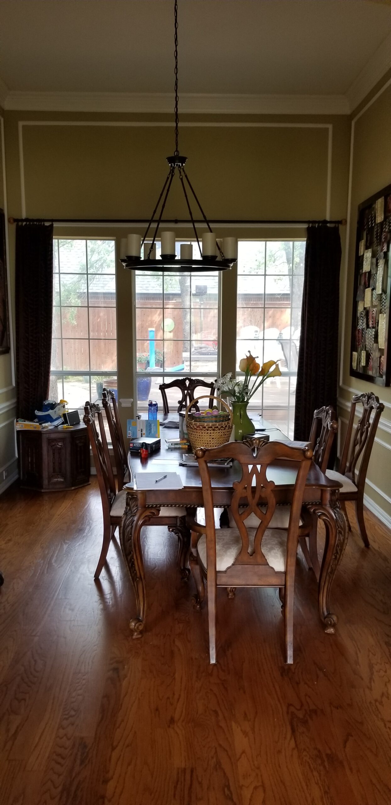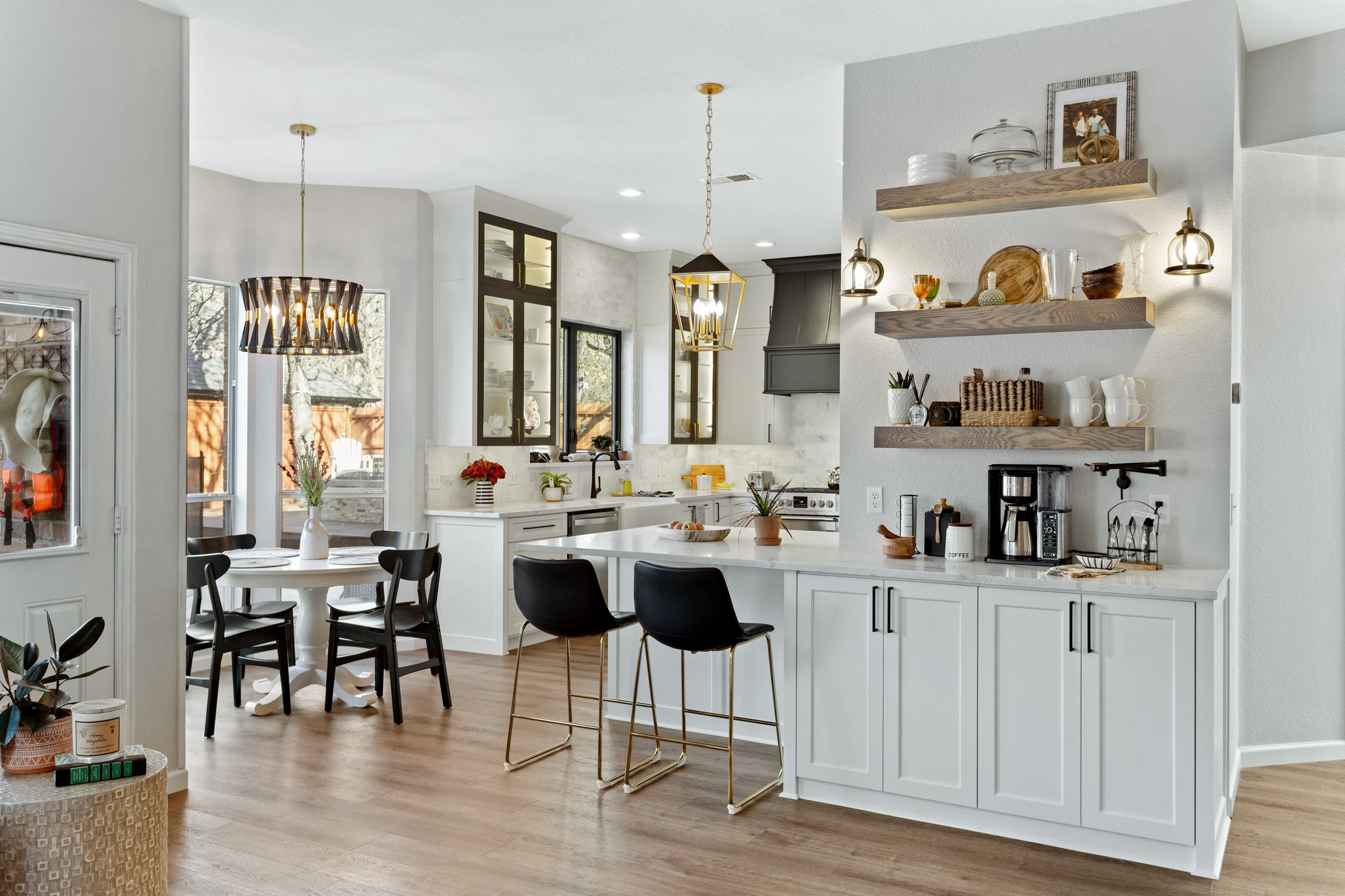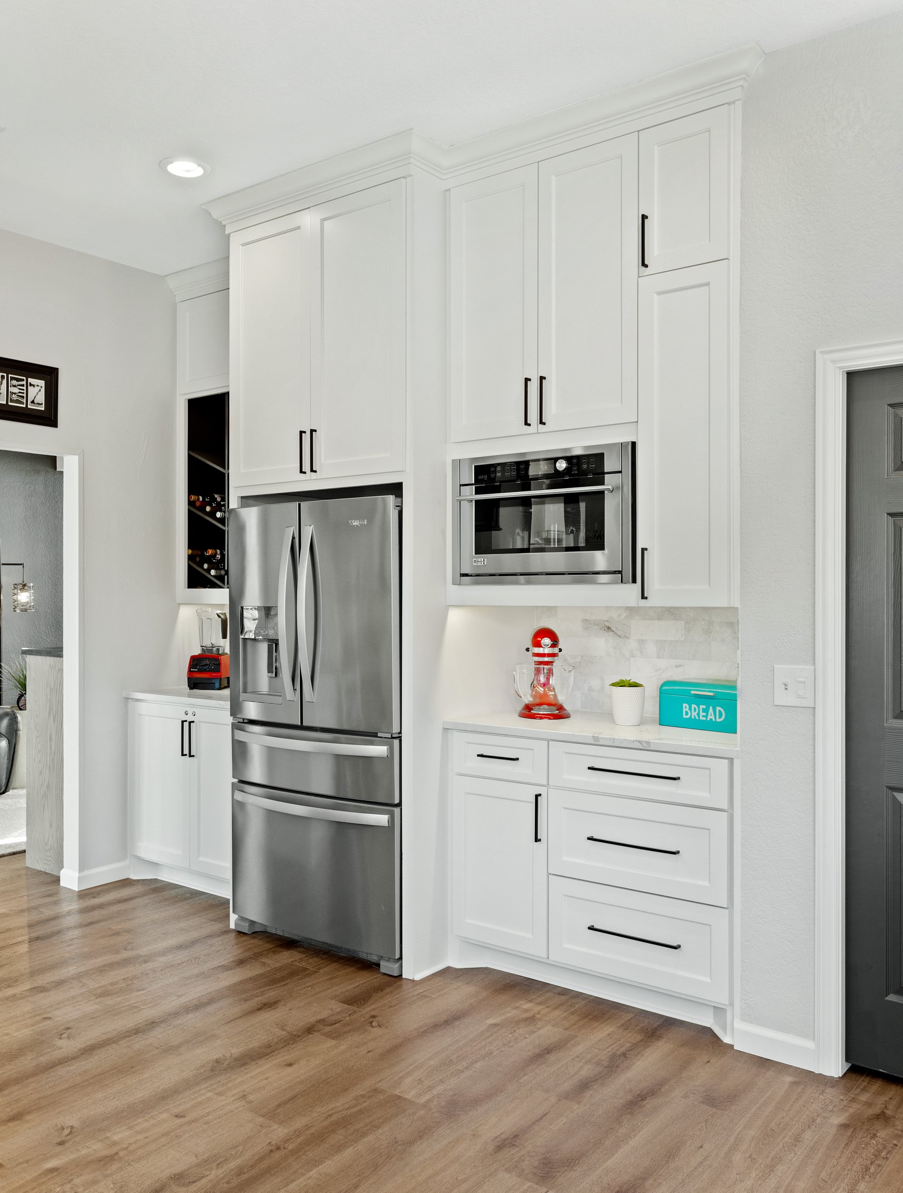 This project in Colleyville was so fun to help bring to life. Their old layout felt choppy and disconnected, and was not ideal for entertaining. So, they worked with an outside interior designer to improve the flow of the home. We swapped the dining room and the formal living room and added huge patio slider party doors on the new living area, along with an electric fireplace, to set the mood for parties year round! We refreshed the fireplace in the second living room, too, refacing it with a granite slab and a stained mantel. The real star of the show, though, is the kitchen. We removed a powder bathroom to enlarge the kitchen and pantry, using the plumbing from the existing sink for a pot filler for their new coffee bar wall. We installed new, custom cabinets (some with glass doors), a custom vent hood, quartz countertops, and a marble tile backsplash.
