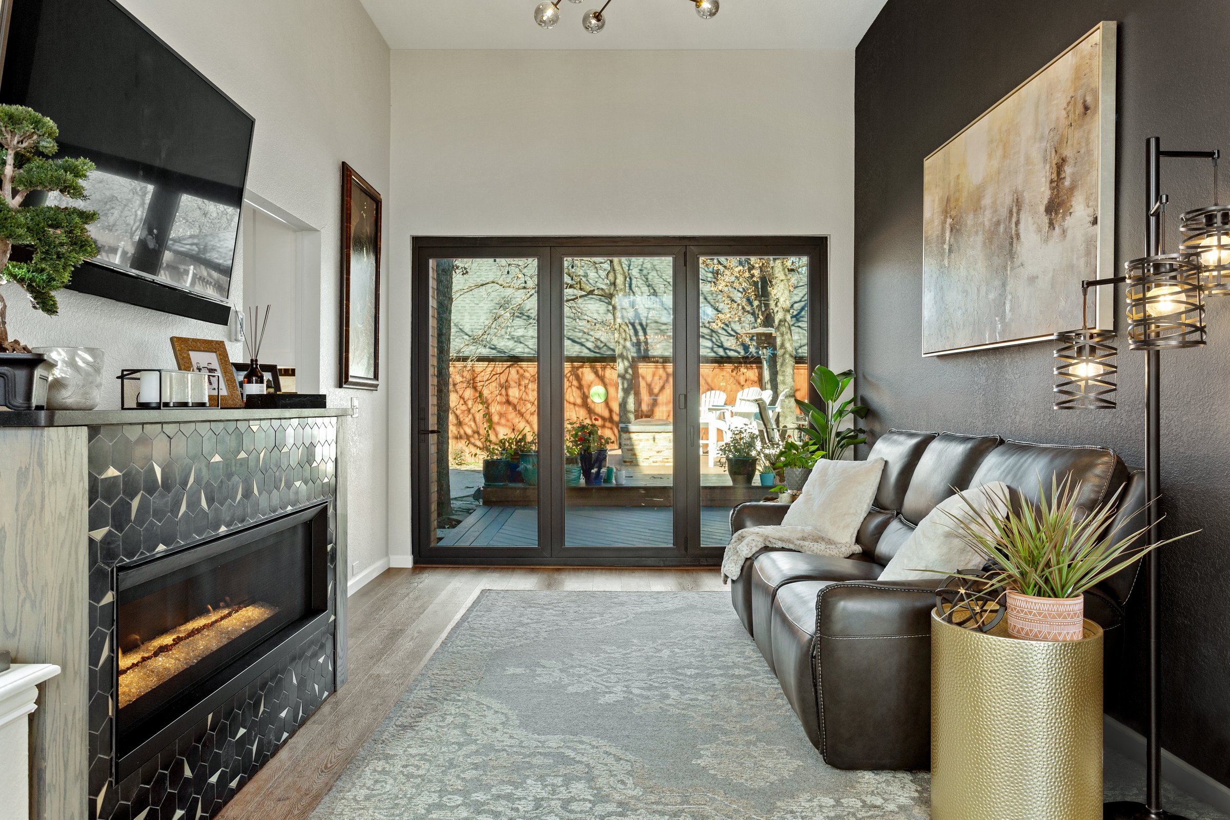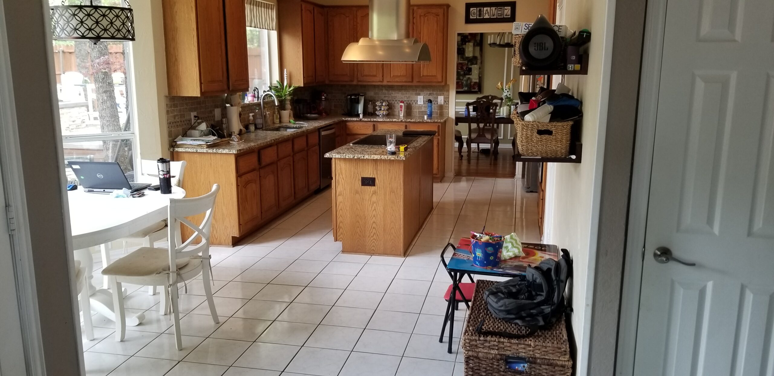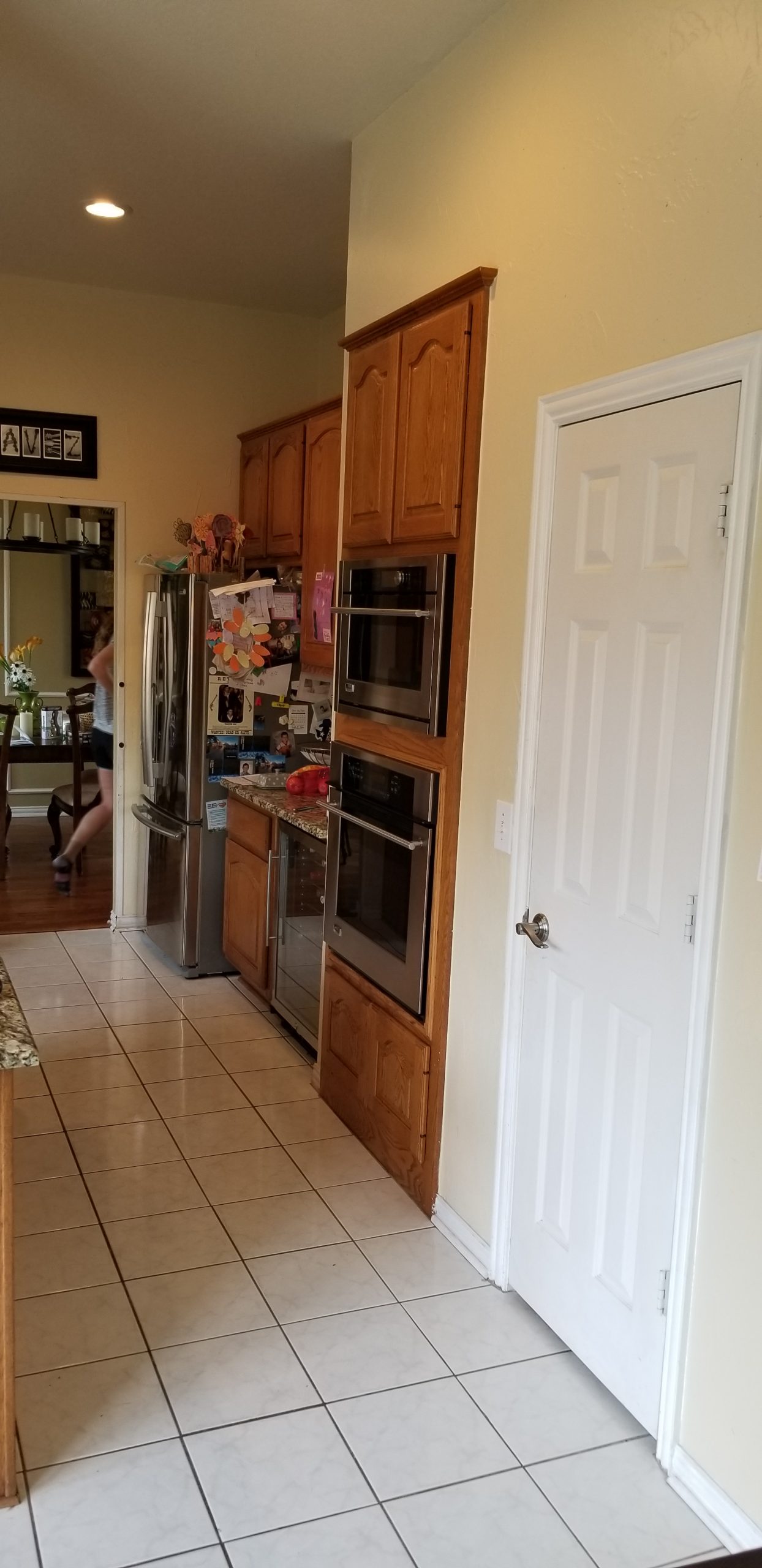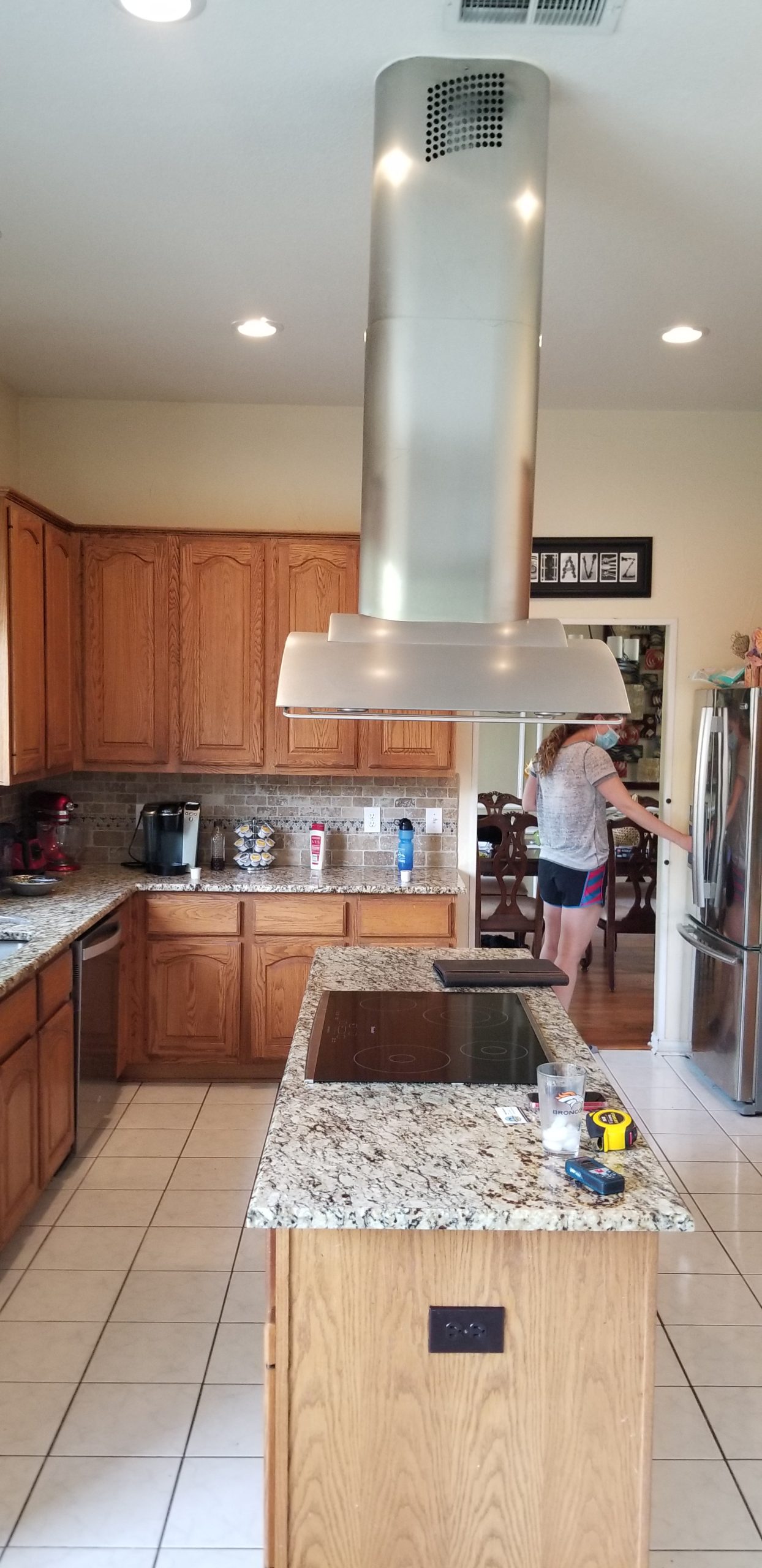 This project in Colleyville was so fun to help bring to life. Their old layout felt choppy and disconnected, and was not ideal for entertaining. So, they worked with an outside interior designer to improve the flow of the home. We swapped the dining room and the formal living room and added huge patio slider party doors on the new living area, along with an electric fireplace, to set the mood for parties year round! We refreshed the fireplace in the second living room, too, refacing it with a granite slab and a stained mantel. The real star of the show, though, is the kitchen. We removed a powder bathroom to enlarge the kitchen and pantry, using the plumbing from the existing sink for a pot filler for their new coffee bar wall. We installed new, custom cabinets (some with glass doors), a custom vent hood, quartz countertops, and a marble tile backsplash.