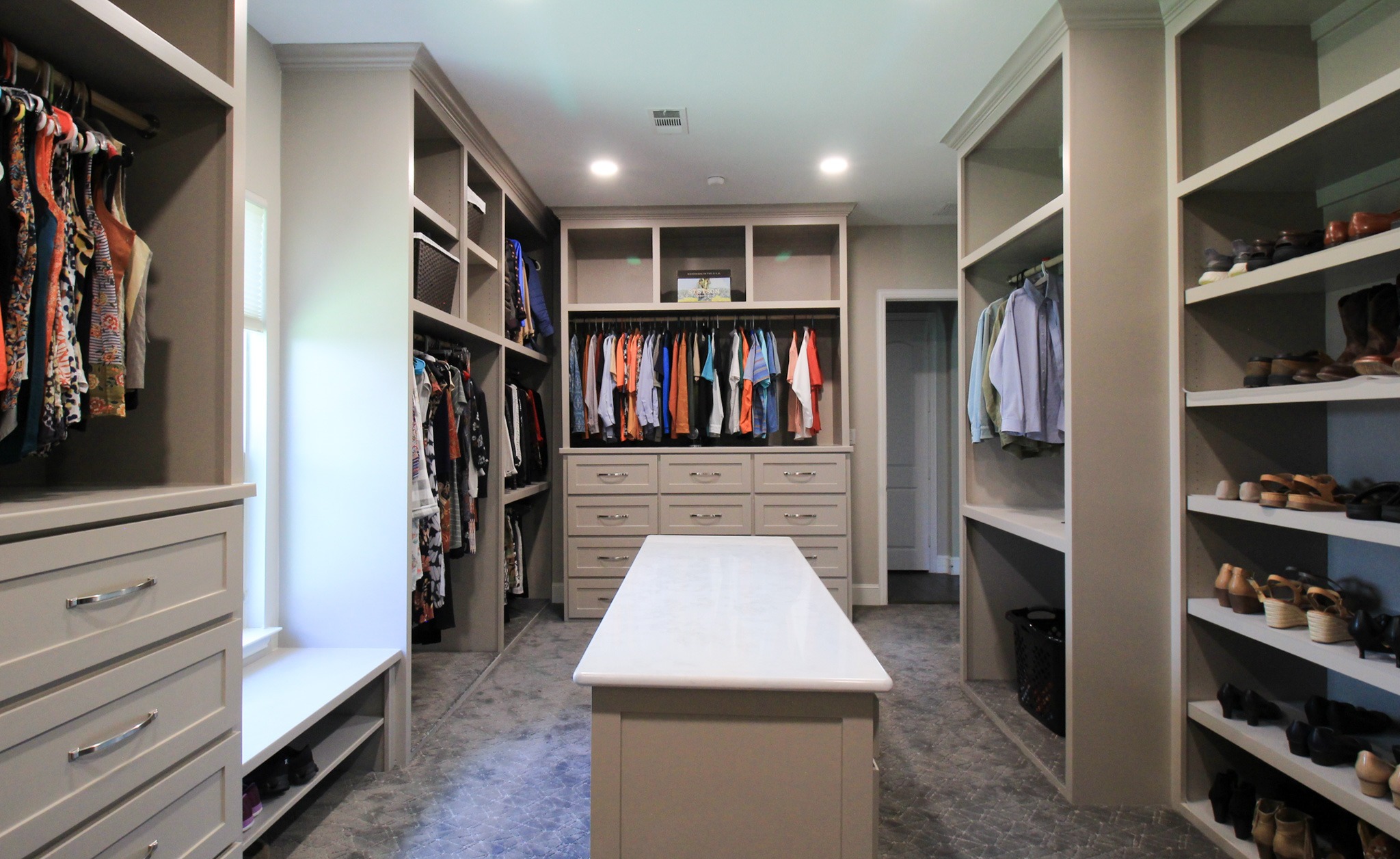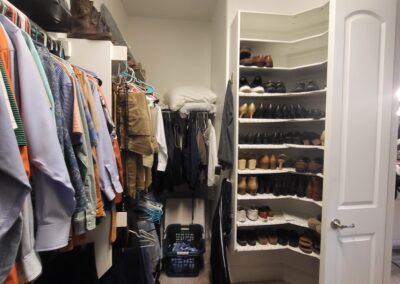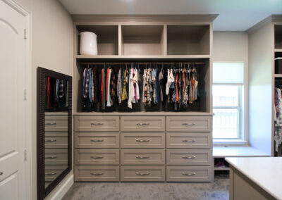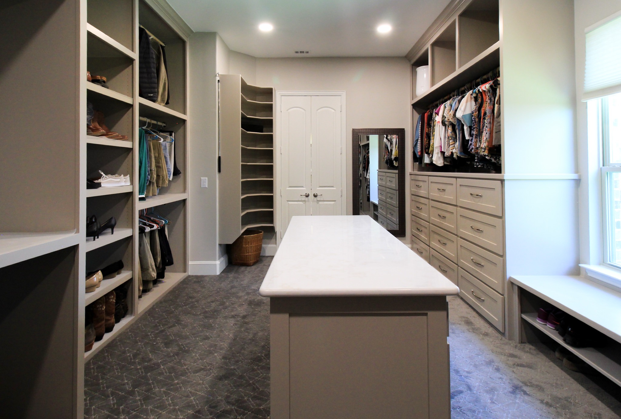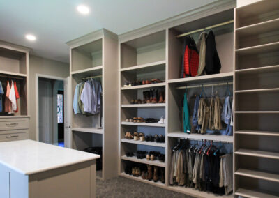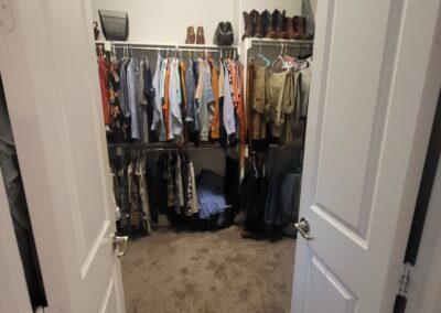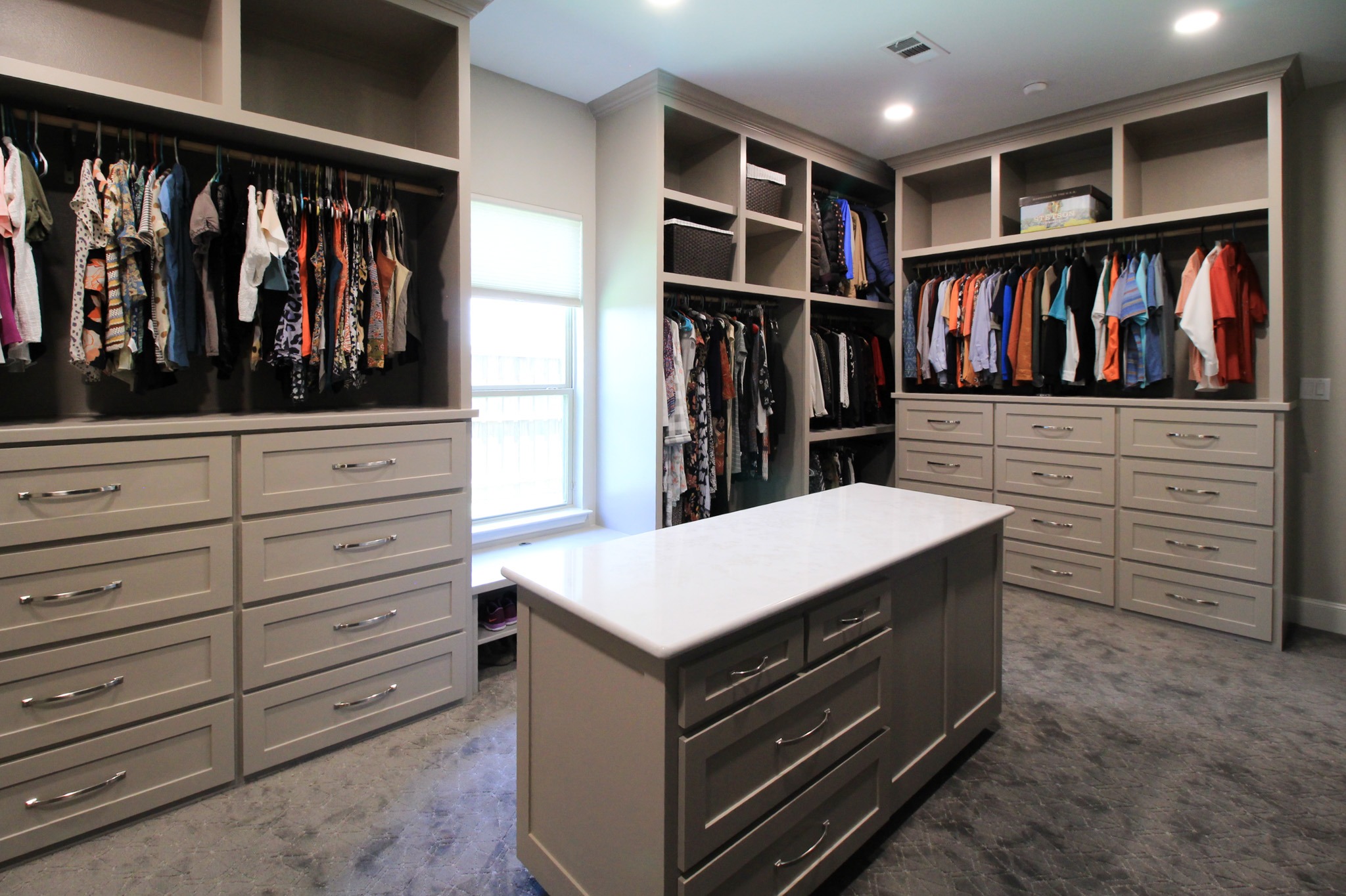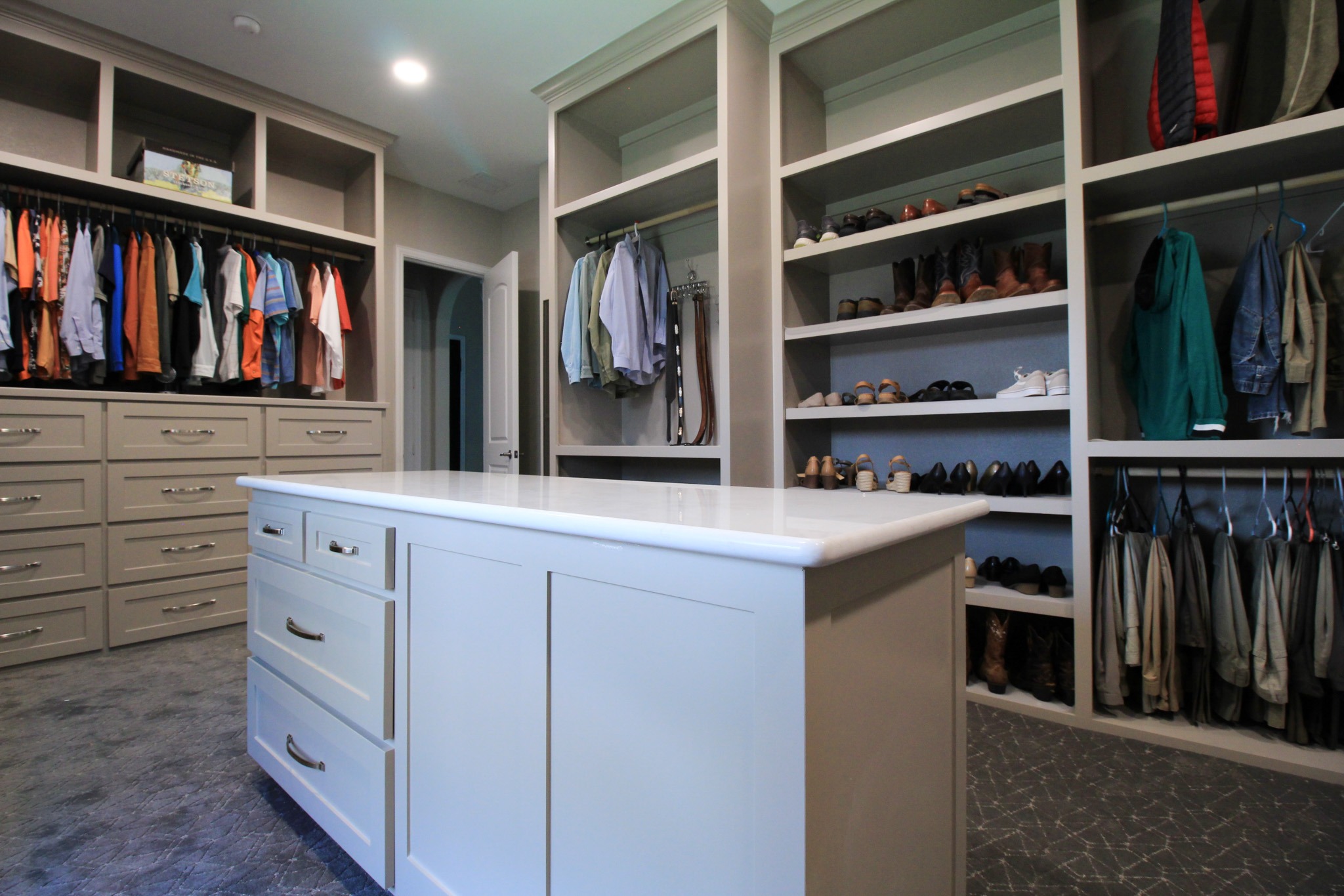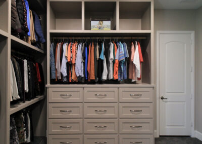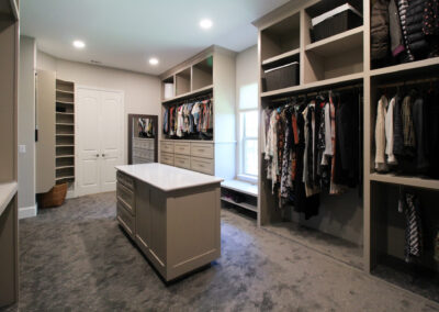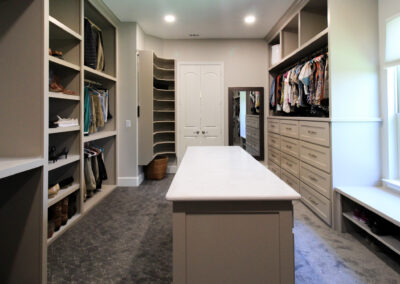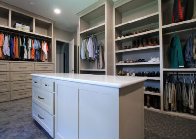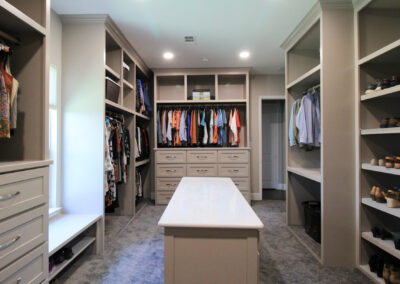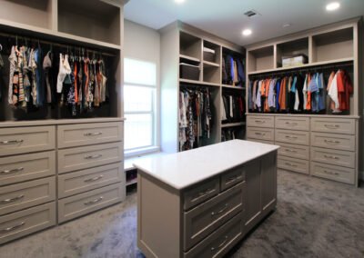 Our clients in Colleyville had a spare bedroom they weren’t using and a master closet that was too small. After looking at a few options with one of our in-house designers, they decided to expand their master closet into the guest bedroom right behind it. We helped them create a roomy master closet with custom cabinets and an island. After removing the separating walls, we installed all new custom cabinetry, a quartz countertop, new carpet flooring, and finished the project with new paint.
