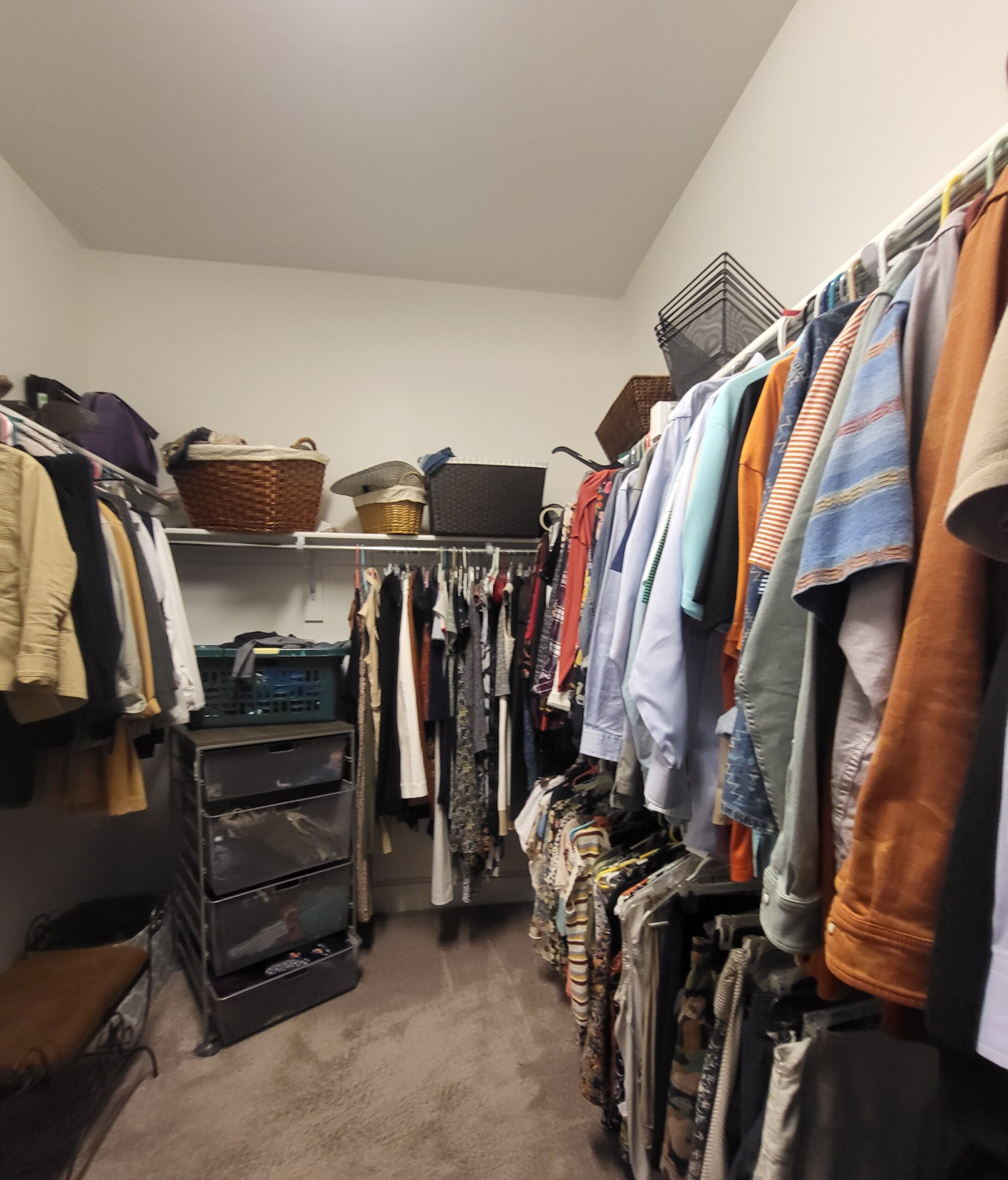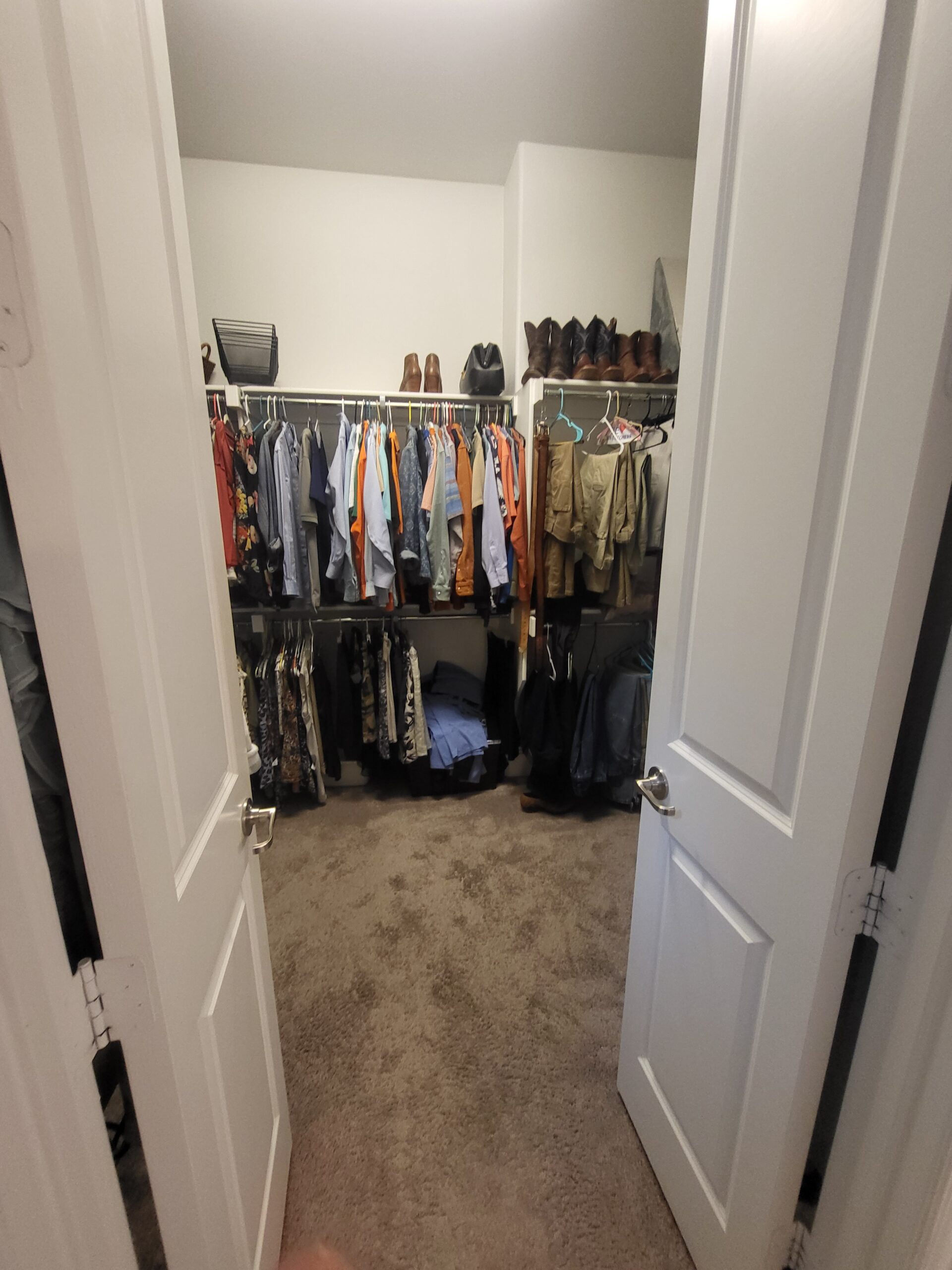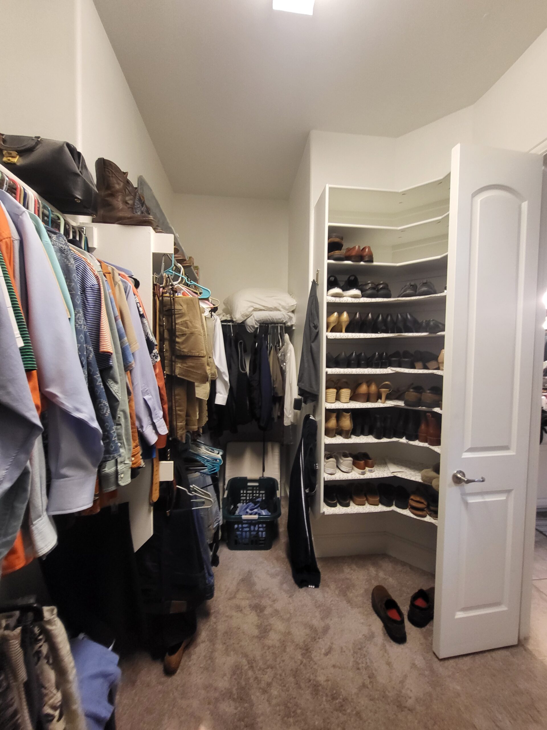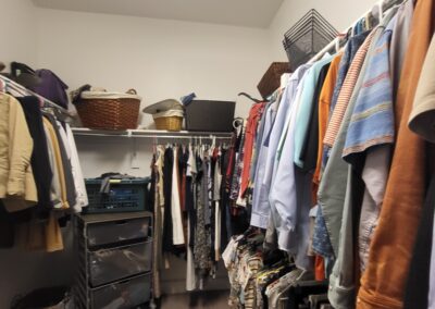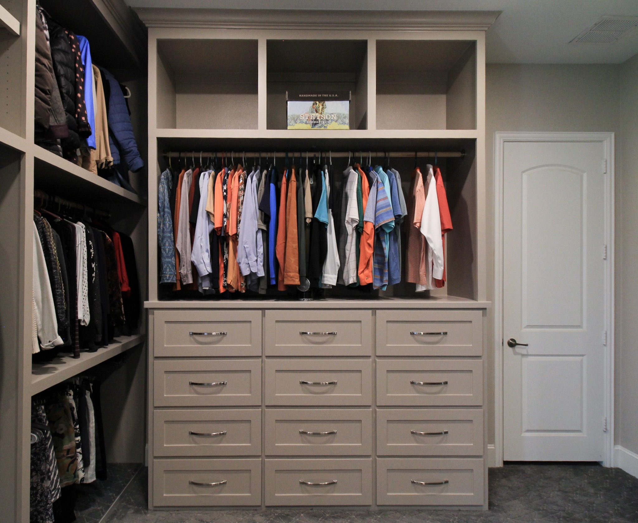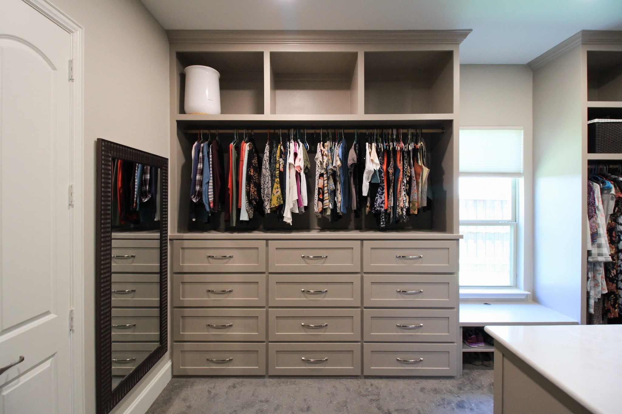 Our clients in Colleyville had a spare bedroom they weren’t using and a master closet that was too small. After looking at a few options with one of our in-house designers, they decided to expand their master closet into the guest bedroom right behind it. We helped them create a roomy master closet with custom cabinets and an island. After removing the separating walls, we installed all new custom cabinetry, a quartz countertop, new carpet flooring, and finished the project with new paint.