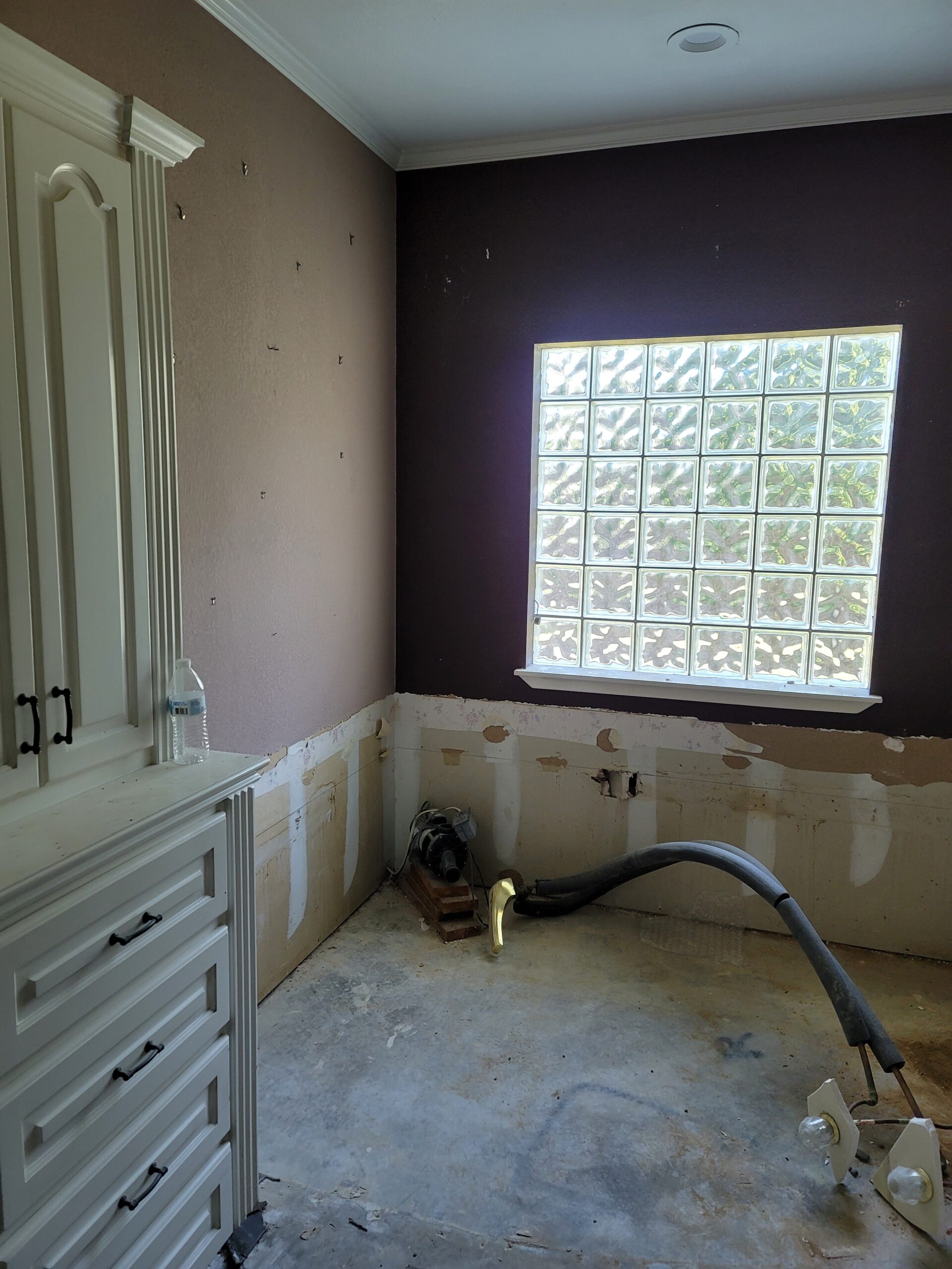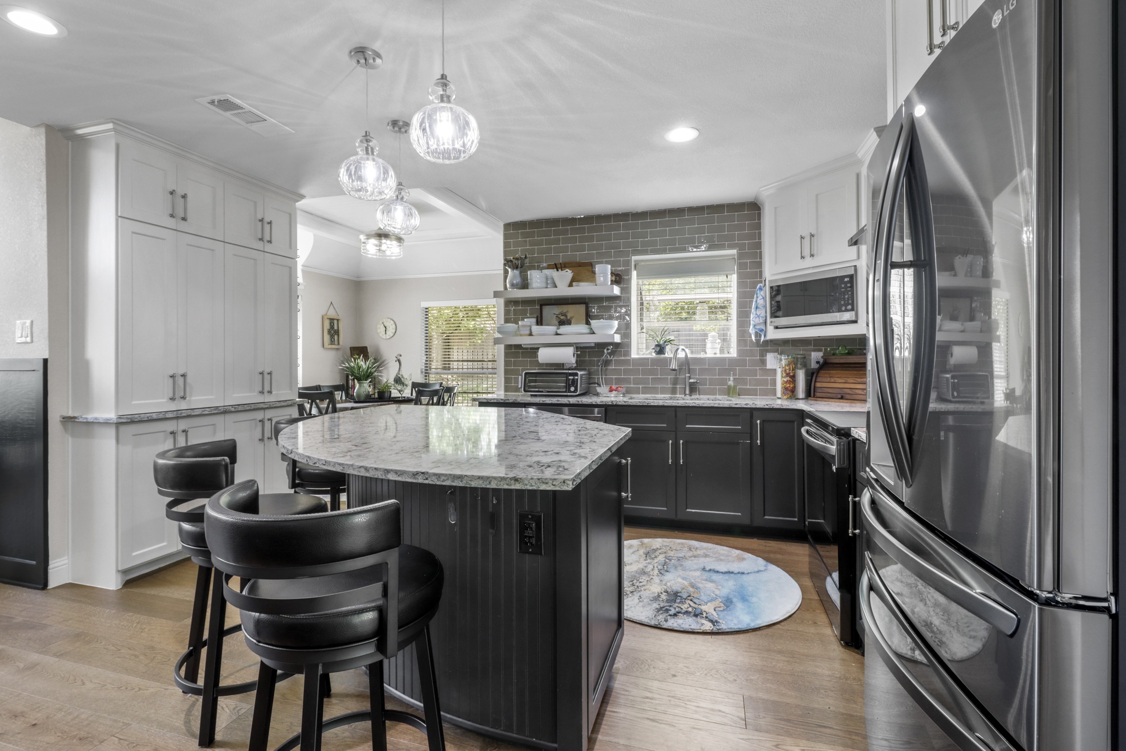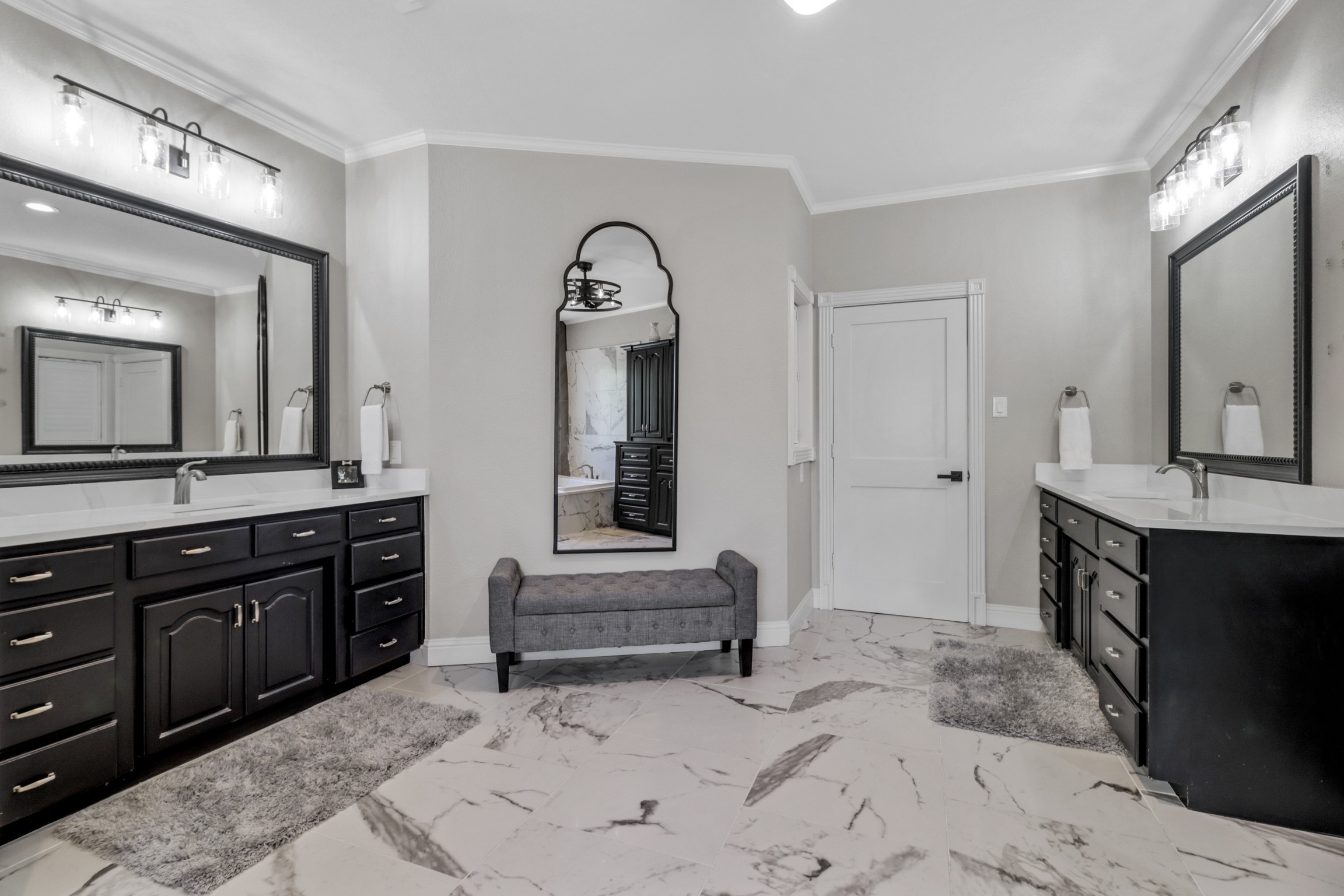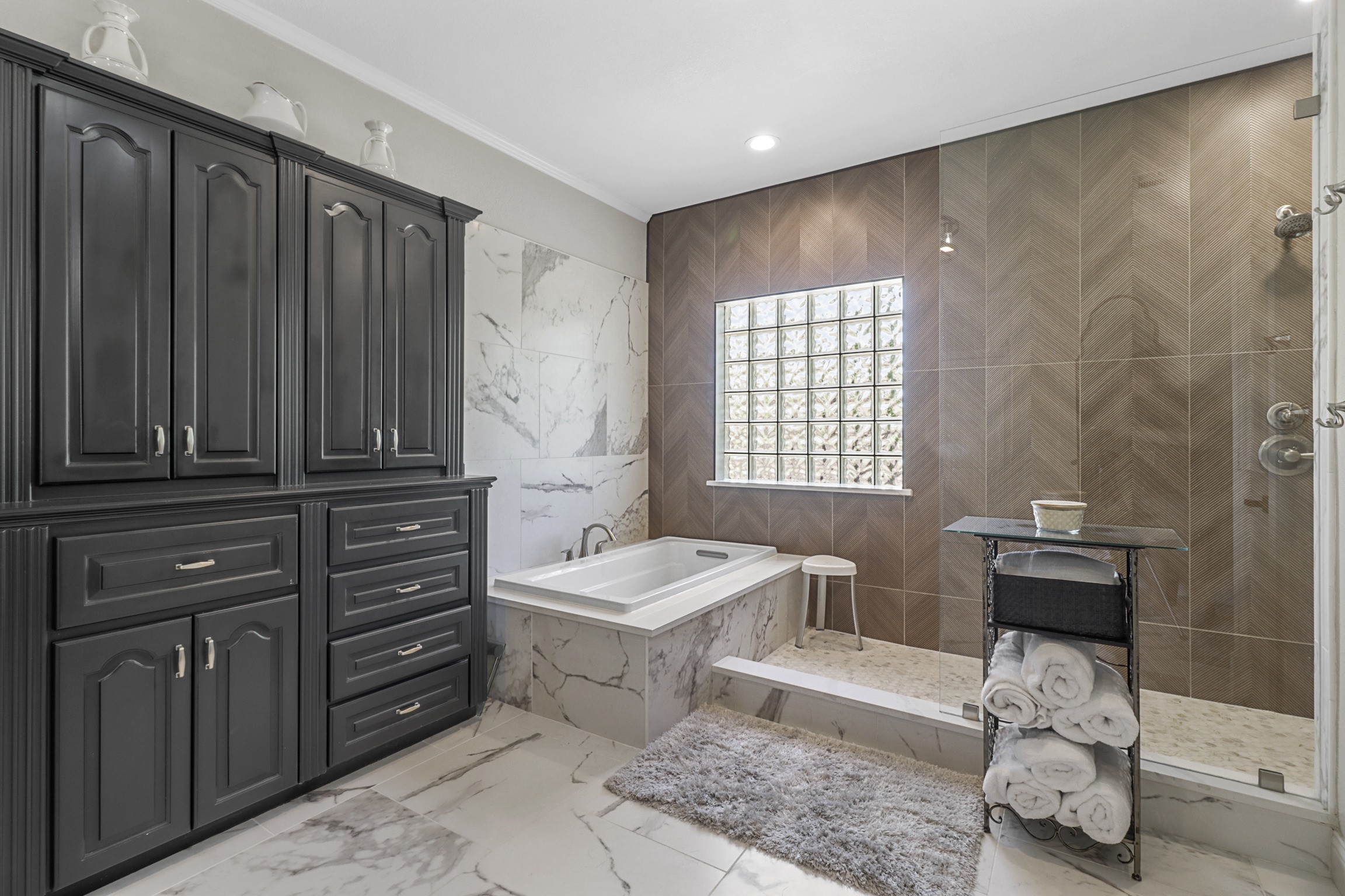 A fire broke out in this client’s attic in Colleyville. The fire caused a large part of the upstairs to be reframed, reinsulated and reworked, so the clients took it as an opportunity to renovate their entire home. These clients had been taken advantage of by another construction company and were looking for a trustworthy contractor, so an external designer brought us into the project. Downstairs, we removed the wall separating the kitchen from the living area and built a new 12-foot stacked stone fireplace. In the kitchen, we installed custom cabinets, a custom curved island with beadboard accents, granite countertops, and a subway tile backsplash. We opened up the dining room to the kitchen and installed a dark board and batten wainscoting. In their primary bathroom, we build a custom 10′-0″ shower with a drop in tub next to it. We painted the existing vanities and installed new quartz countertops.