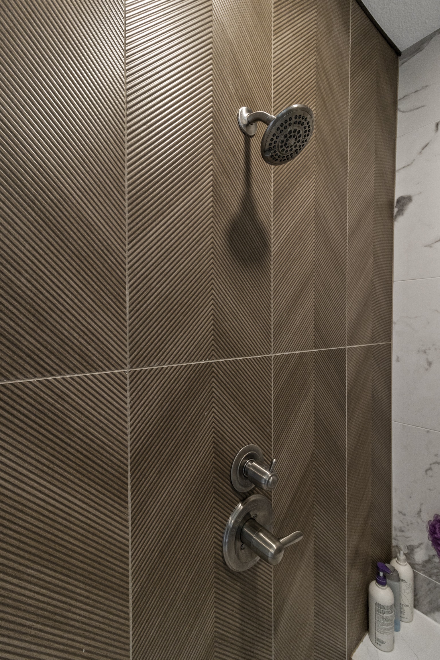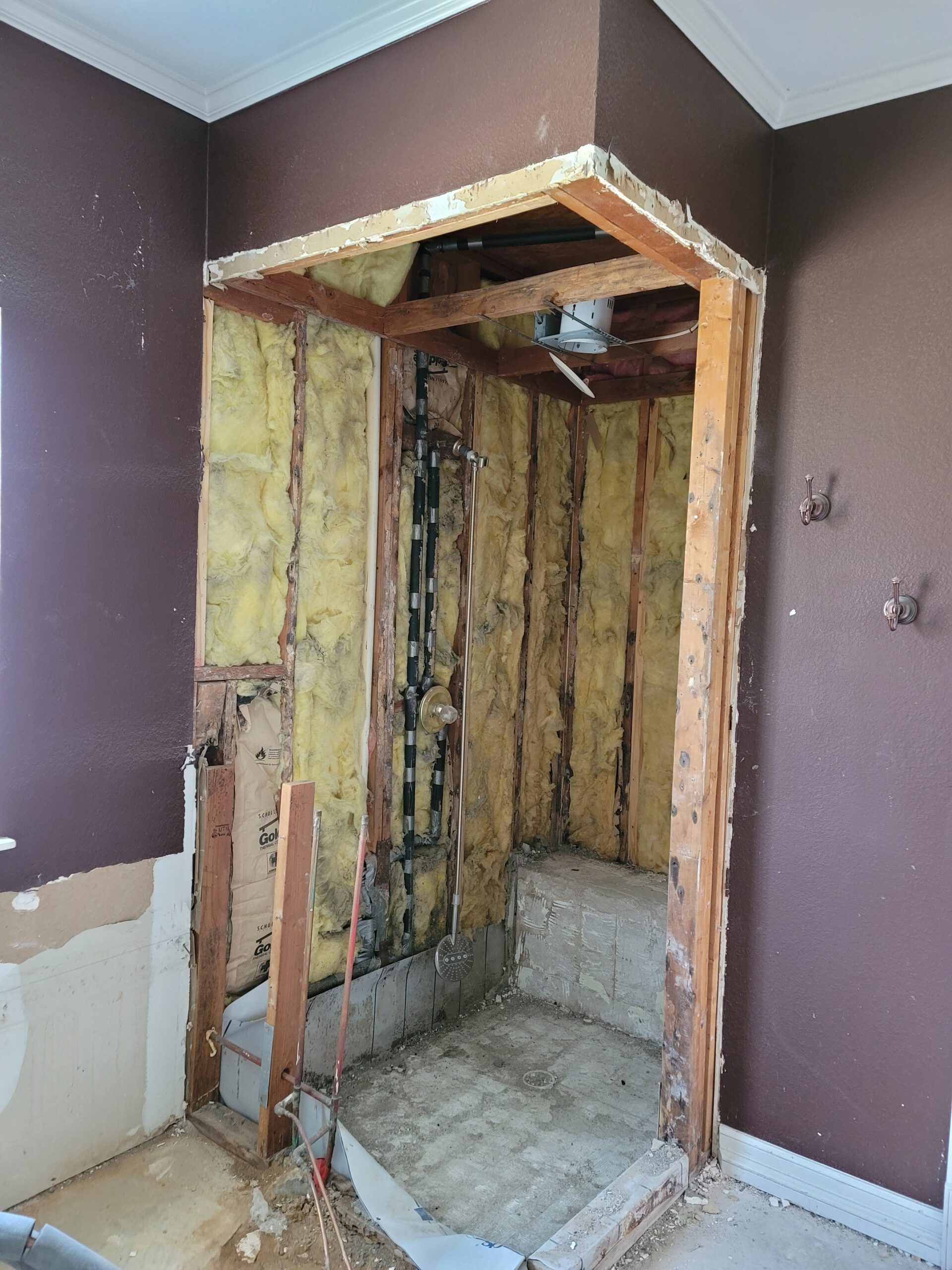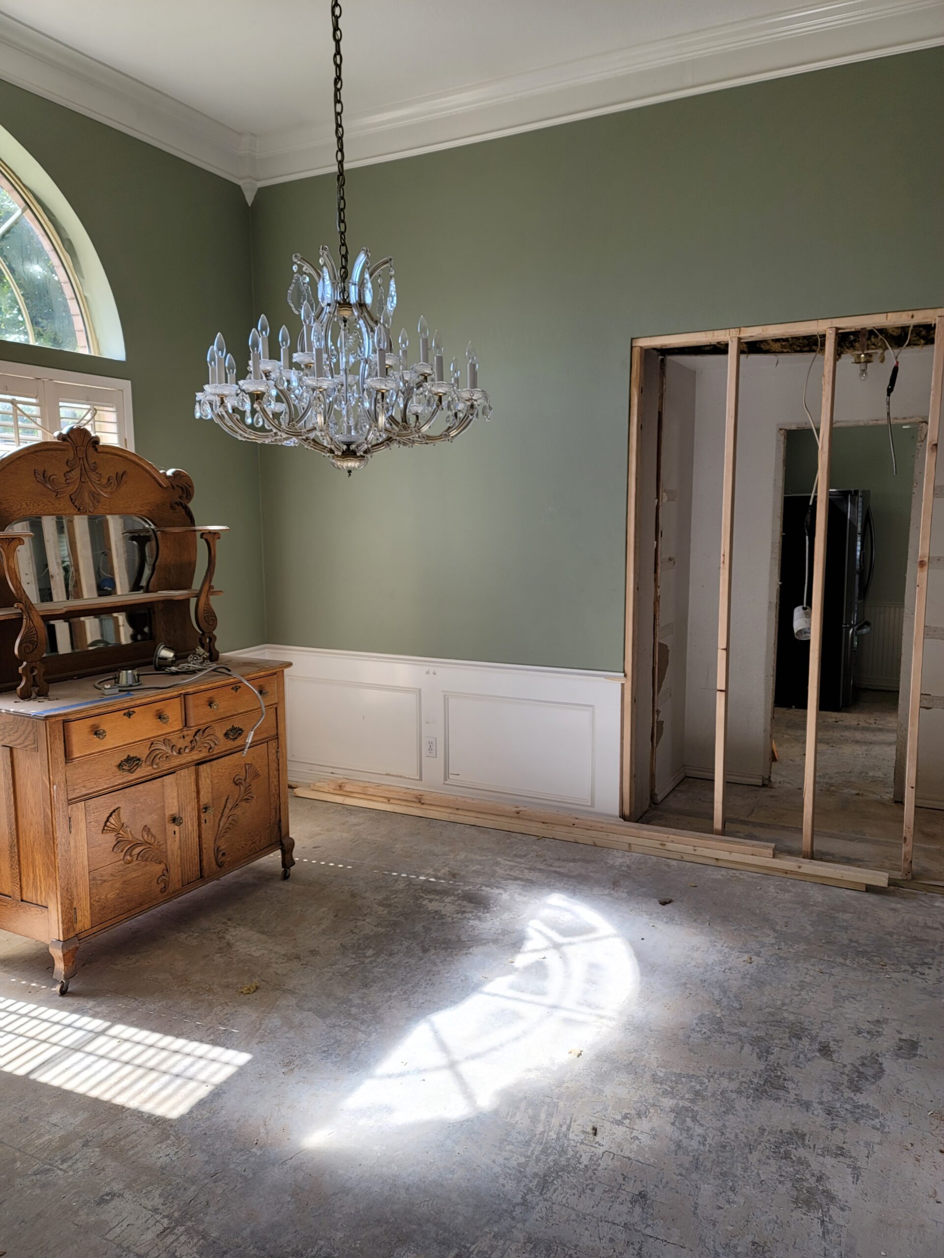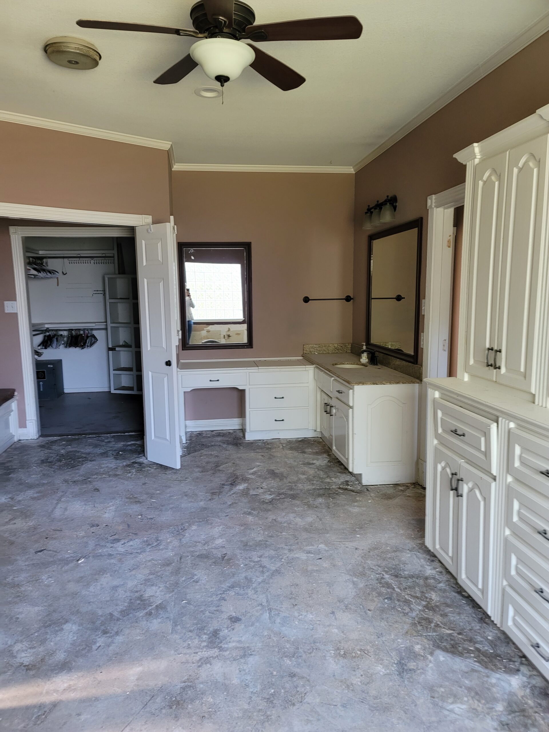A fire broke out in this client’s attic in Colleyville. The fire caused a large part of the upstairs to be reframed, reinsulated and reworked, so the clients took it as an opportunity to renovate their entire home. These clients had been taken advantage of by another construction company and were looking for a trustworthy contractor, so an external designer brought us into the project. Downstairs, we removed the wall separating the kitchen from the living area and built a new 12-foot stacked stone fireplace. In the kitchen, we installed custom cabinets, a custom curved island with beadboard accents, granite countertops, and a subway tile backsplash. We opened up the dining room to the kitchen and installed a dark board and batten wainscoting. In their primary bathroom, we build a custom 10′-0″ shower with a drop in tub next to it. We painted the existing vanities and installed new quartz countertops.