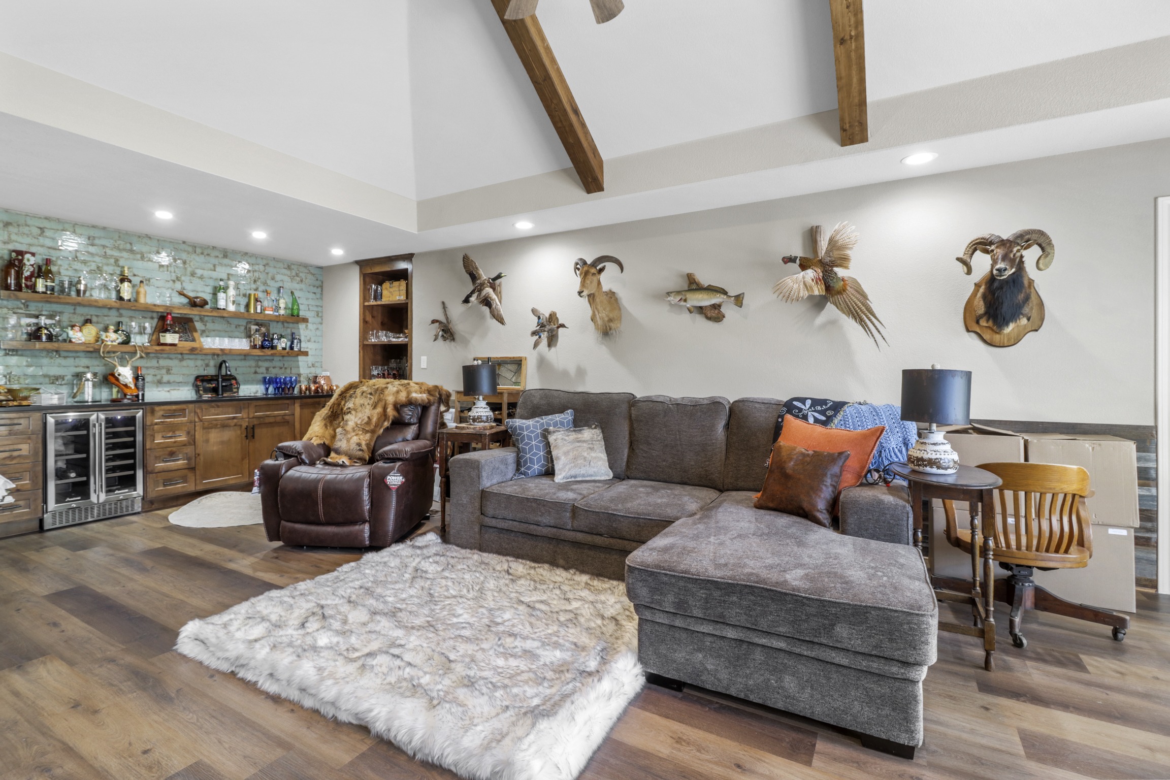 We also worked in the man cave/den upstairs, installing custom stained cabinets with a wet bar. We also built and installed the stained ceiling beams.