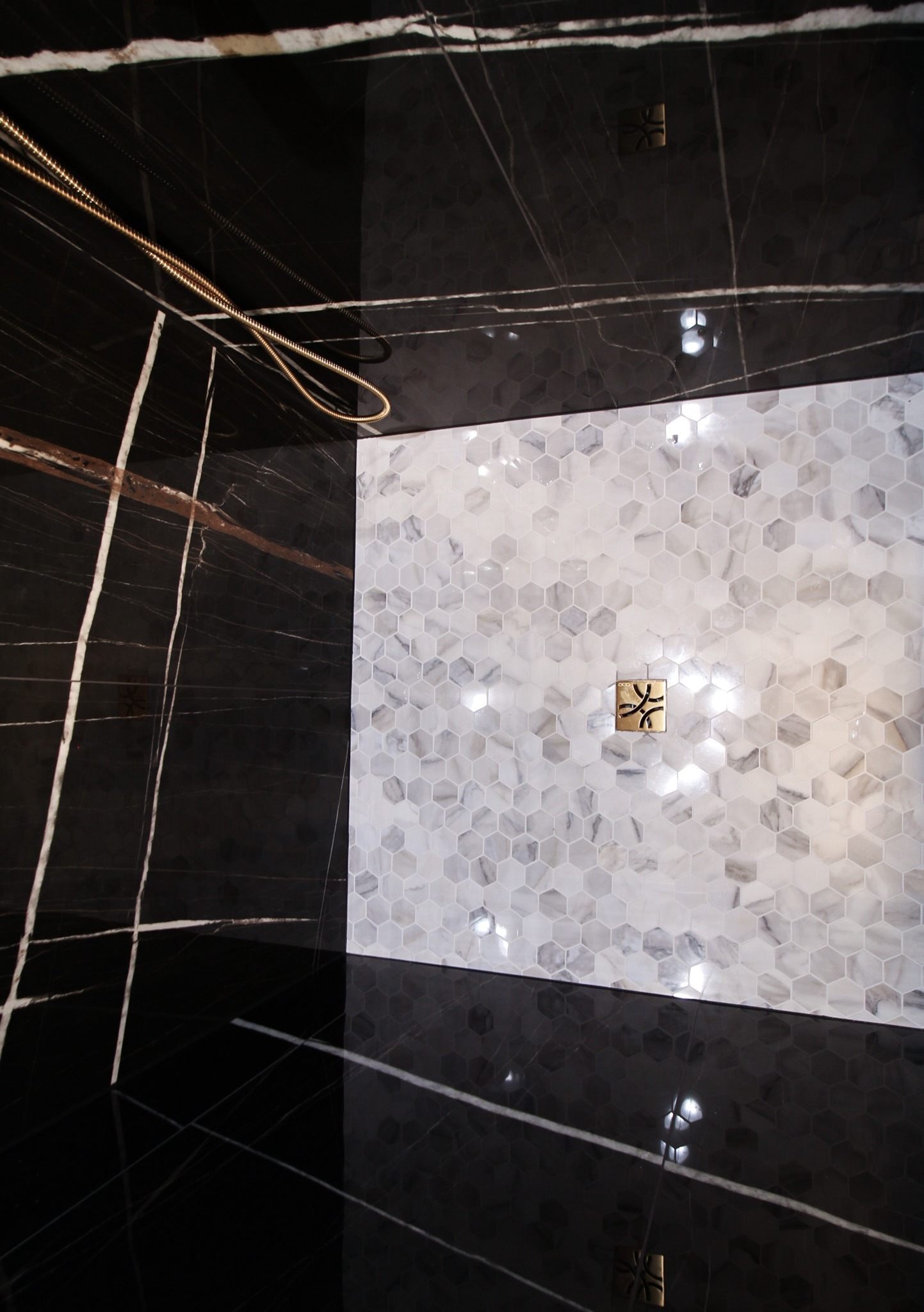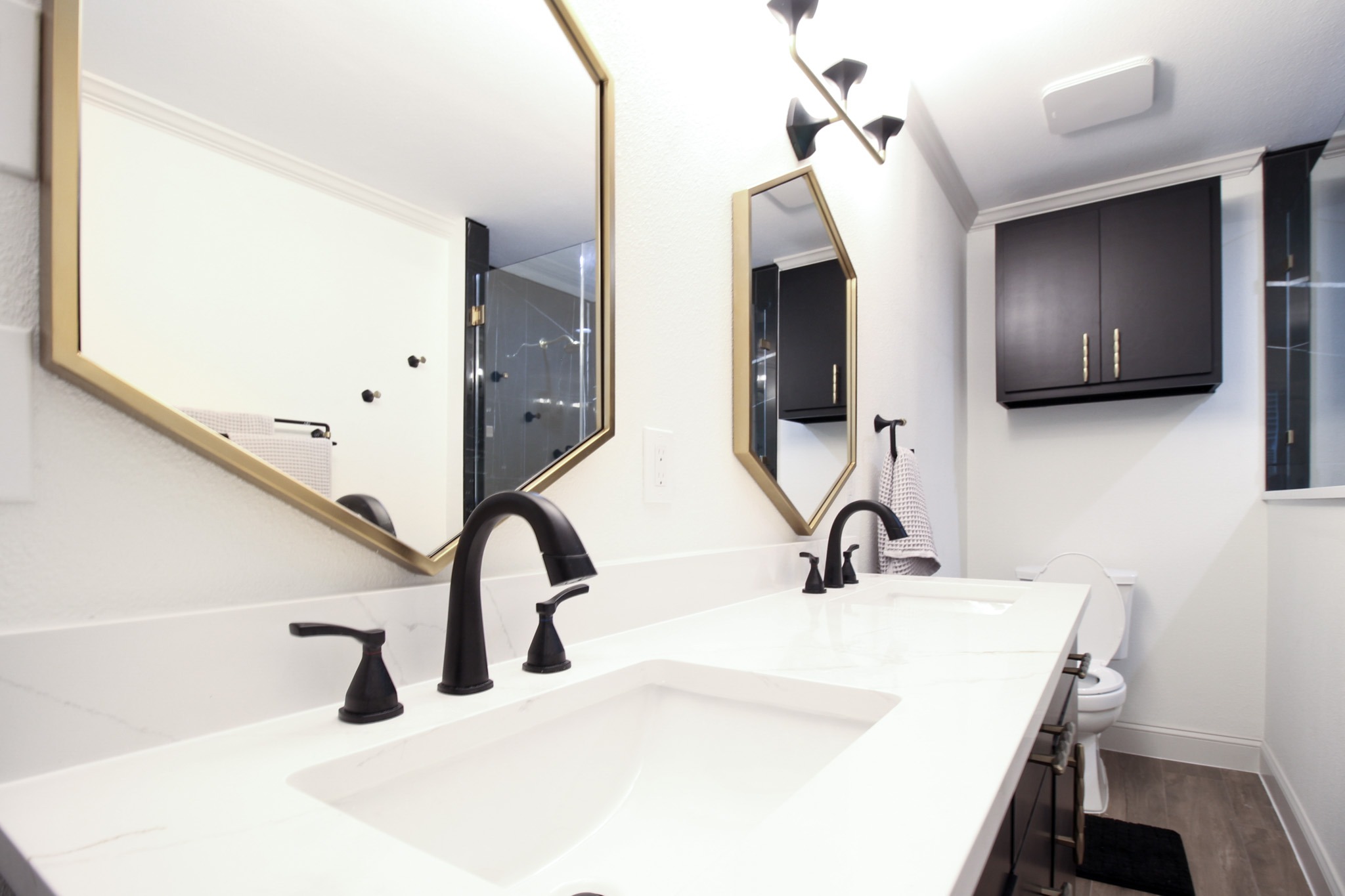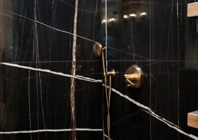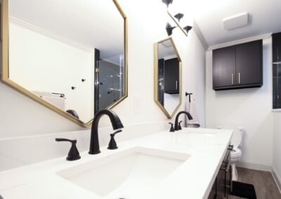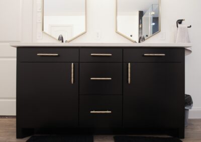 We love the deep contrast in this modern bathroom transformation. the large-format, high-gloss shower wall tiles, and the contemporary flat-panel vanity cabinets make a bold statement. The wood-look tile floors and matching shower shelves add a layer of warmth to the room. We also love the look of the quartz countertops and the mixed gold and black hardware. We are so happy we could help bring this client’s vision to life!