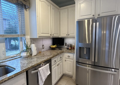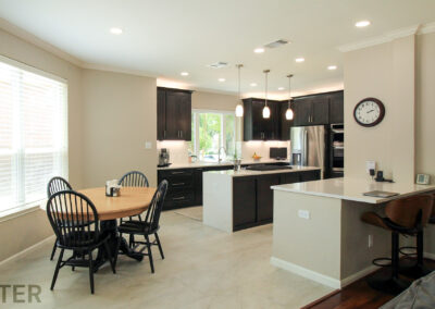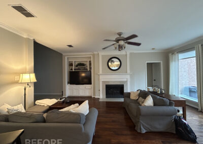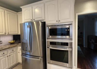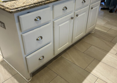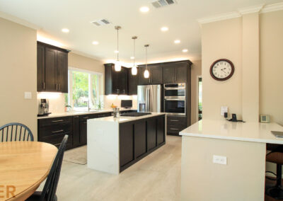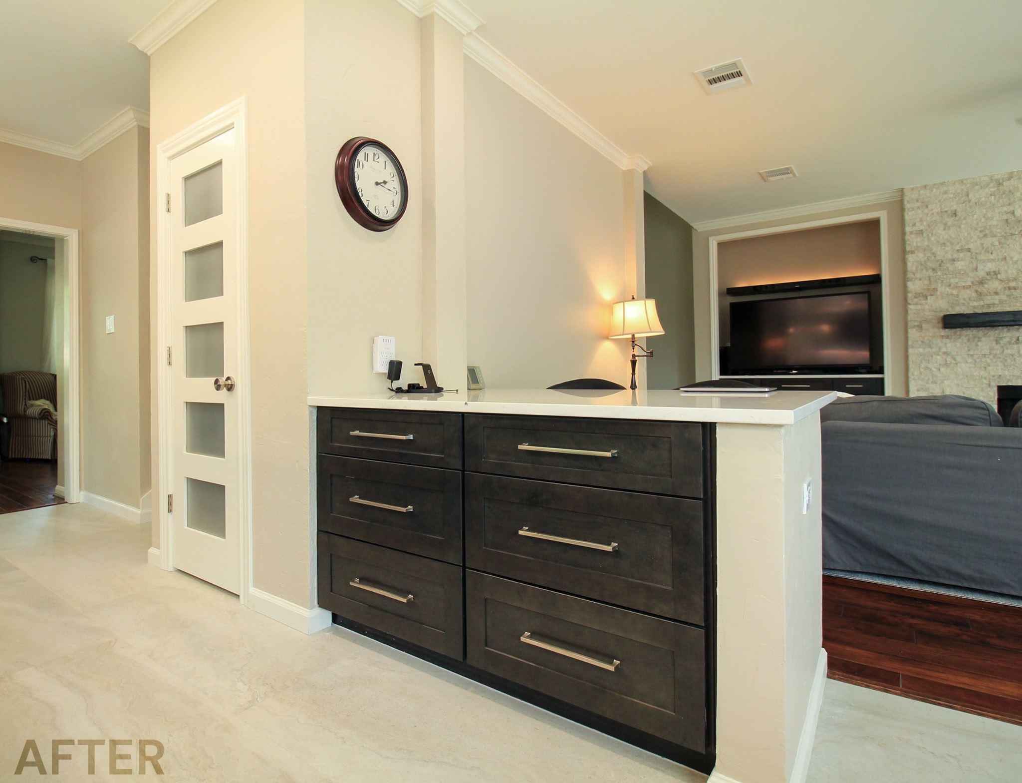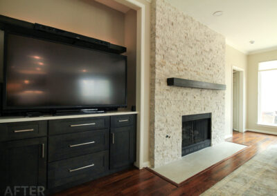 While we were replacing the cabinets in their kitchen, we also helped these clients update the media center and fireplace in the living room. The new fireplace stone and custom-stained mantel made a huge difference!