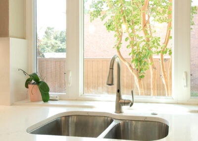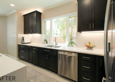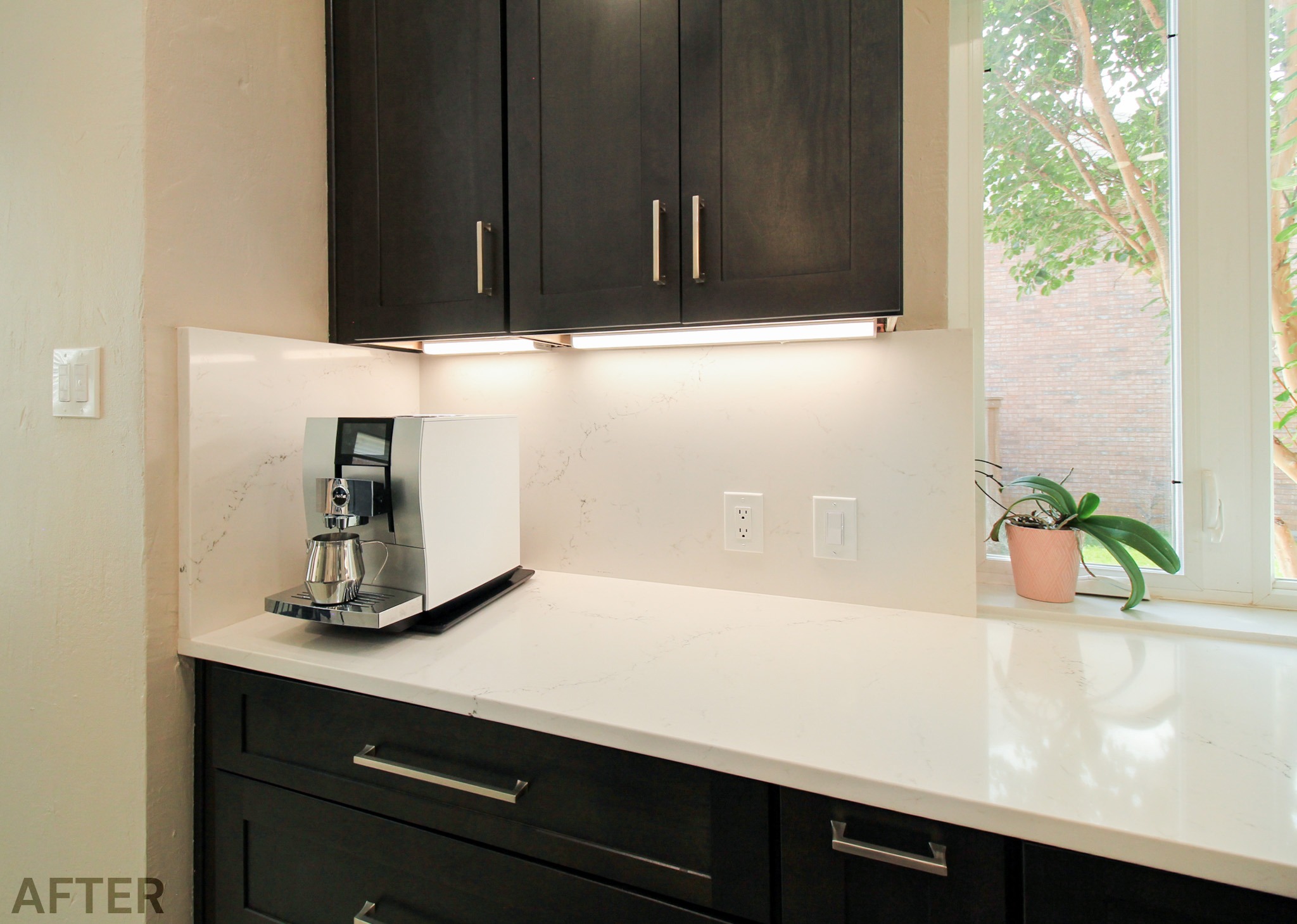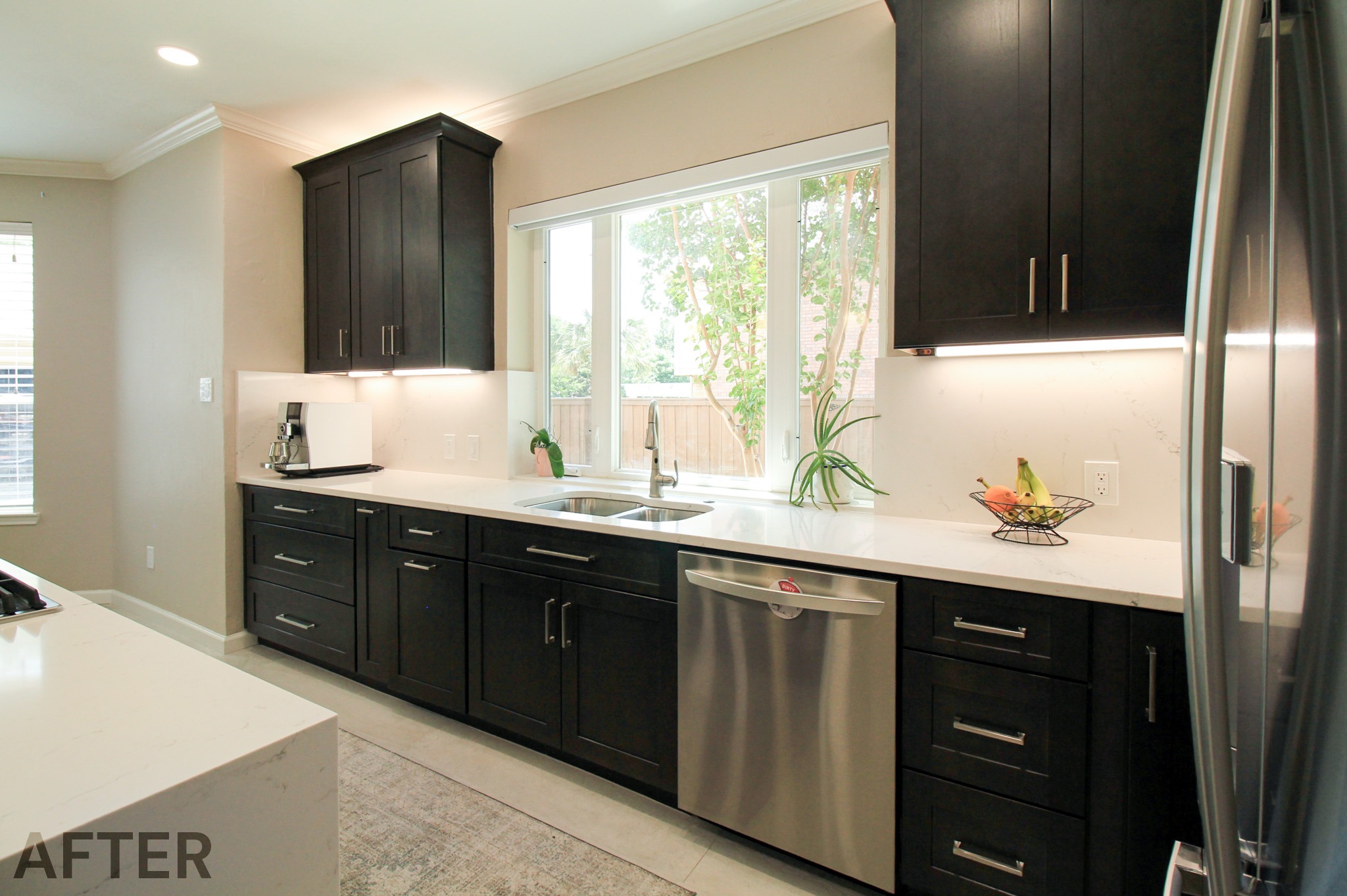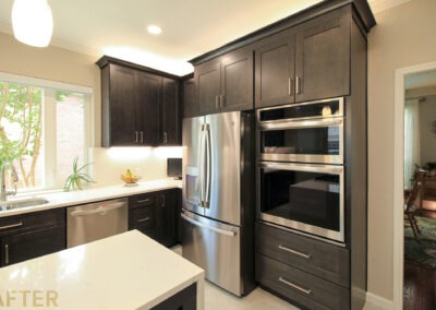 They had outgrown the white cabinets, so we helped them choose a ready-made cabinet with a darker stained look. The quartz backsplash and waterfall countertops give this kitchen a sleek, bright look. We installed large-format tile flooring, reconfigured the kitchen lighting, and cut down the bar between the kitchen and the living room to create a larger countertop space. We also replaced their basic pantry door with a door with frosted glass.