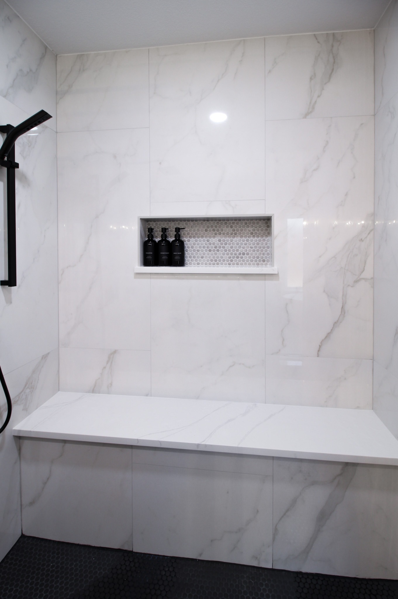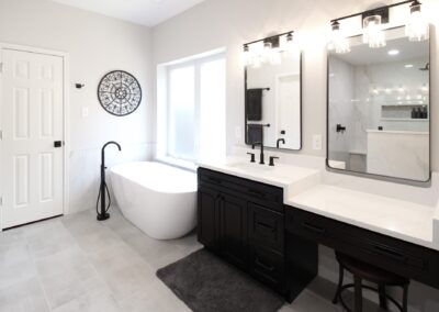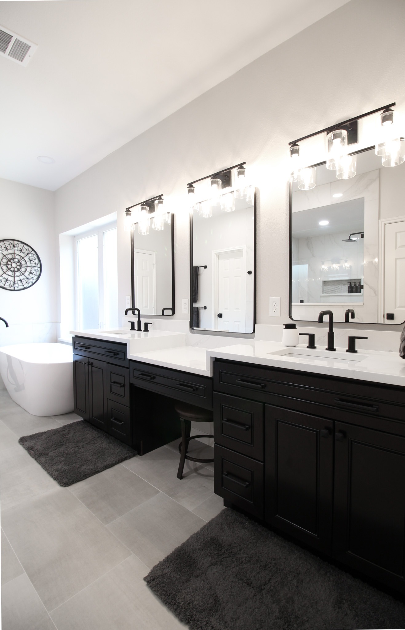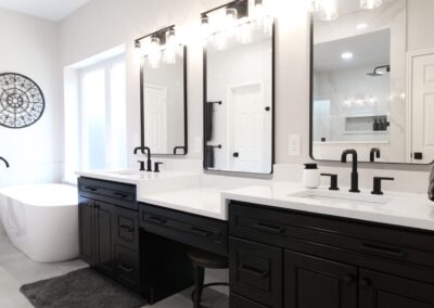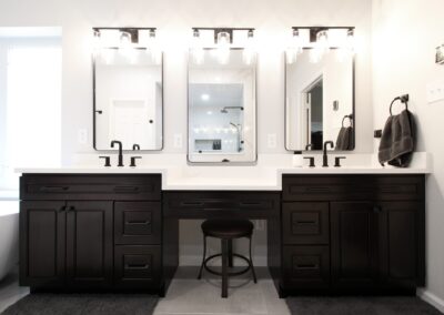 With the small shower and the sunken tub, this bathroom wasn’t very functional. We extended the shower into the linen closet and the empty space behind the existing shower. We configured ready-made cabinets to give our clients a makeup area in the vanity. We love the contrast of the dark cabinets and the large shower tiles.