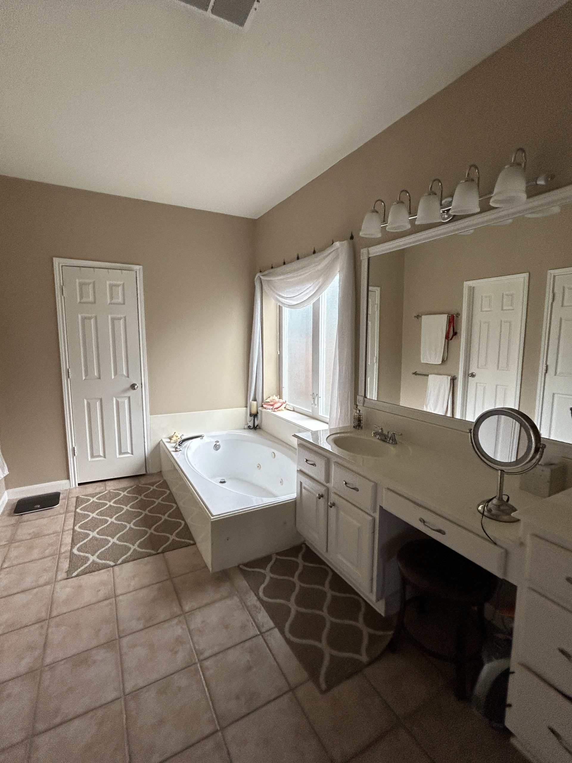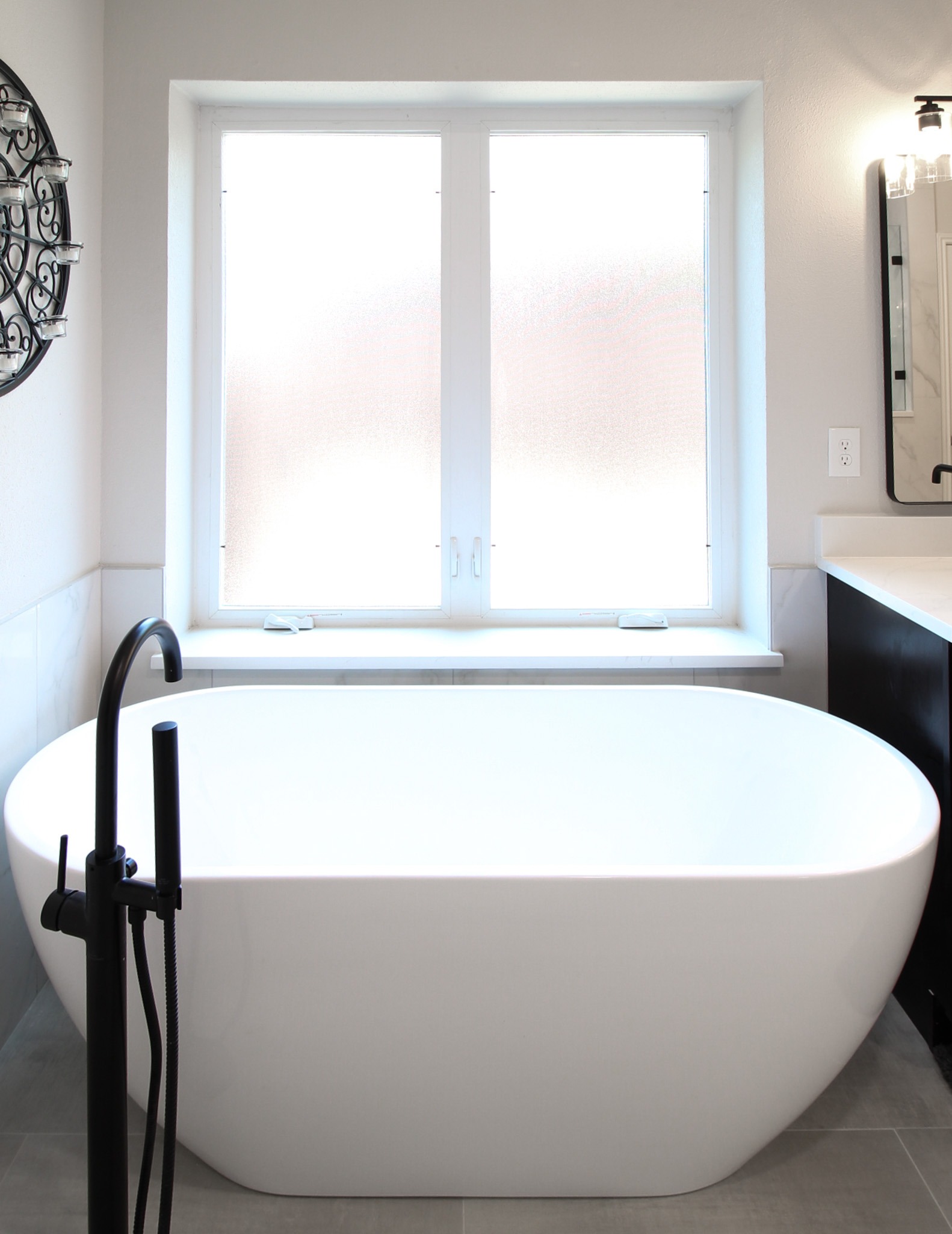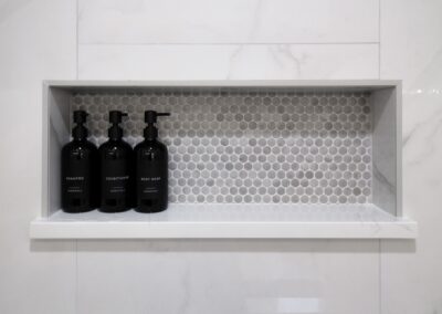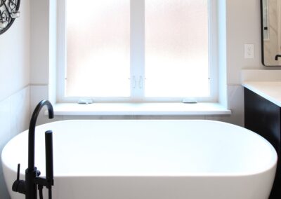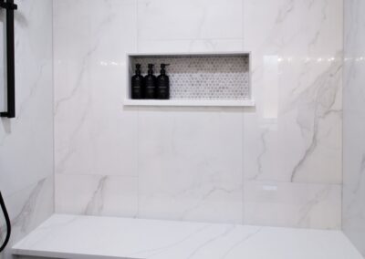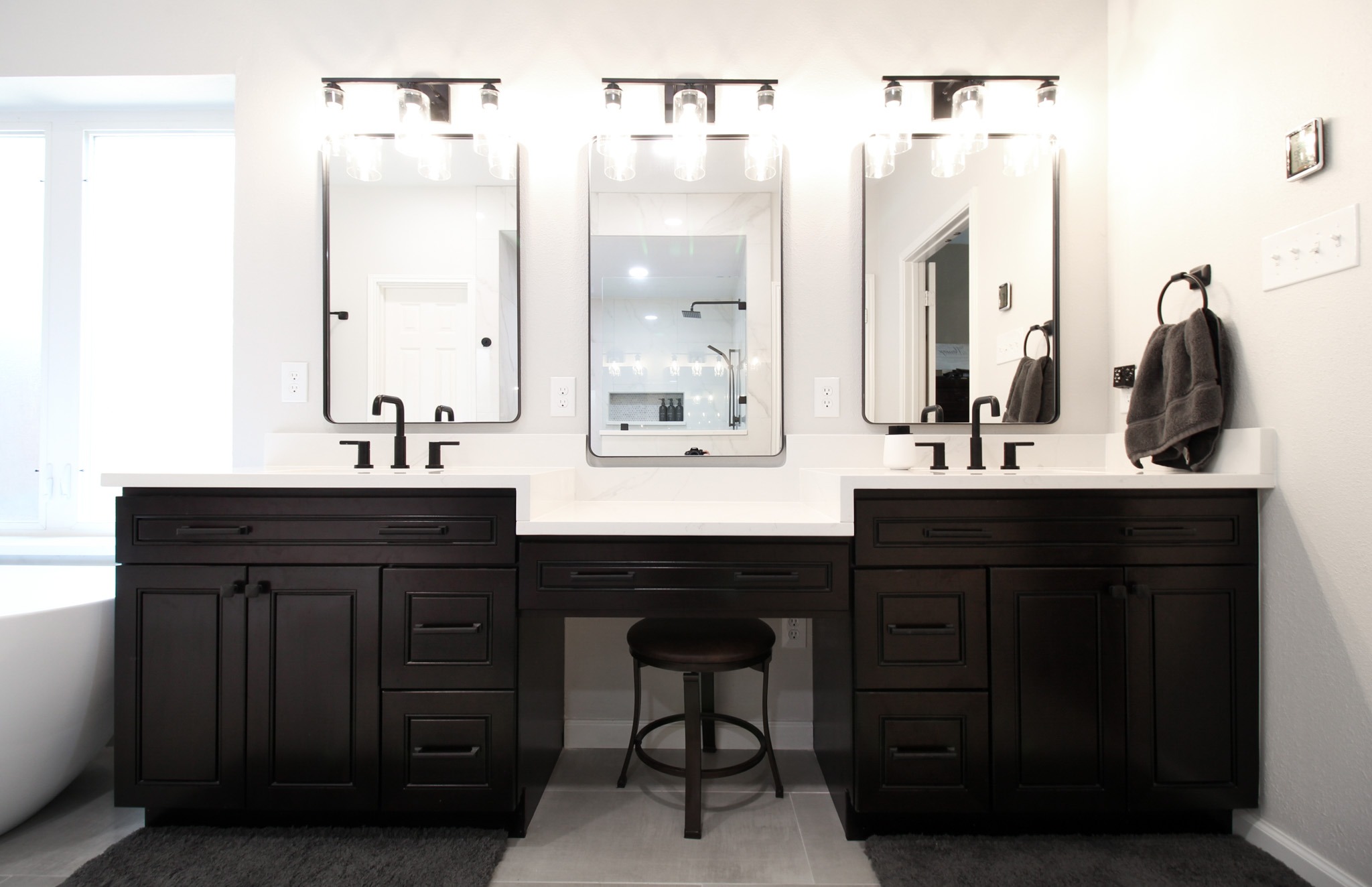 With the small shower and the sunken tub, this bathroom wasn’t very functional. We extended the shower into the linen closet and the empty space behind the existing shower. We configured ready-made cabinets to give our clients a makeup area in the vanity. We love the contrast of the dark cabinets and the large shower tiles.
