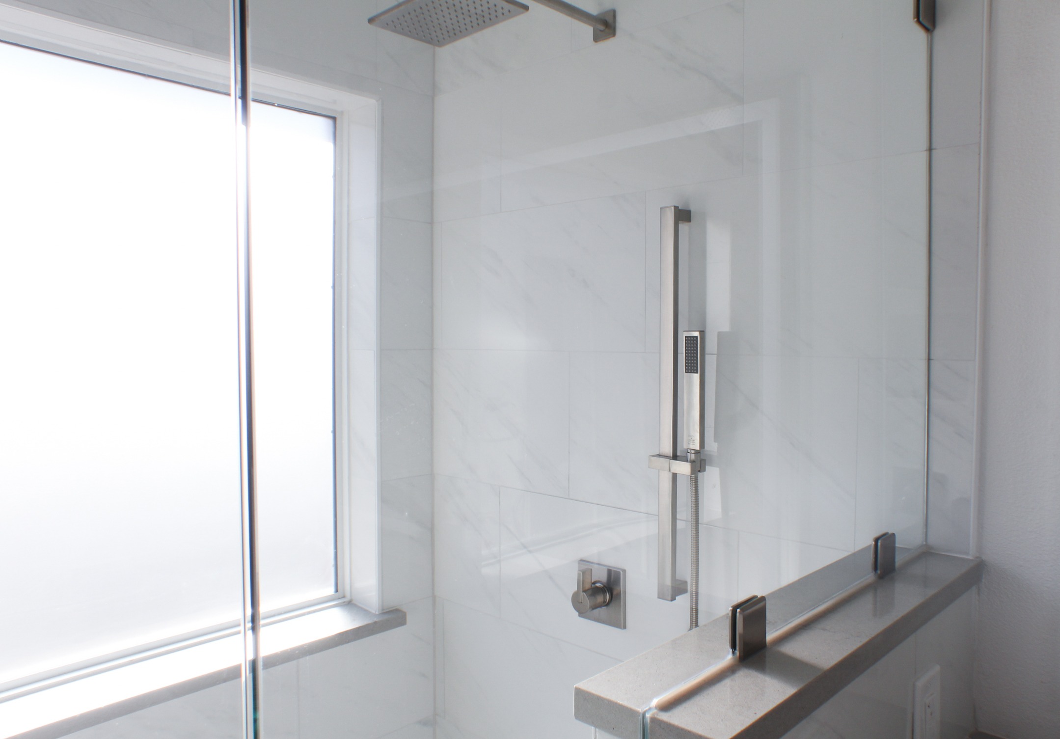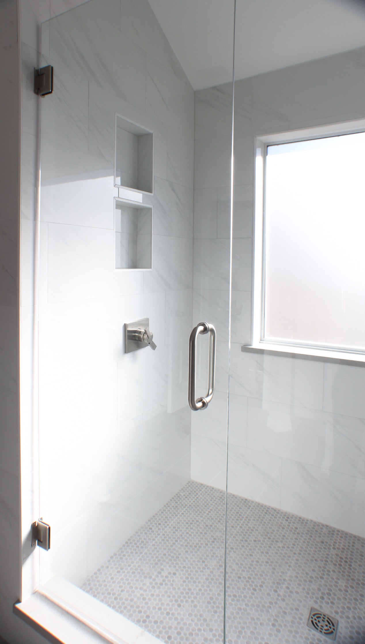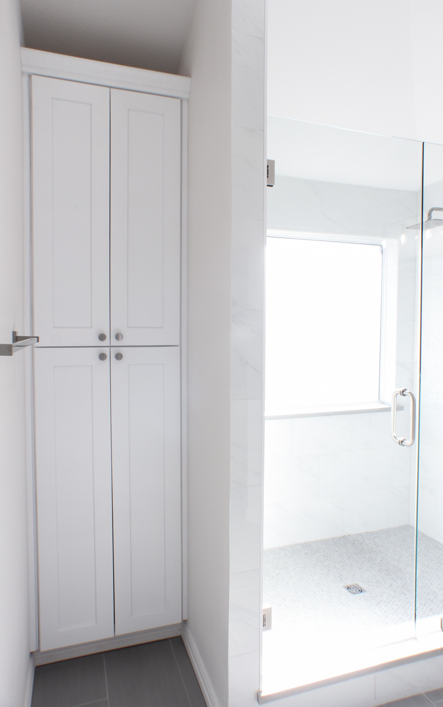 This master bathroom in Fort Worth was similar to many that we see, with an alcove tub and a stand-alone shower. To modernize this space, we replaced the tub with a tiled walk-in shower. Our crews replaced the window glass with frosted glass for privacy and added quartz on the window sill and whoer curb to match the countertops. The clients chose to do ready-made cabinets for the vanity and pantry cabinet, which added more storage.