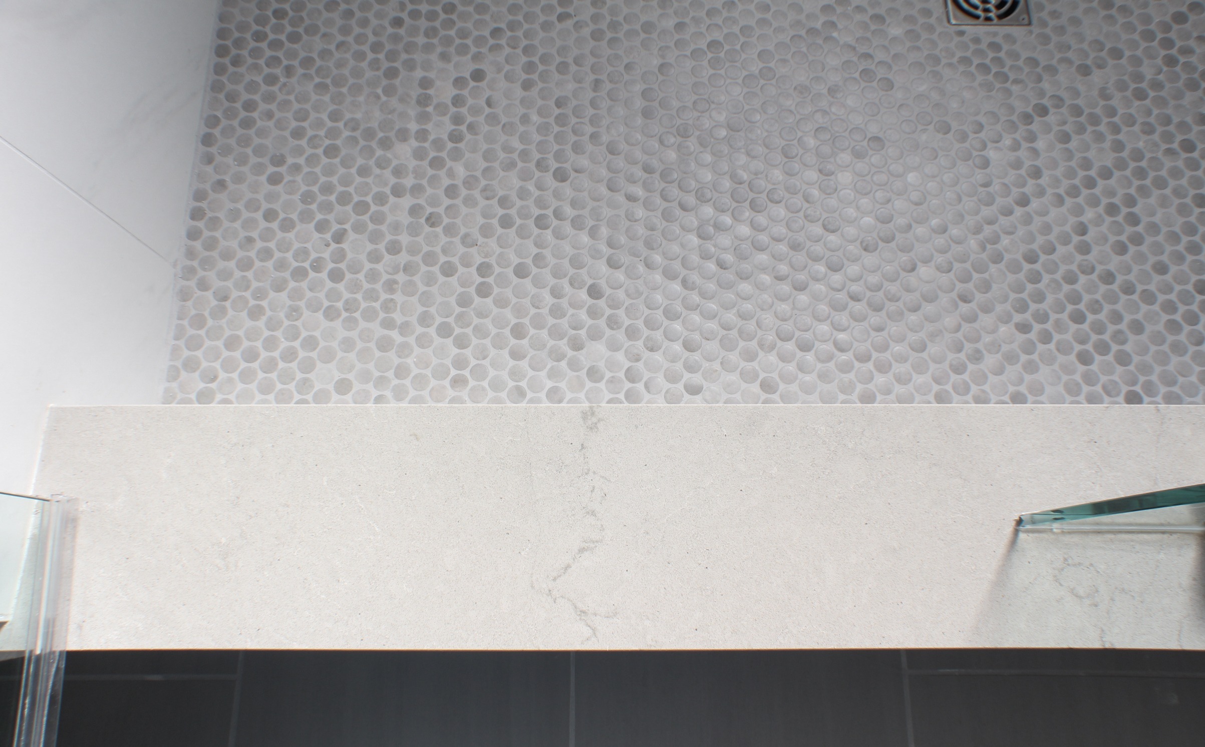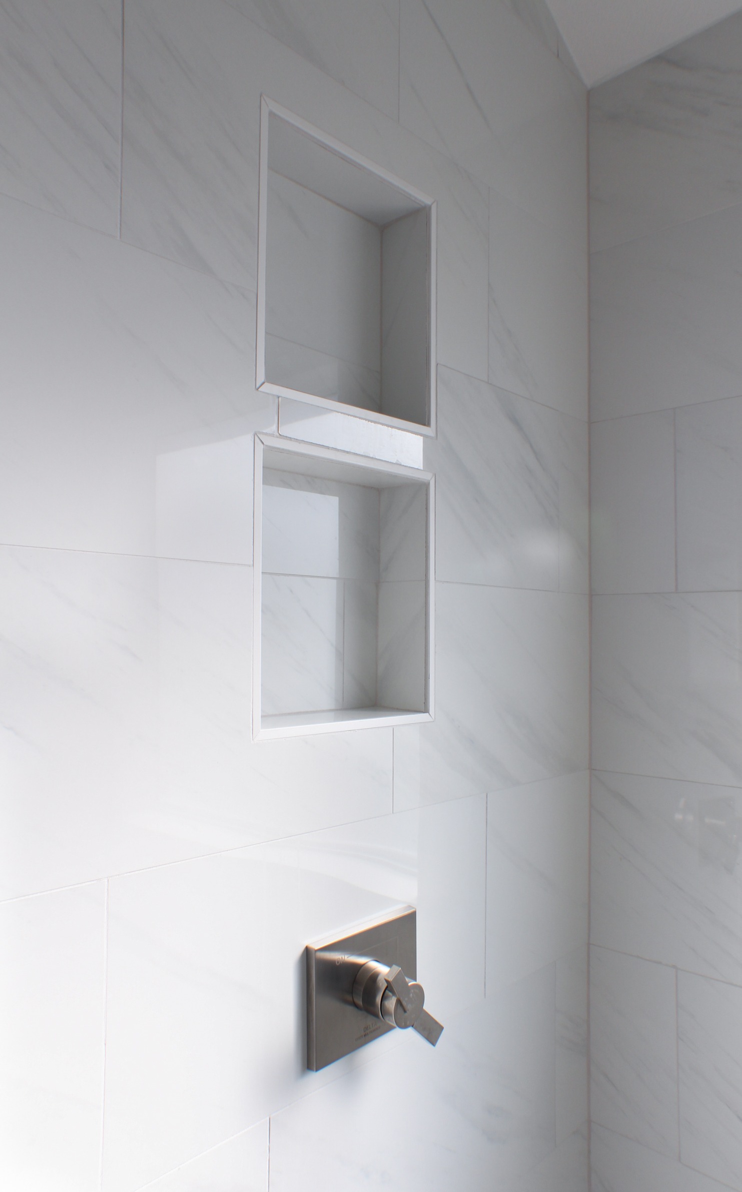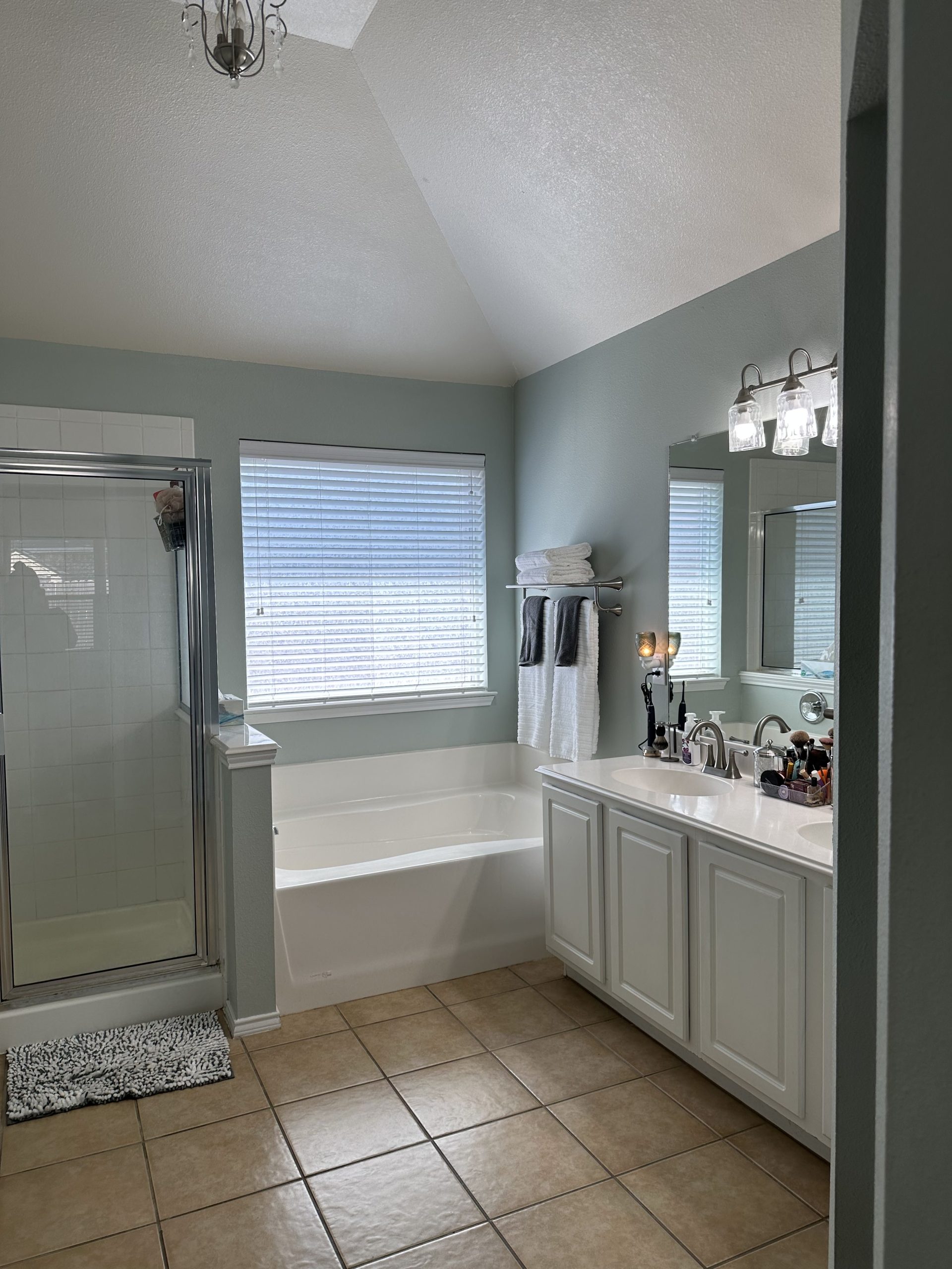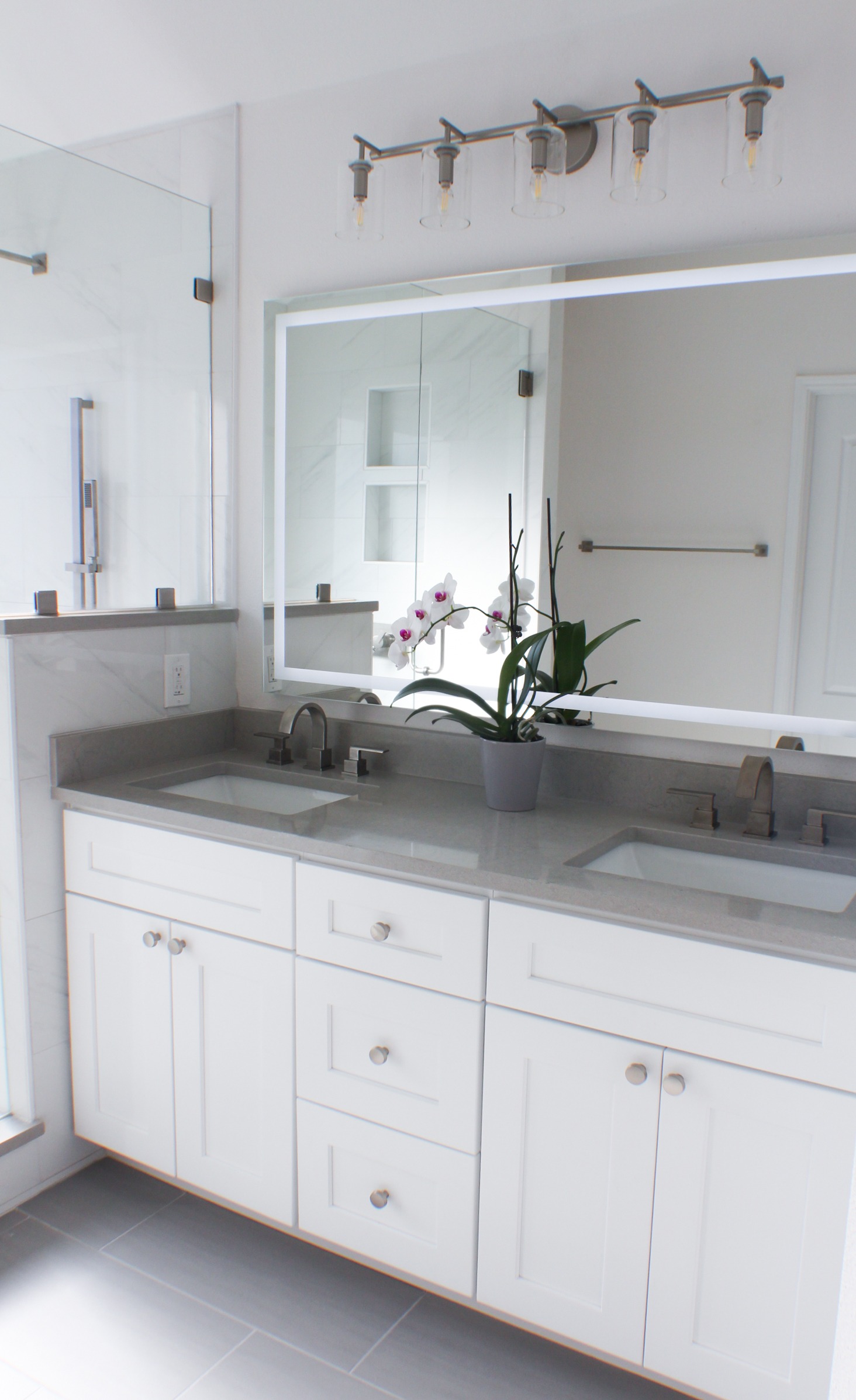 This master bathroom in Fort Worth was similar to many that we see, with an alcove tub and a stand-alone shower. To modernize this space, we replaced the tub with a tiled walk-in shower. Our crews replaced the window glass with frosted glass for privacy and added quartz on the window sill and whoer curb to match the countertops. The clients chose to do ready-made cabinets for the vanity and pantry cabinet, which added more storage.