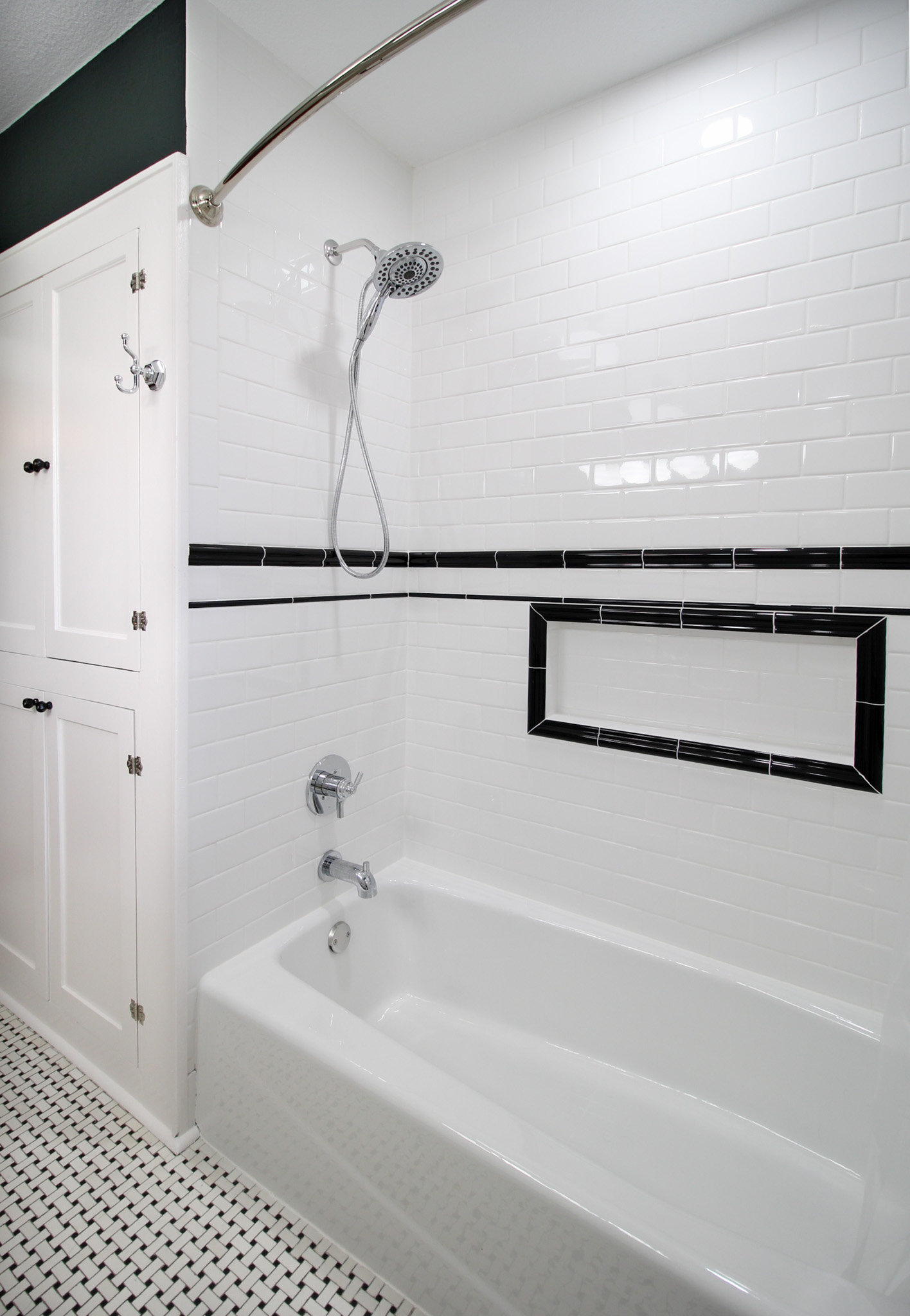 This Fort Worth homeowner takes a lot of pride in his 1920’s home, so it was very important to update this bathroom to be accurate to that time period. The client worked with one of our in-house designers to decide on this sleek, black-and-white tile design that brought life back to this bathroom while keeping the integrity of the time period. By making a few adjustments along the way we were able to keep the marble mosaic flooring that was original to the house.