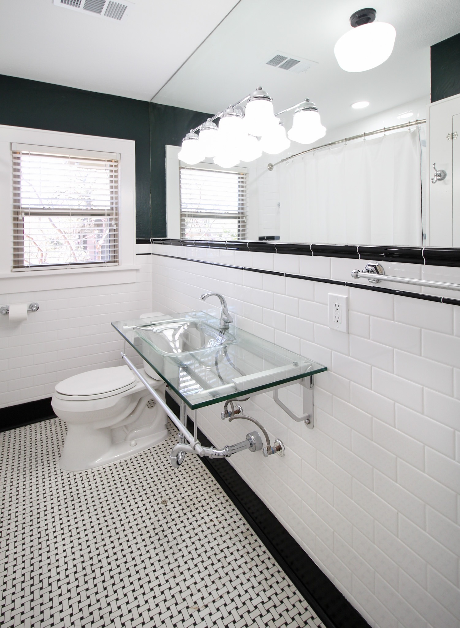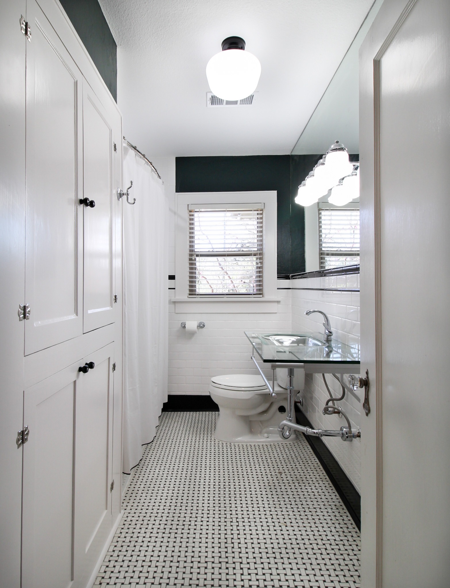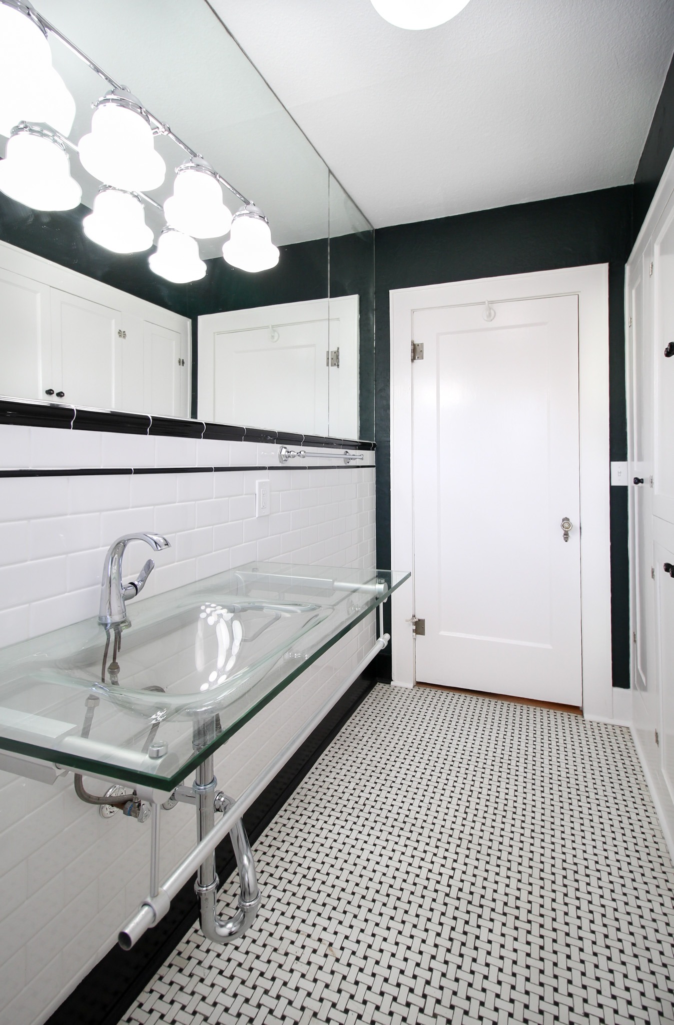 We had never seen a sink quite like the glass one in this bathroom, so the homeowner chose to keep it. One of our craftsmen installed a custom tile design as a wainscot around the room and into the shower. We had custom doors made to replace the louvered doors. We then repainted the cabinets and walls and replaced the light fixtures.