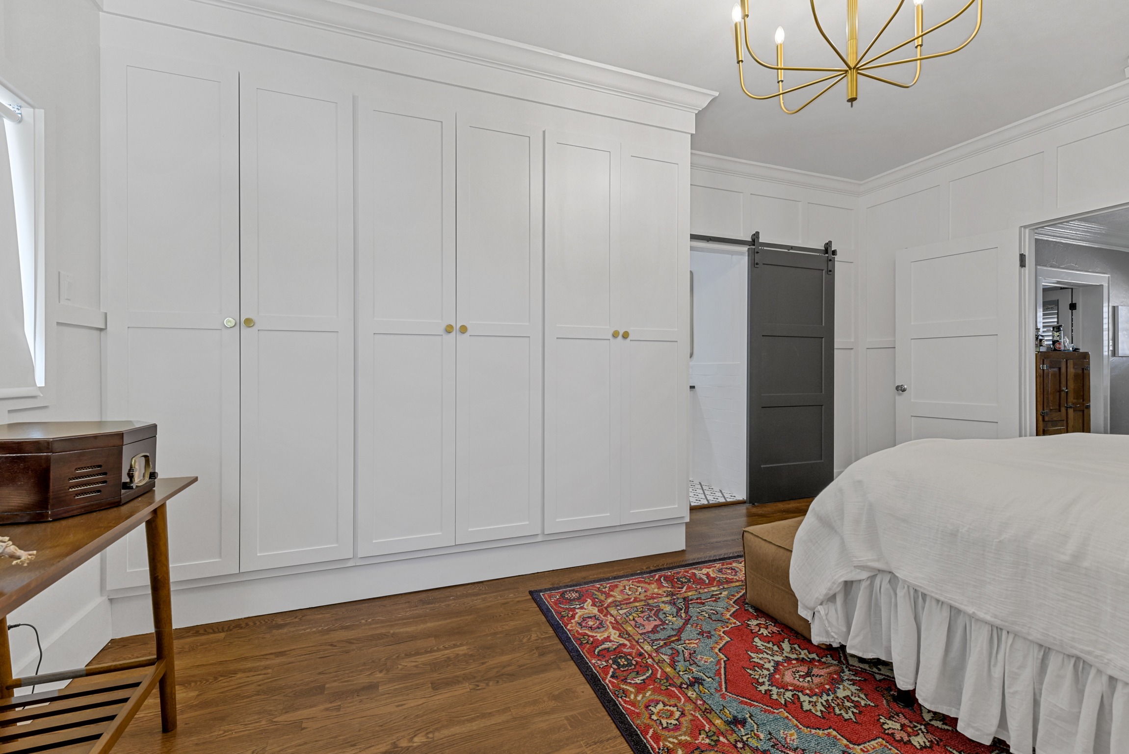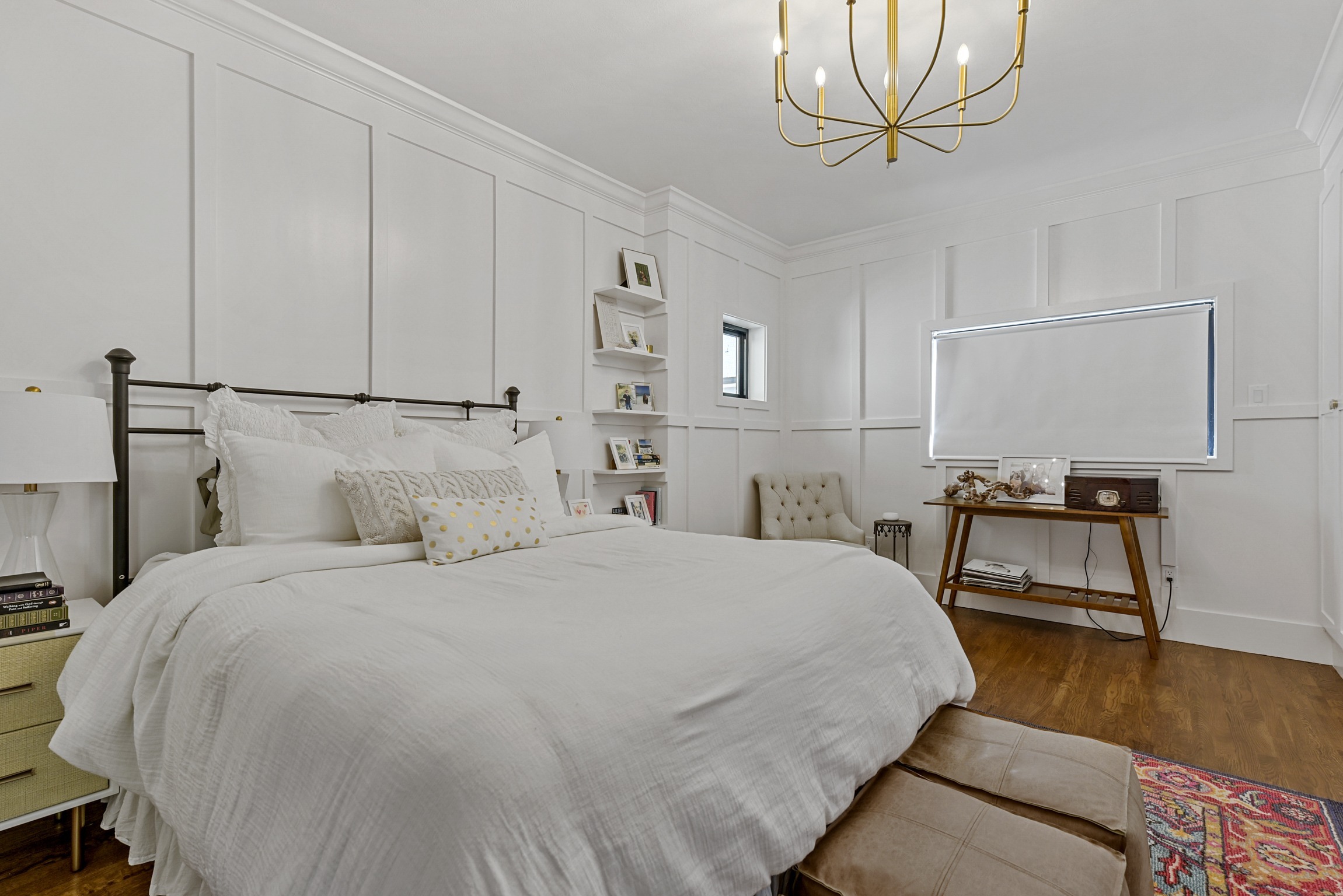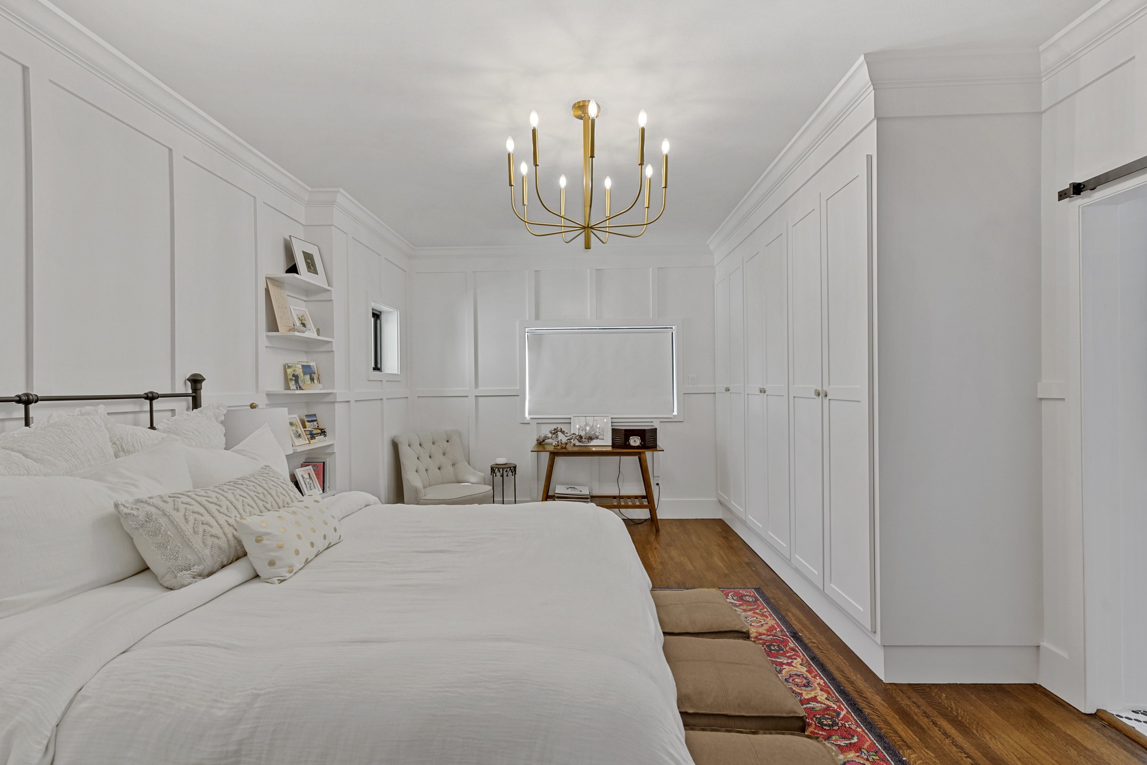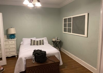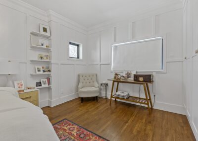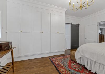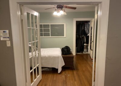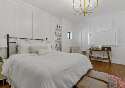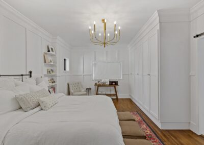 We helped these clients in Fort Worth add some square footage to an originally tiny bedroom. We moved the exterior wall back and added a window. They worked with an outside designer who encouraged the board and batten molding on the walls. This room also has a custom-built master closet and new hardwood floors to match the rest of the house.