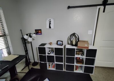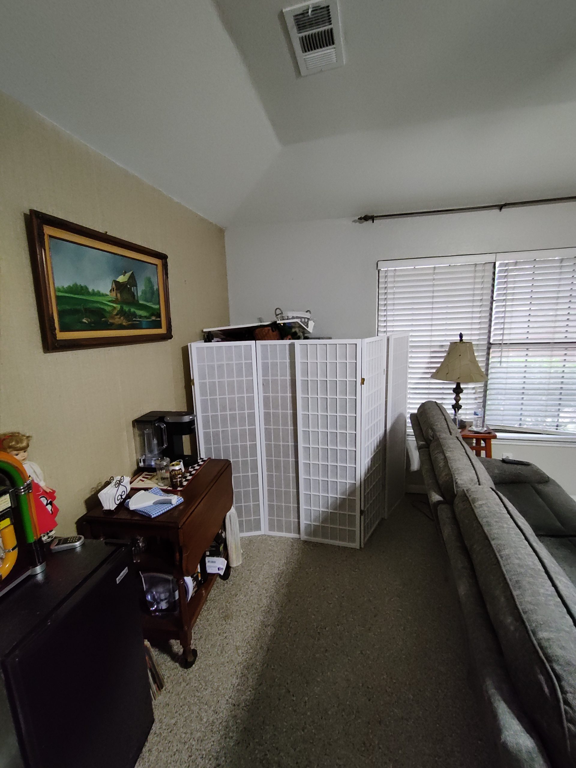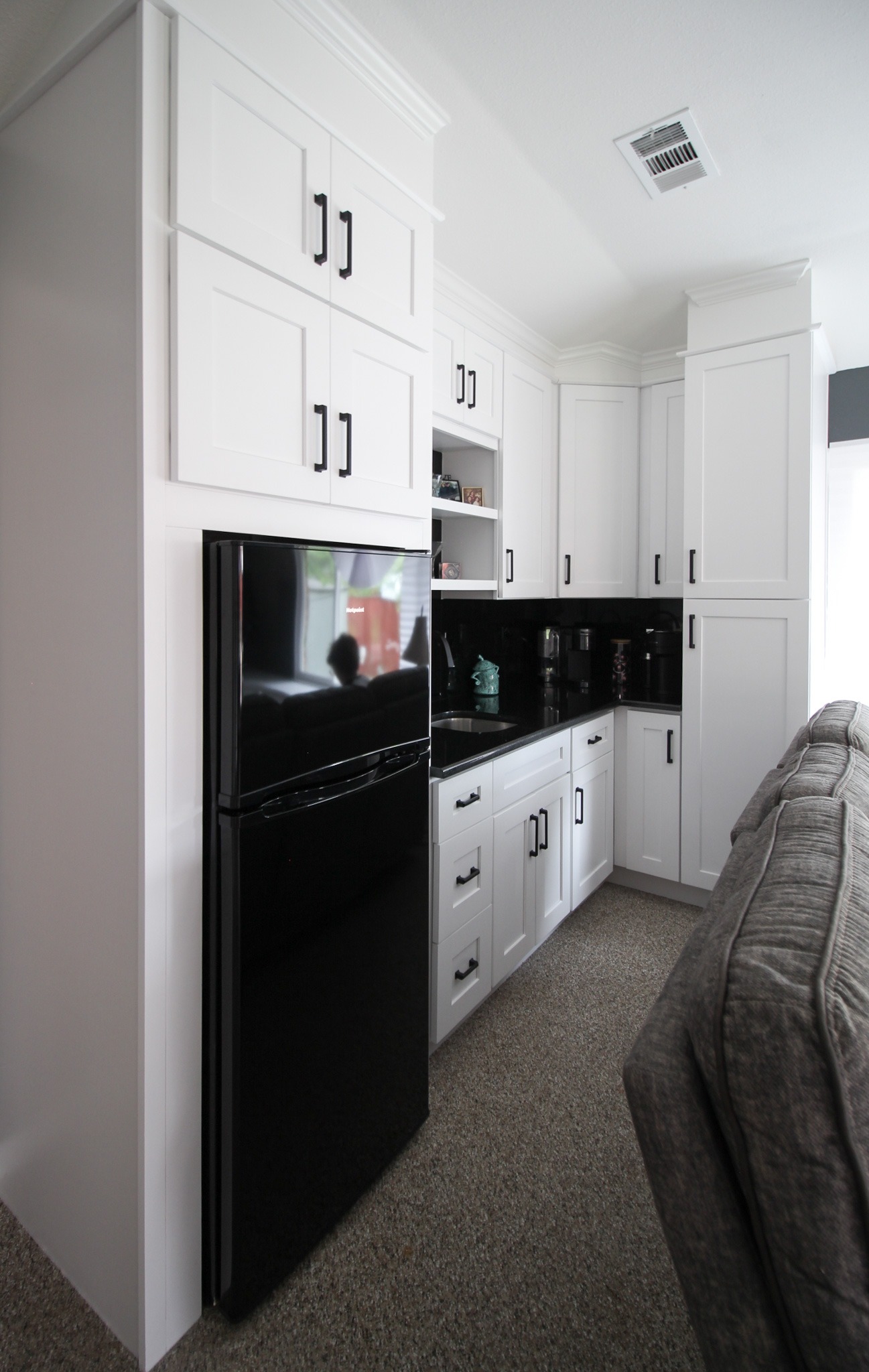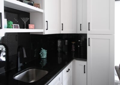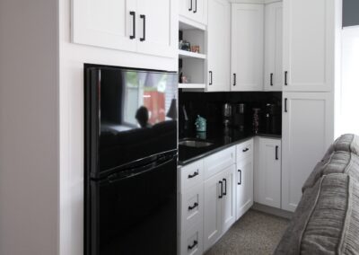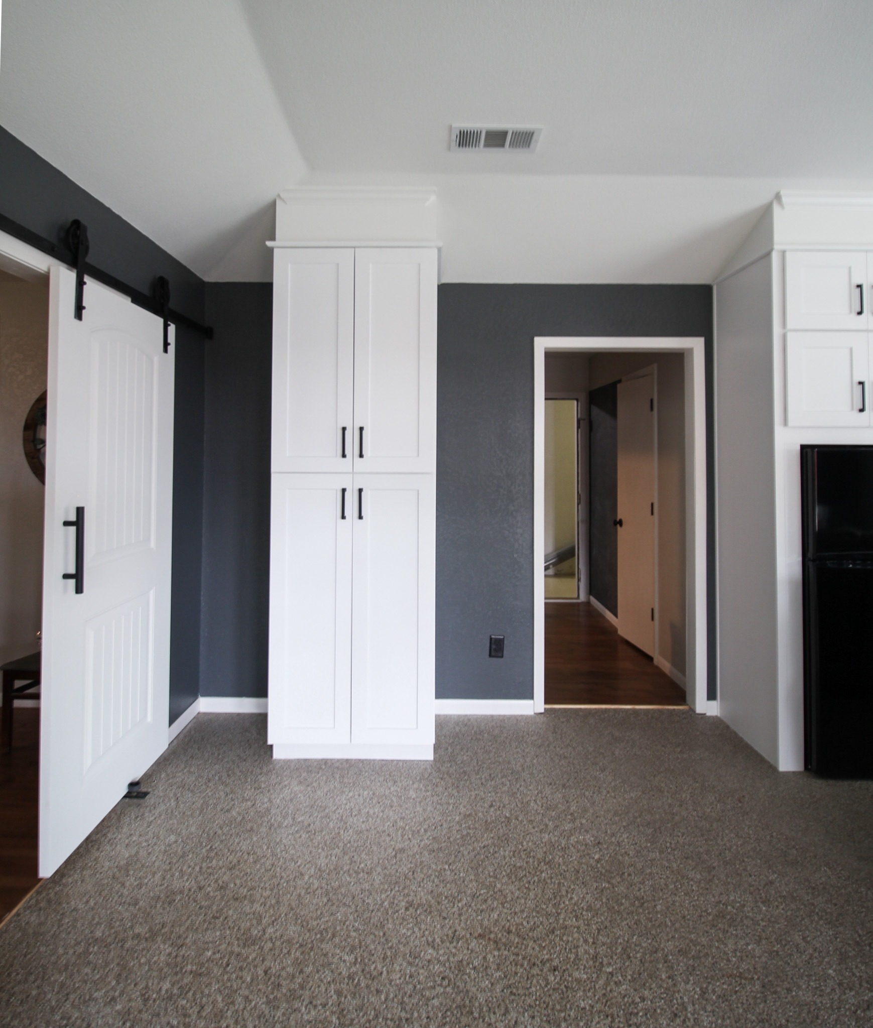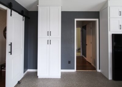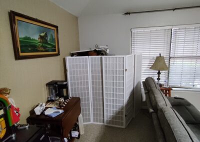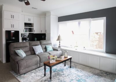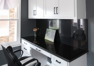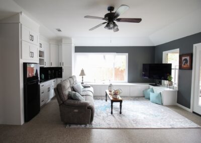 This client in Fort Worth wanted to create a place for her mother-in-law. They wanted to keep the flooring, but update everything else and make the space more functional. We helped with this by adding a custom storage bench under the windows and a custom desk with a granite top. We installed a kitchenette with ready-made cabinets and a granite countertop and backsplash.