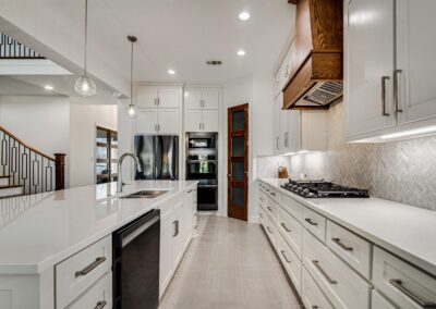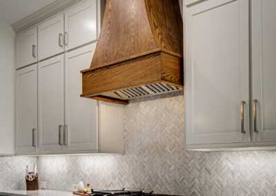 We love how this custom kitchen turned out. We moved the refrigerator from its existing position to make the back wall of the kitchen symmetrical. We put in custom painted cabinets, a custom stained vent hood to match the pantry door, and quartz countertops. The herringbone marble backsplash is sleek and timeless and compliments the colors in the rest of the kitchen.