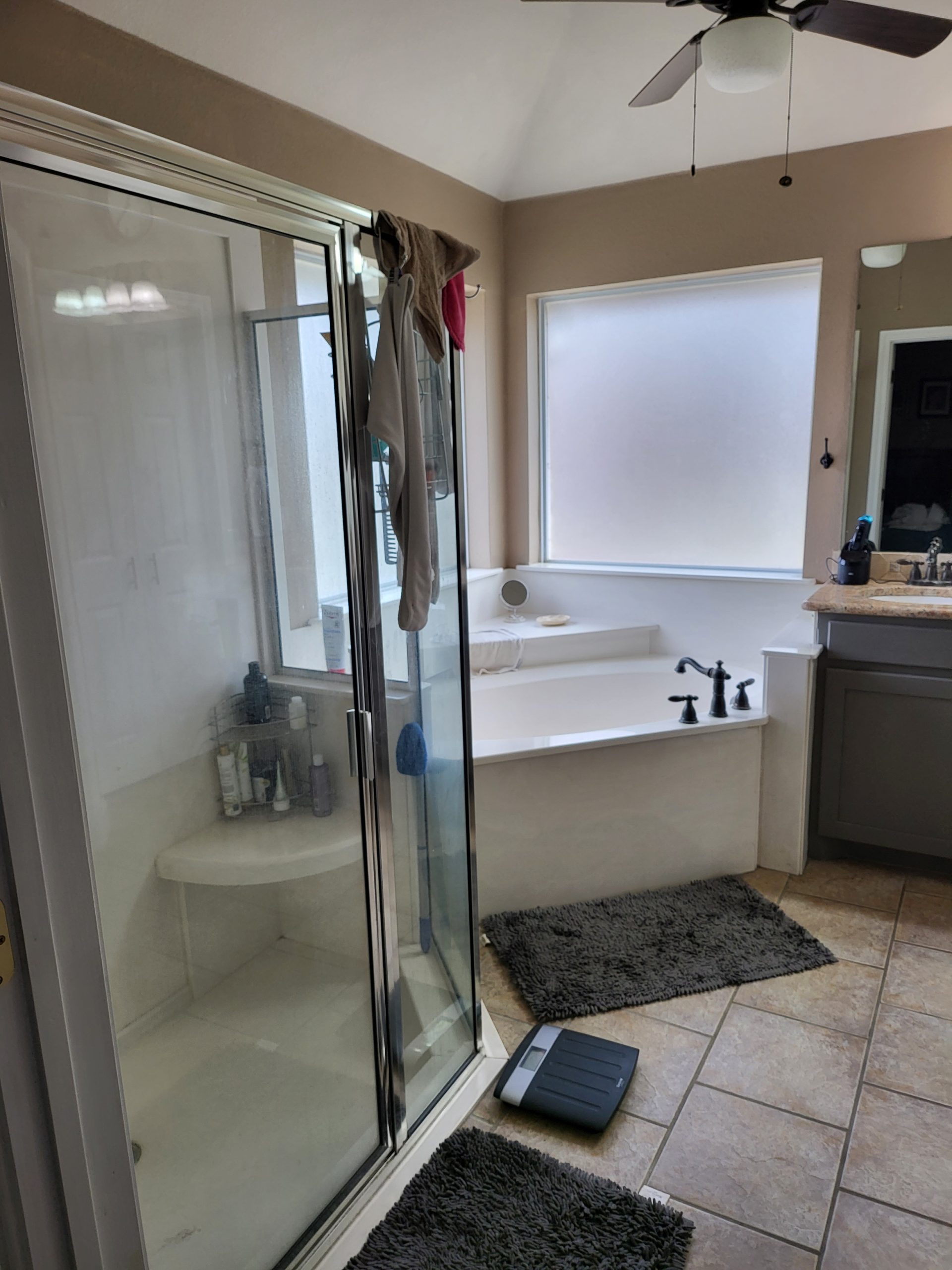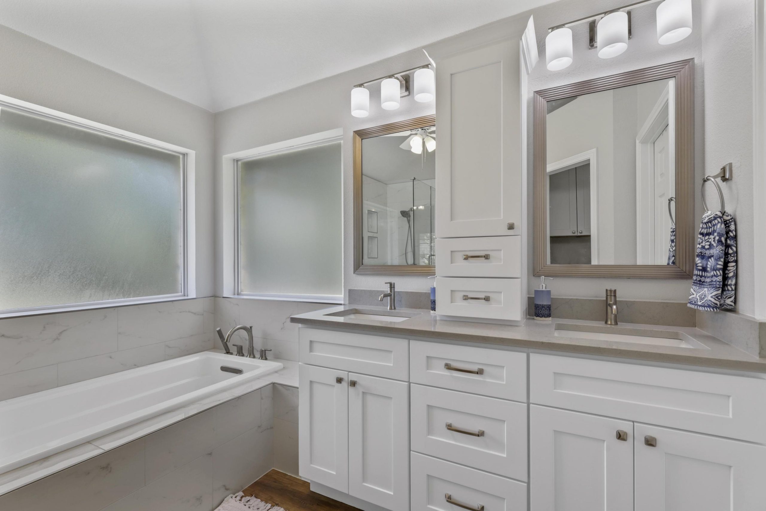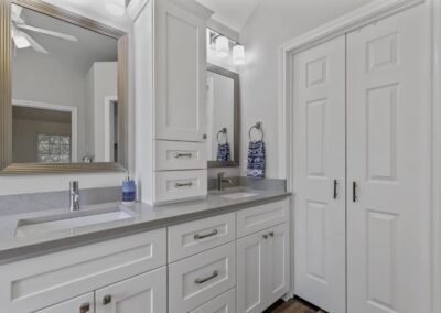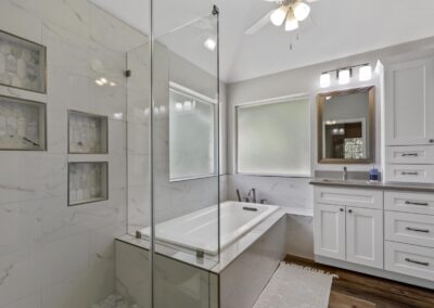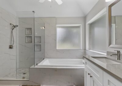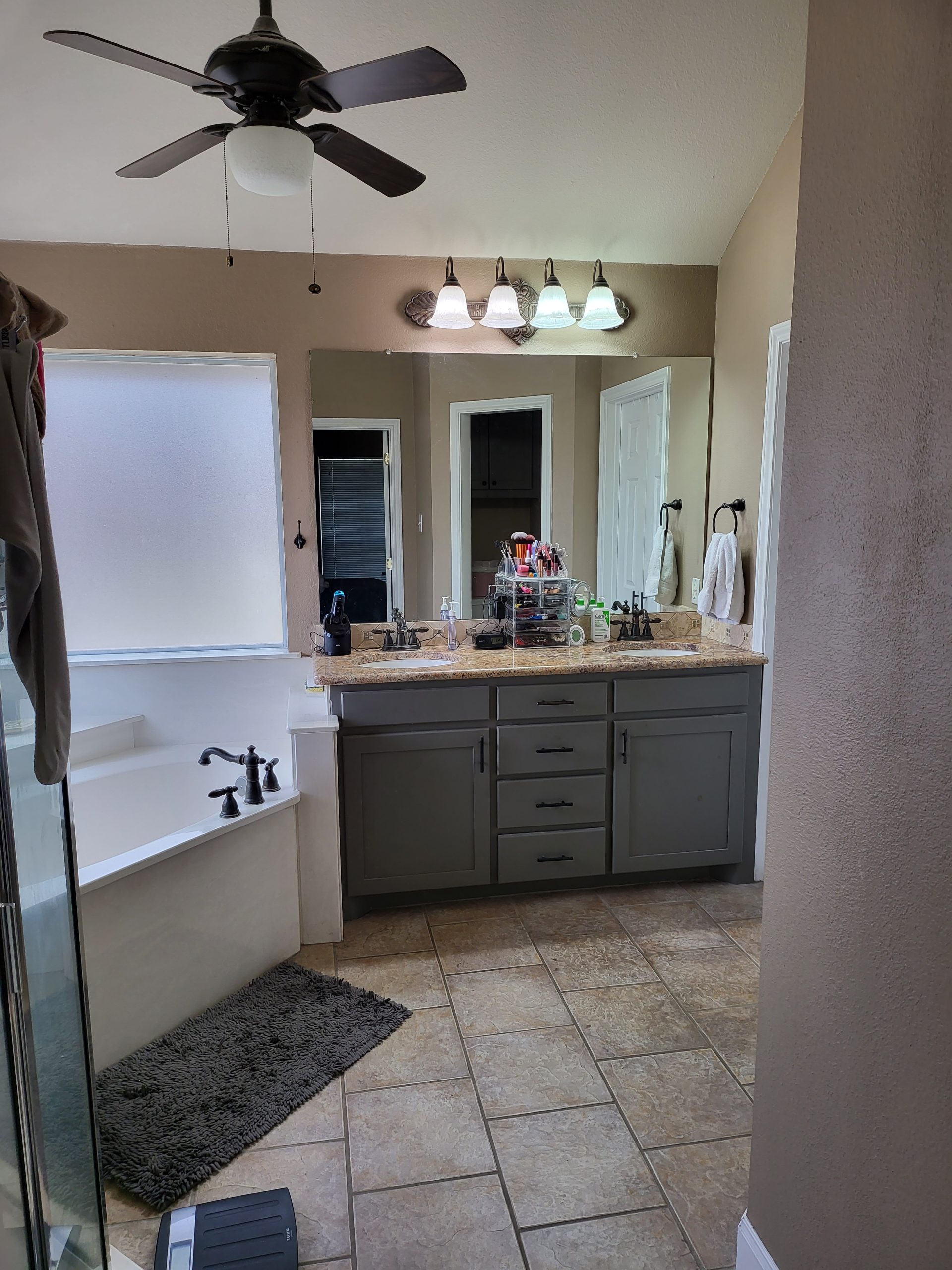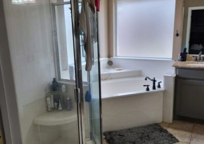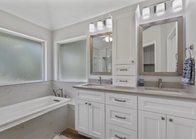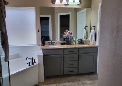 This client’s house needed an upgrade, especially in this master bathroom. Home Front put together a design using high-quality ready-made cabinets to reduce costs, a custom shower, flooring, and paint. We did work in 3 additional secondary bathrooms and touched nearly every room in their house during this 8-week project.