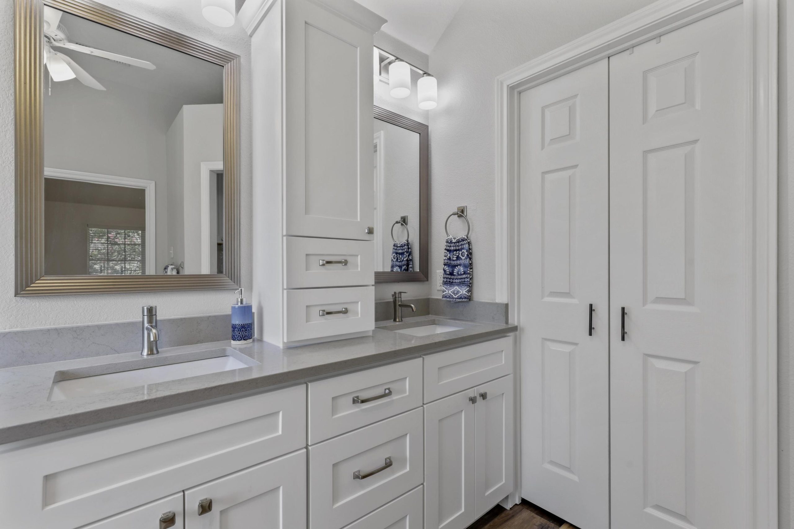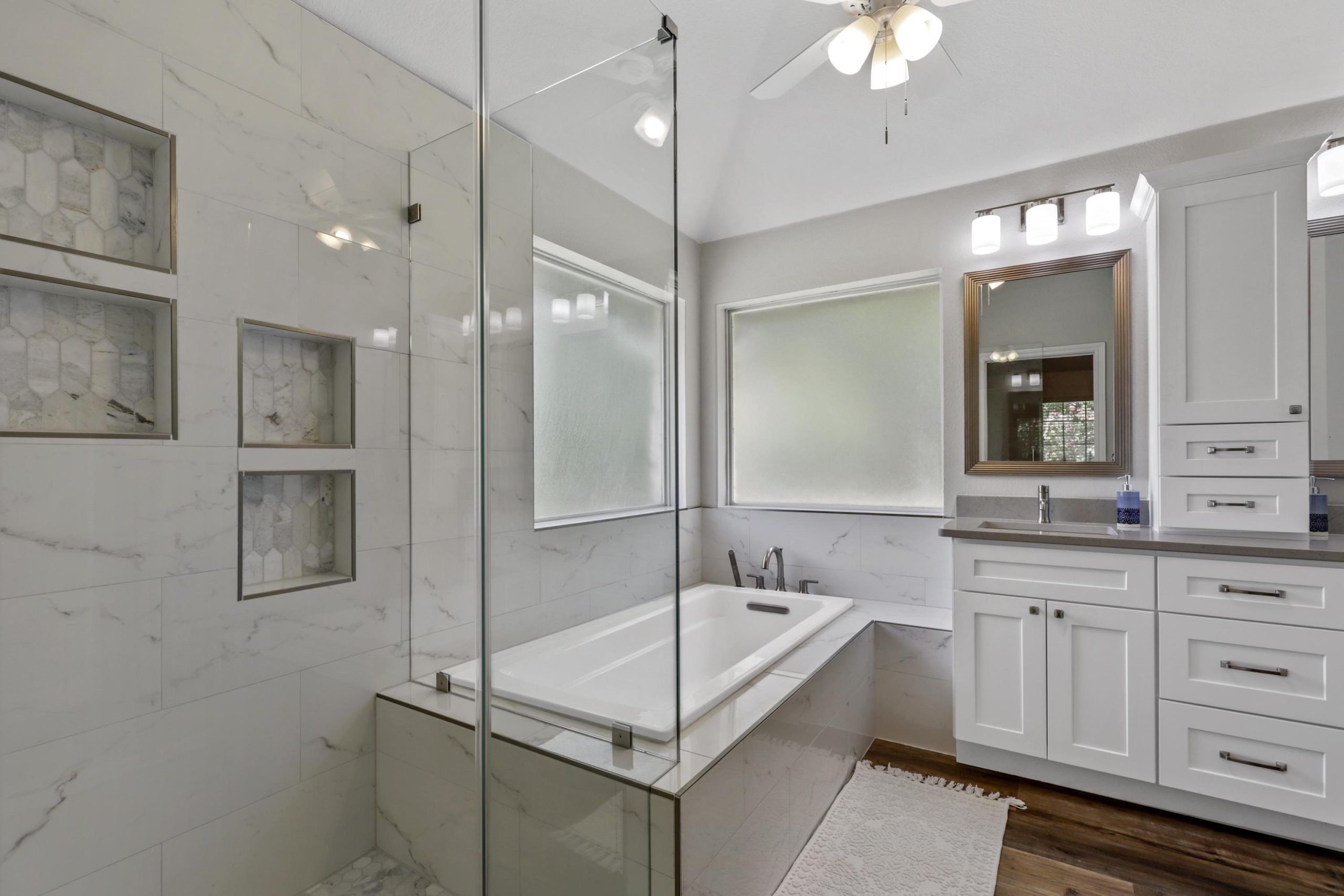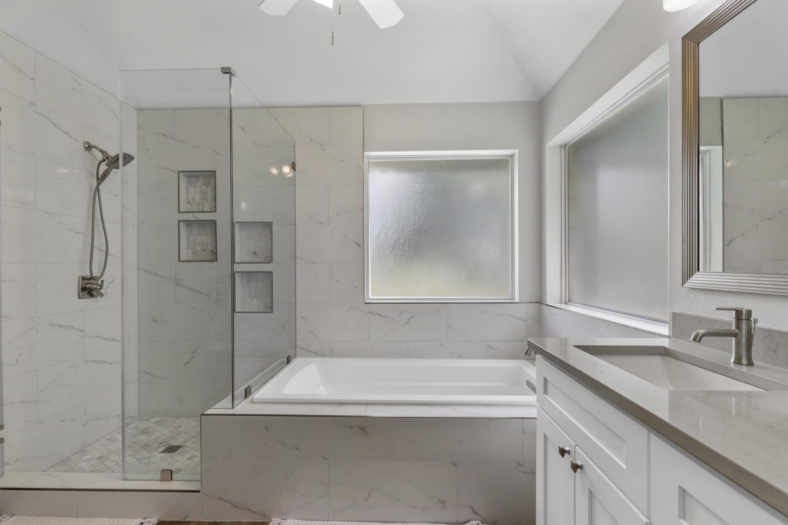 This client’s house needed an upgrade, especially in this master bathroom. Home Front put together a design using high-quality ready-made cabinets to reduce costs, a custom shower, flooring, and paint. We did work in 3 additional secondary bathrooms and touched nearly every room in their house during this 8-week project.