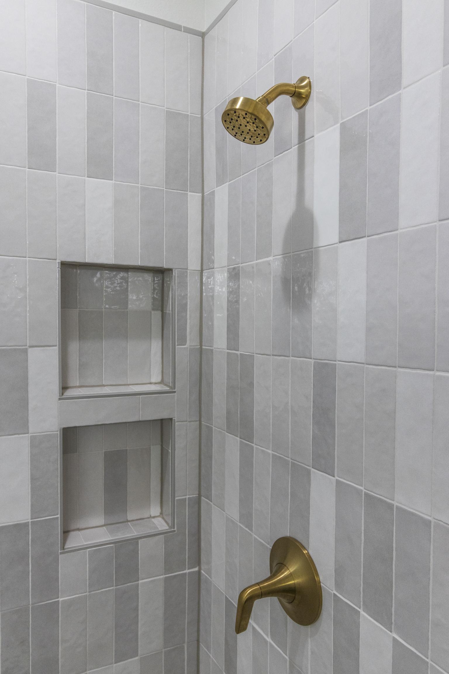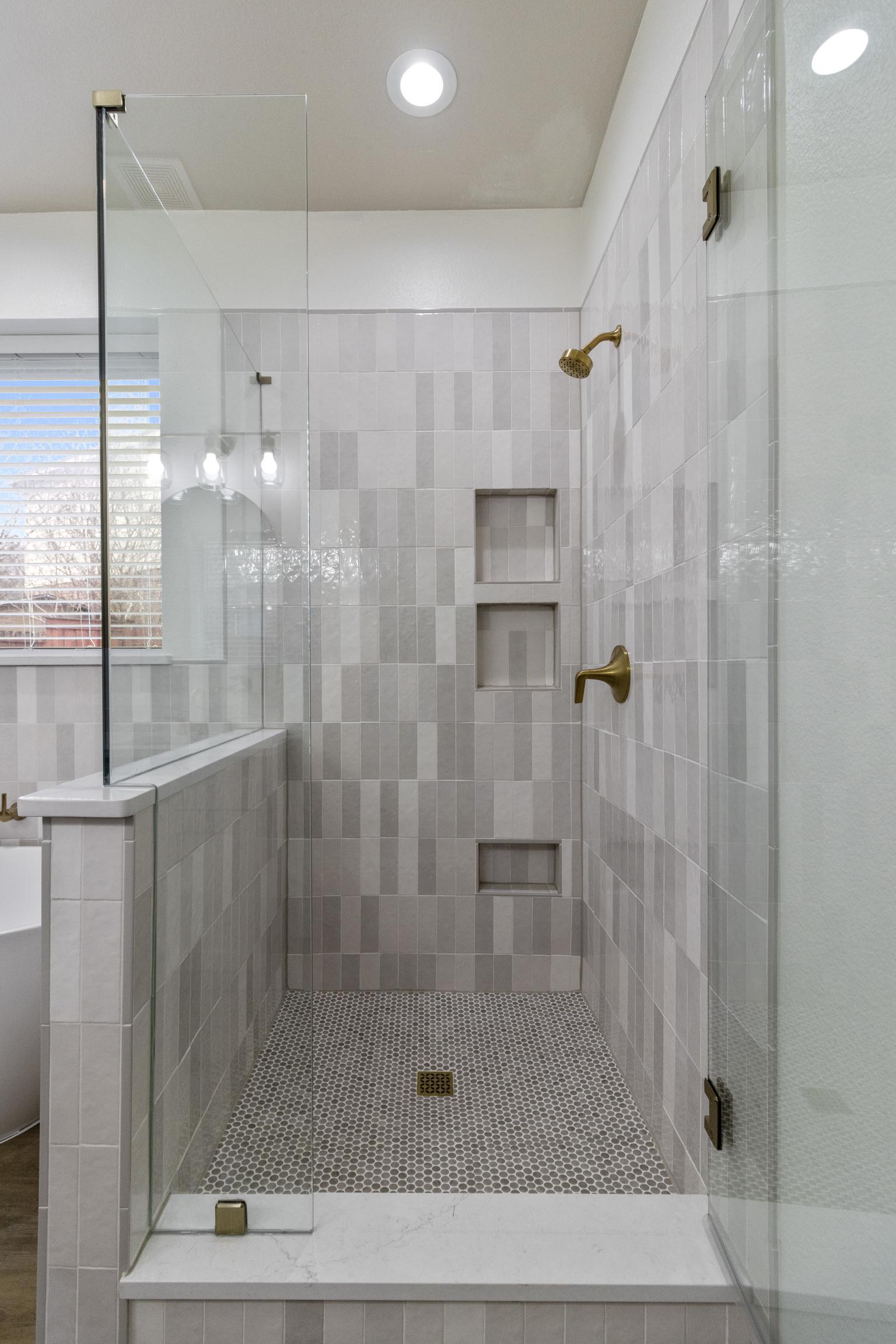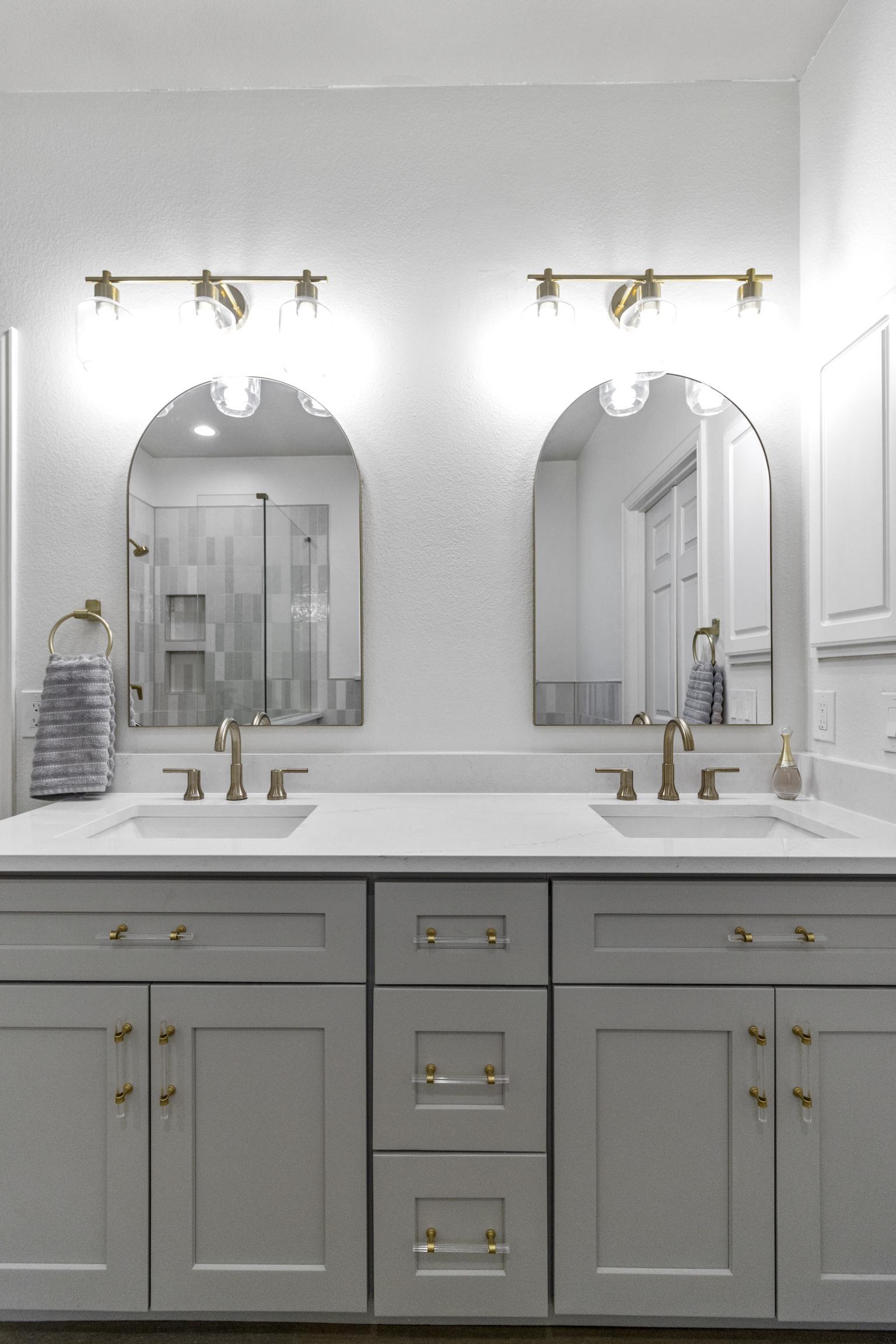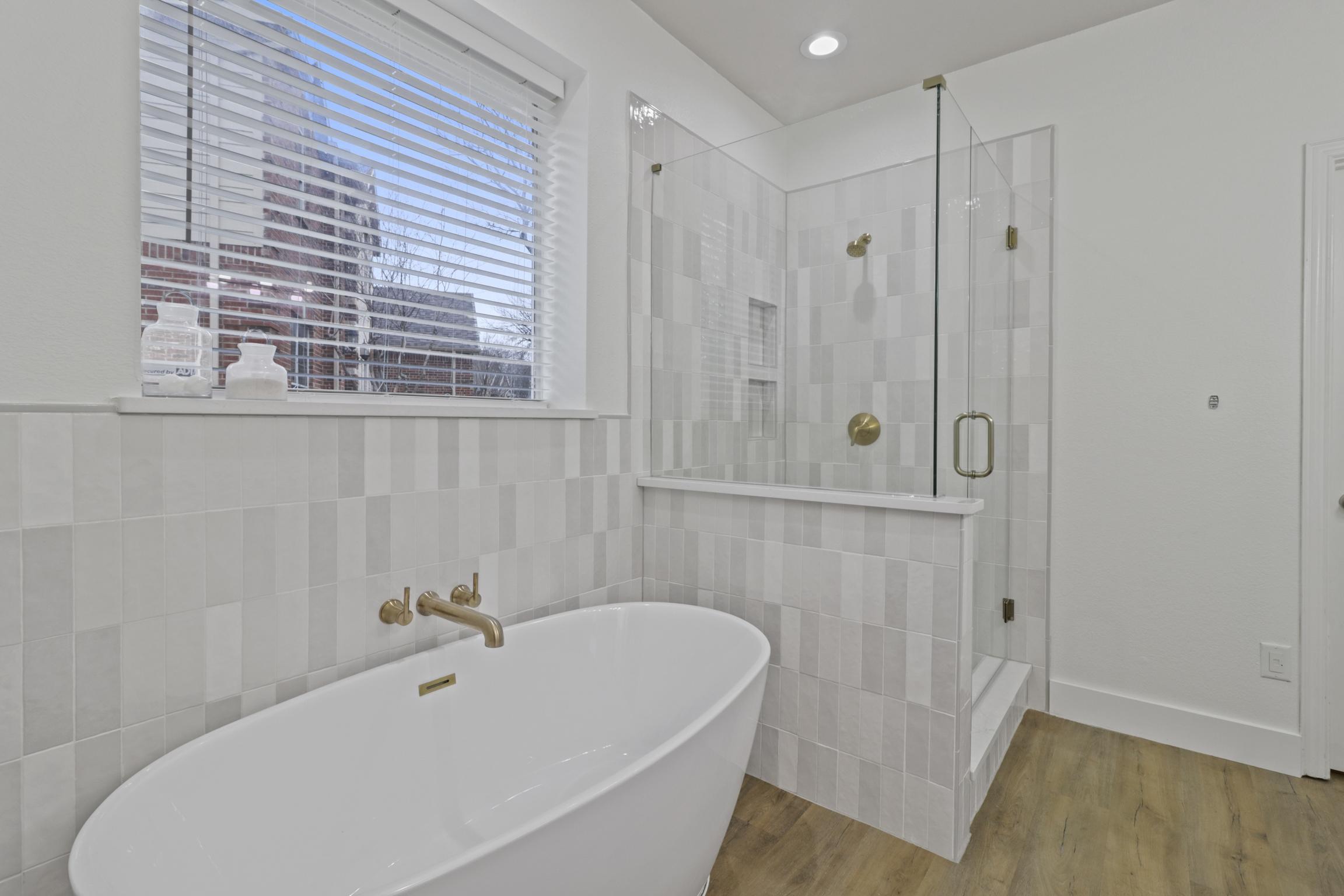 Our client in Grand Prairie used us to help her update a bathroom. an external designer to update her bathroom and make it feel bright and clean. Our client wanted a bathroom that felt brighter and cleaner, so she selected materials with an outside designer that did just that. We brought the vision to life with ready-made vanities, a free standing tub, and a custom tiled shower.