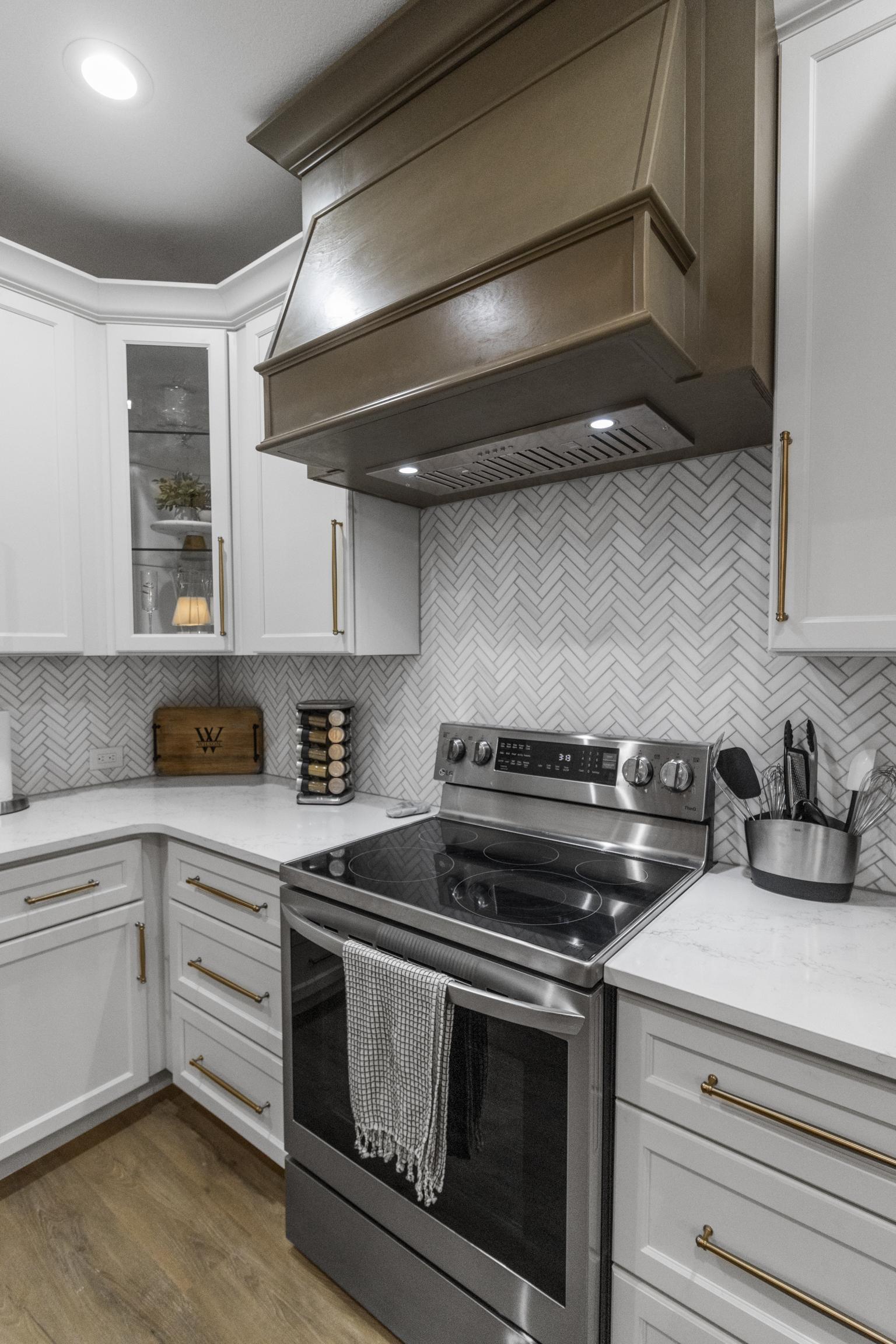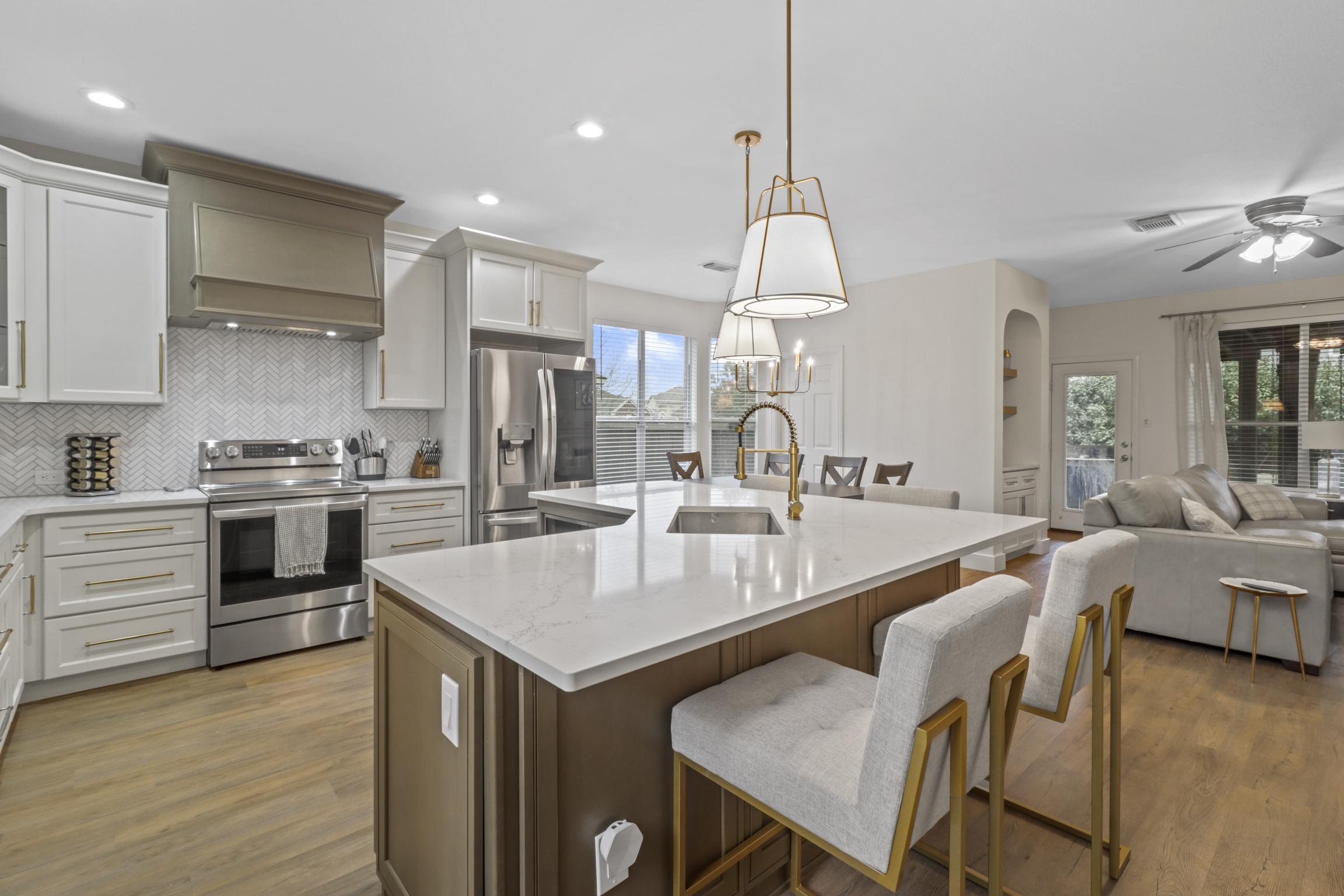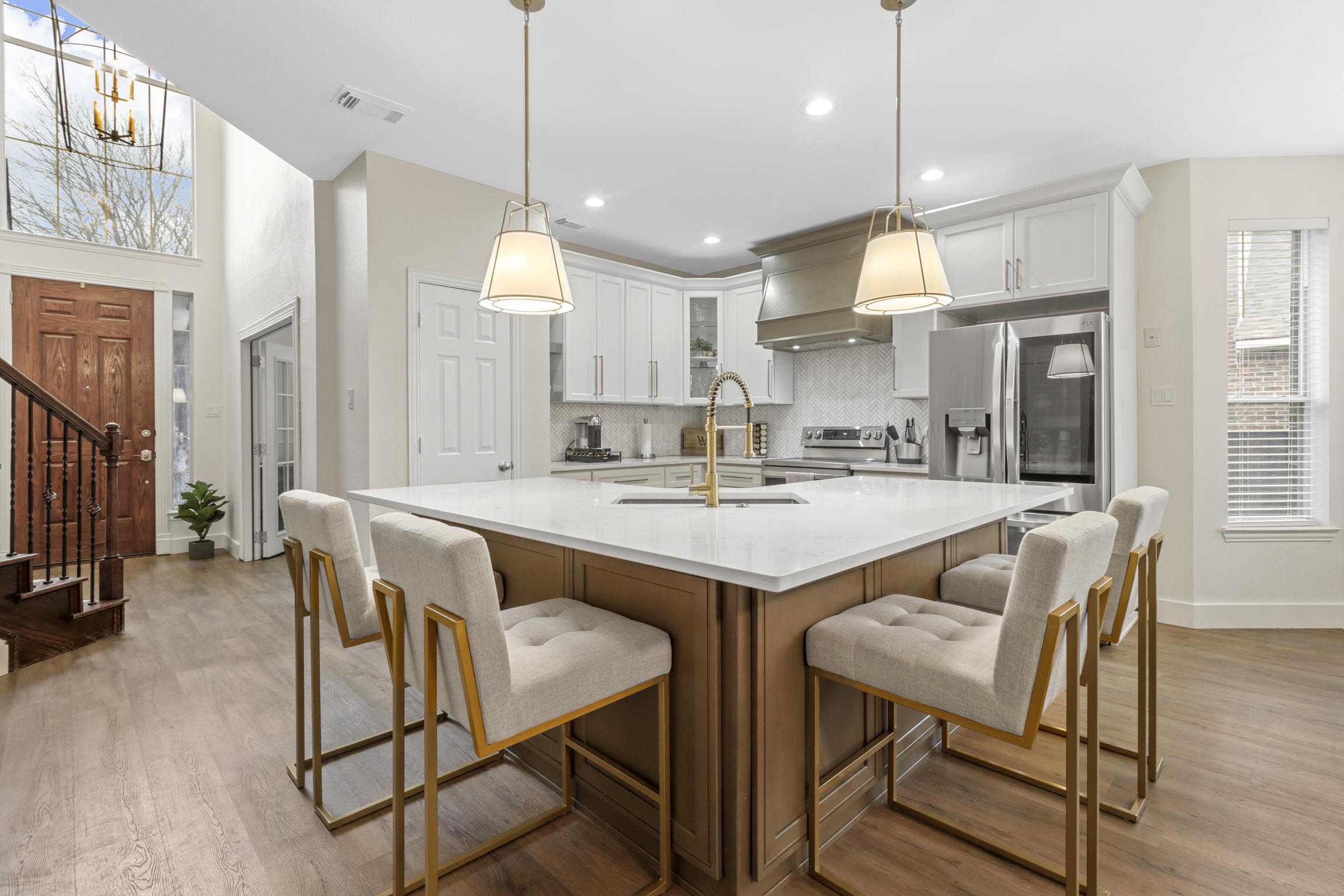 This kitchen in Grand Prairie was dark and outdated, so we helped transform it. We used ready-made cabinets to give our client a new island in the same location. The quartz countertops, natural stone backsplash, and gold accents makes this kitchen feel very elevated and warm. Our crew also installed luxury vinyl planks (LVP) in all the rooms downstairs.