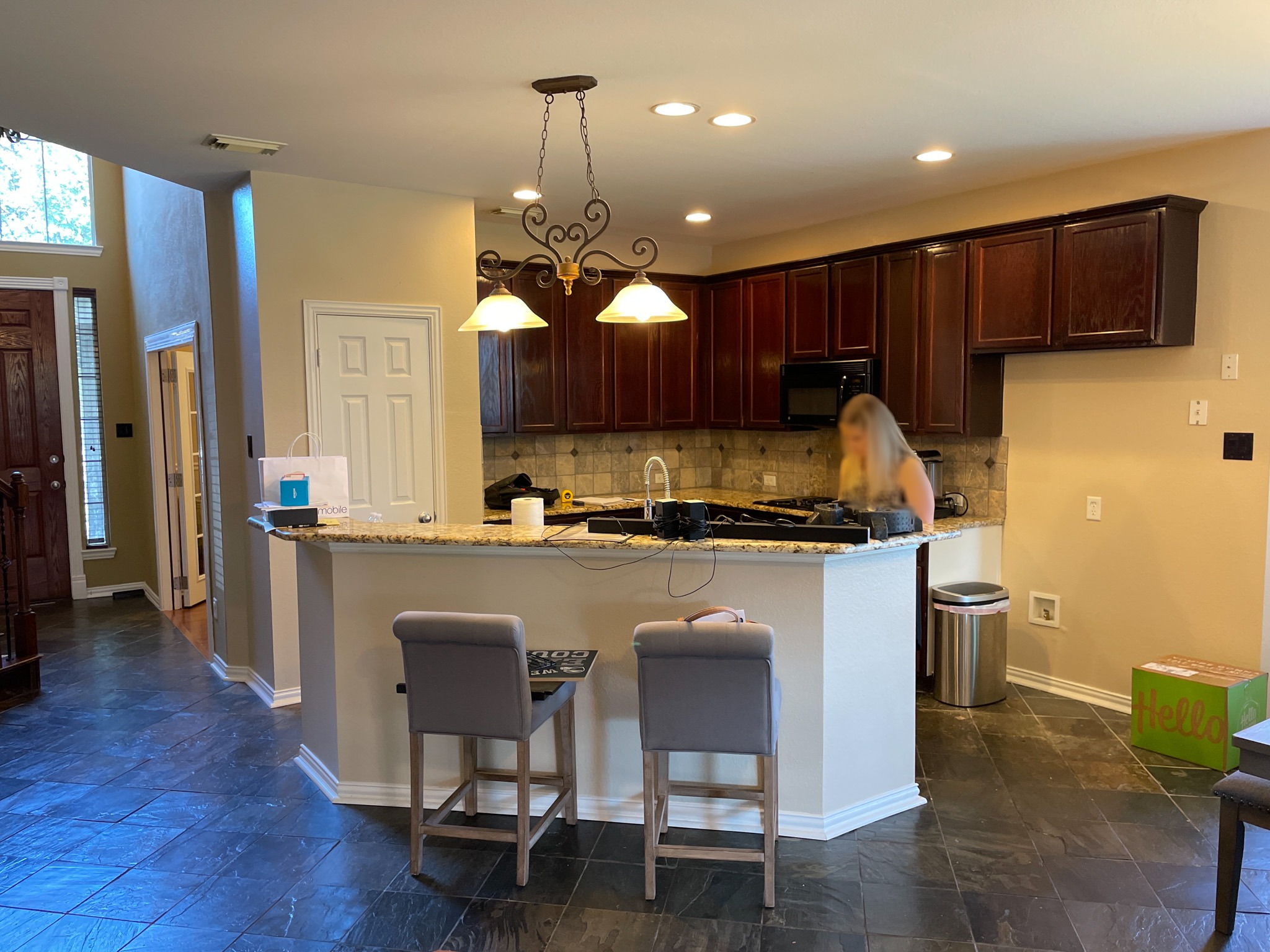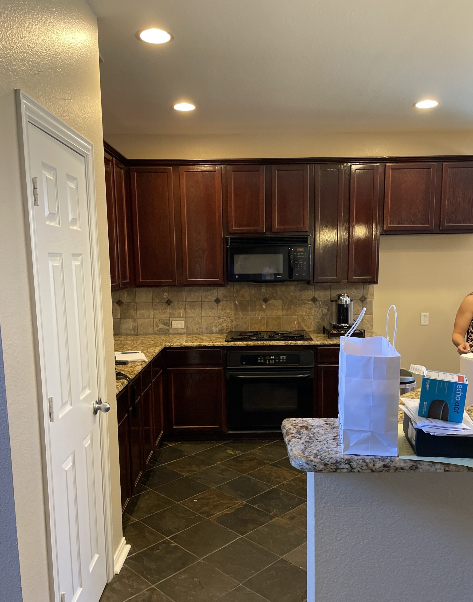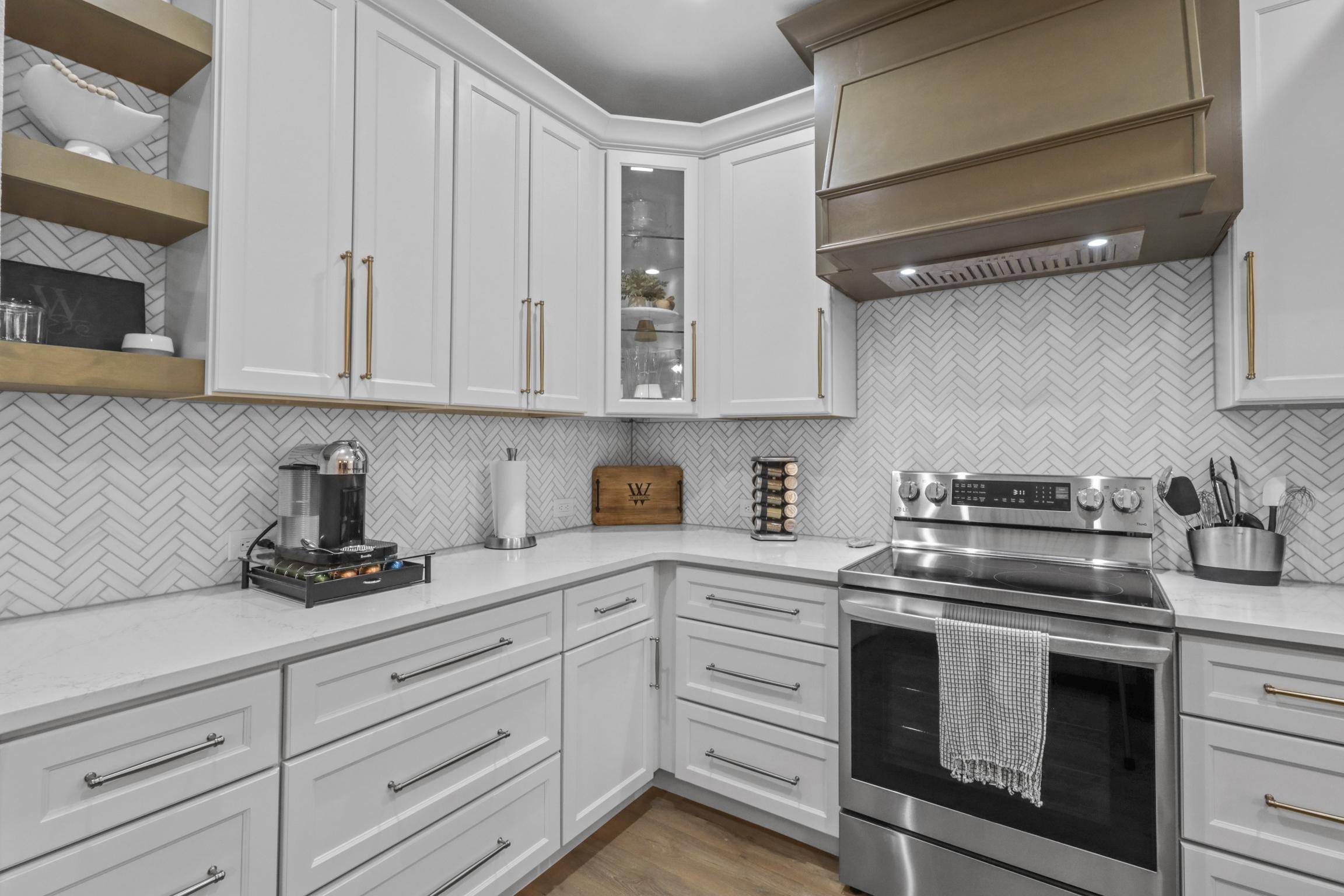 This kitchen in Grand Prairie was dark and outdated, so we helped transform it. We used ready-made cabinets to give our client a new island in the same location. The quartz countertops, natural stone backsplash, and gold accents makes this kitchen feel very elevated and warm. Our crew also installed luxury vinyl planks (LVP) in all the rooms downstairs.