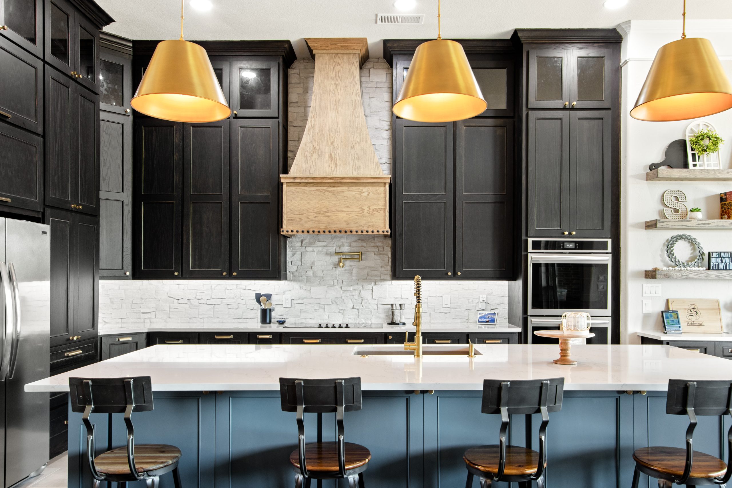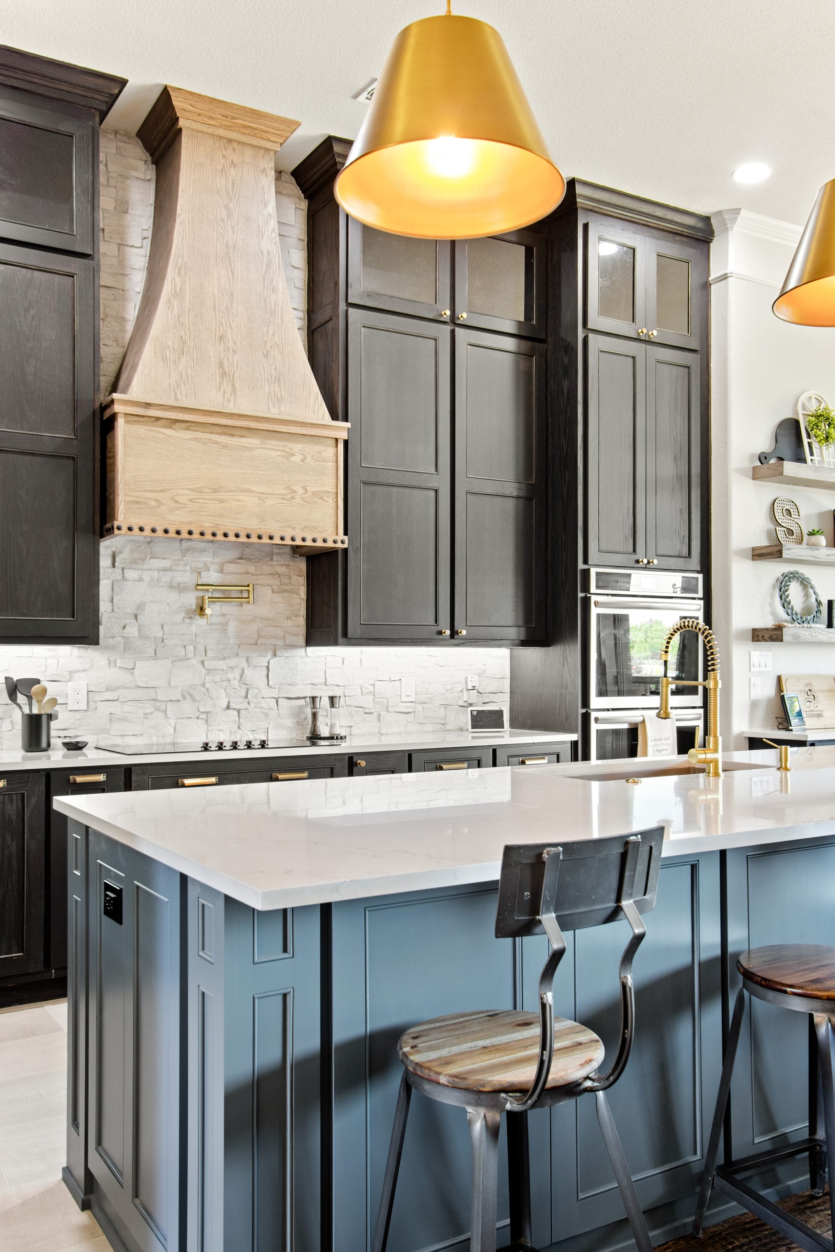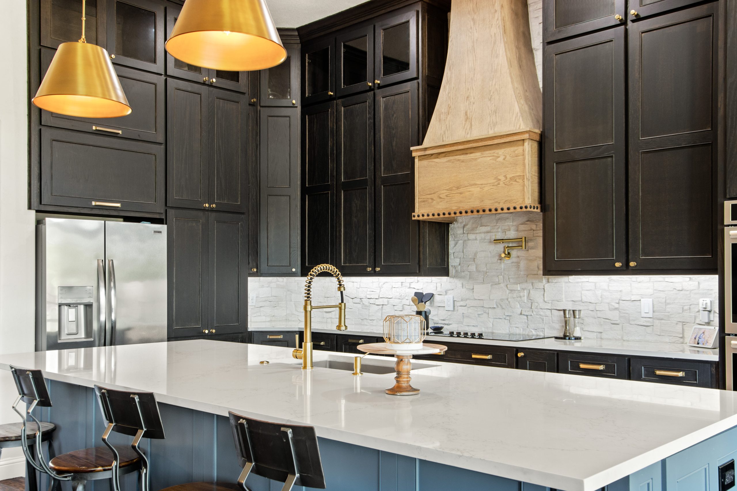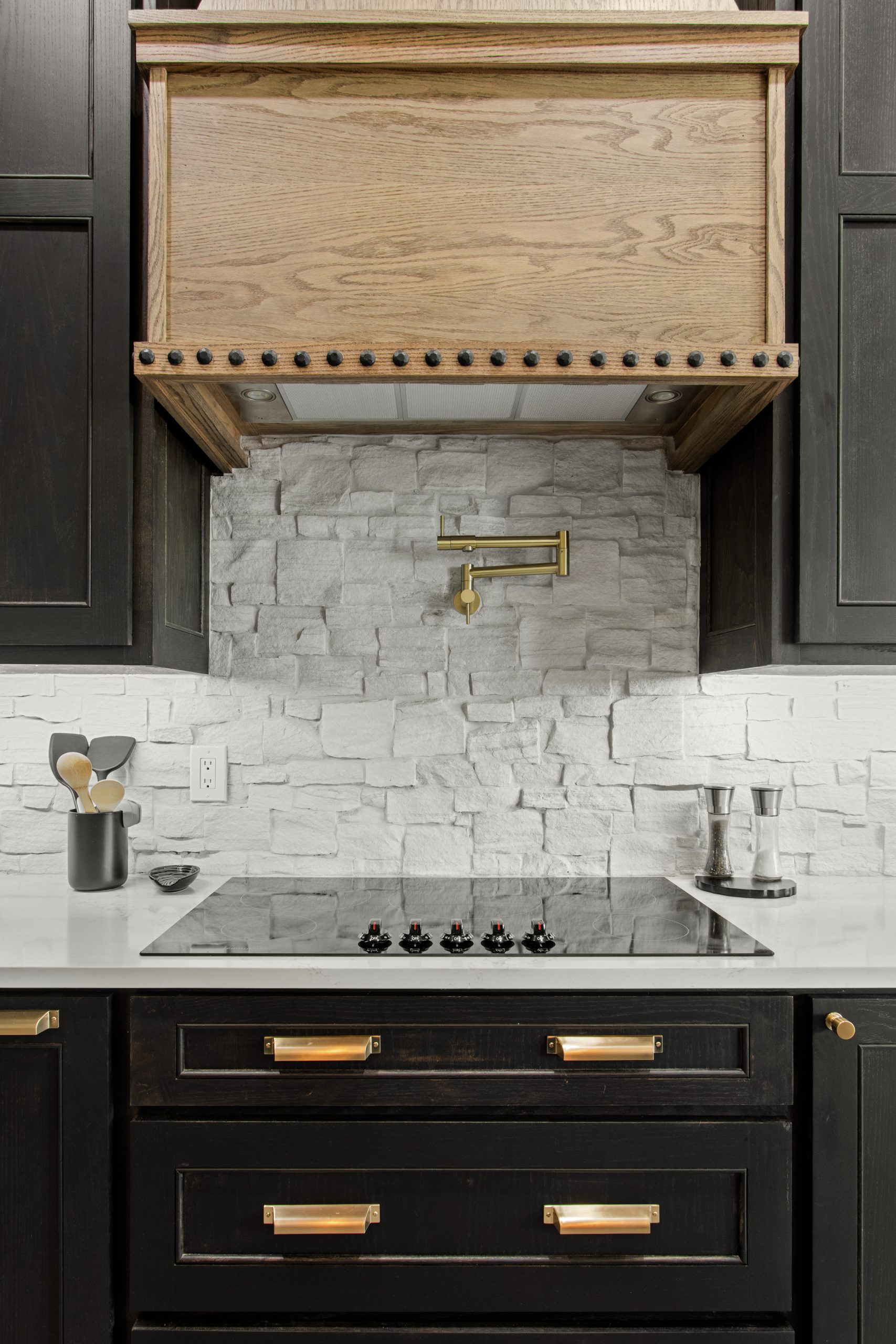 Our client’s family was limited by their existing storage space in the kitchen and worked with an external designer to use as much of the available space as possible. We removed the existing corner pantry and turned it into a pantry cabinet with large pullouts and shelving and installed new custom black-stained cabinets, built to the 12′ ceilings to maximize the space. The client loved the look of natural materials so they chose a raw stone backsplash that was installed one piece at a time. A custom vent hood was built with nail head trim, and our crews stained it in a contrasting color.