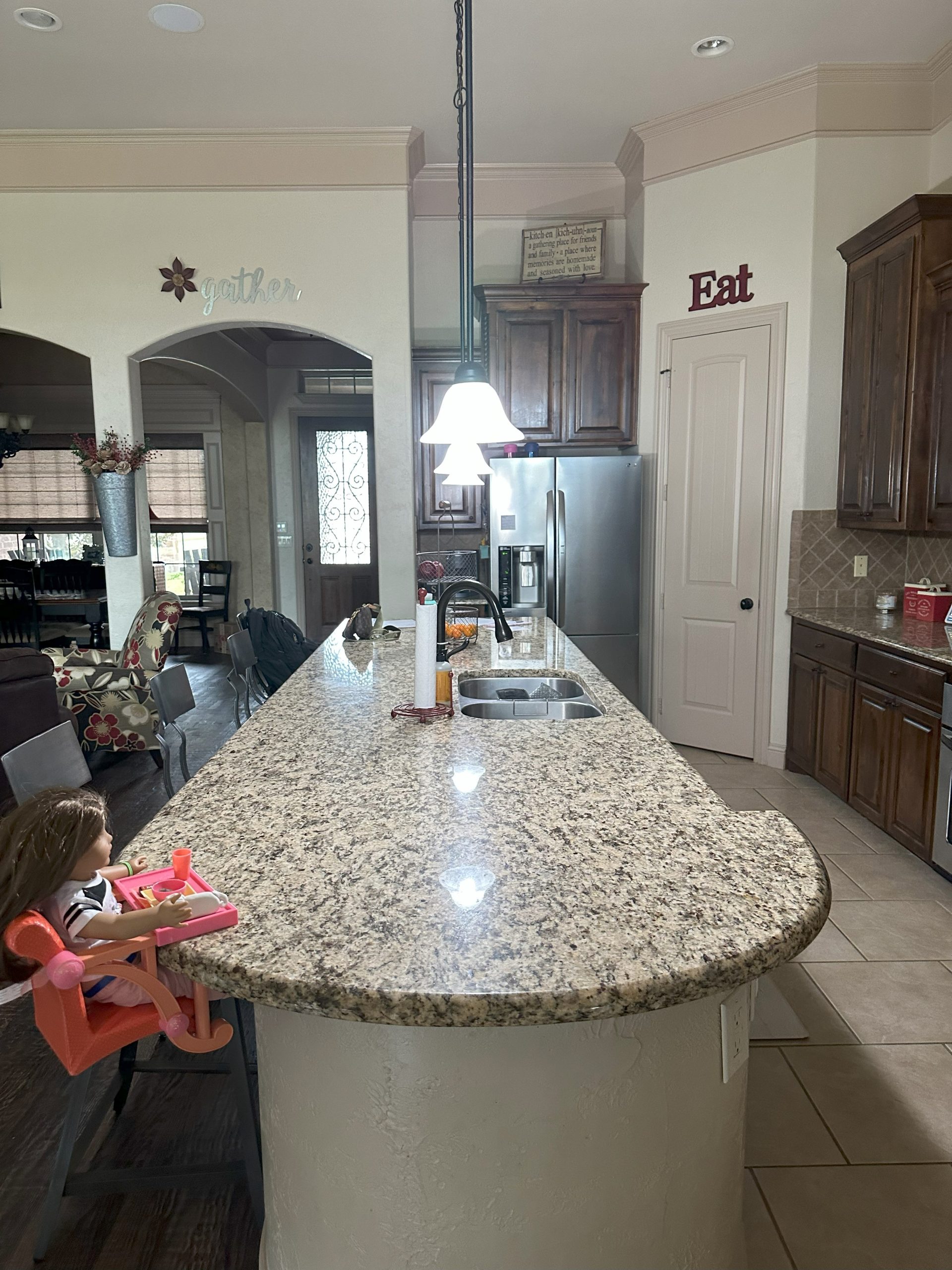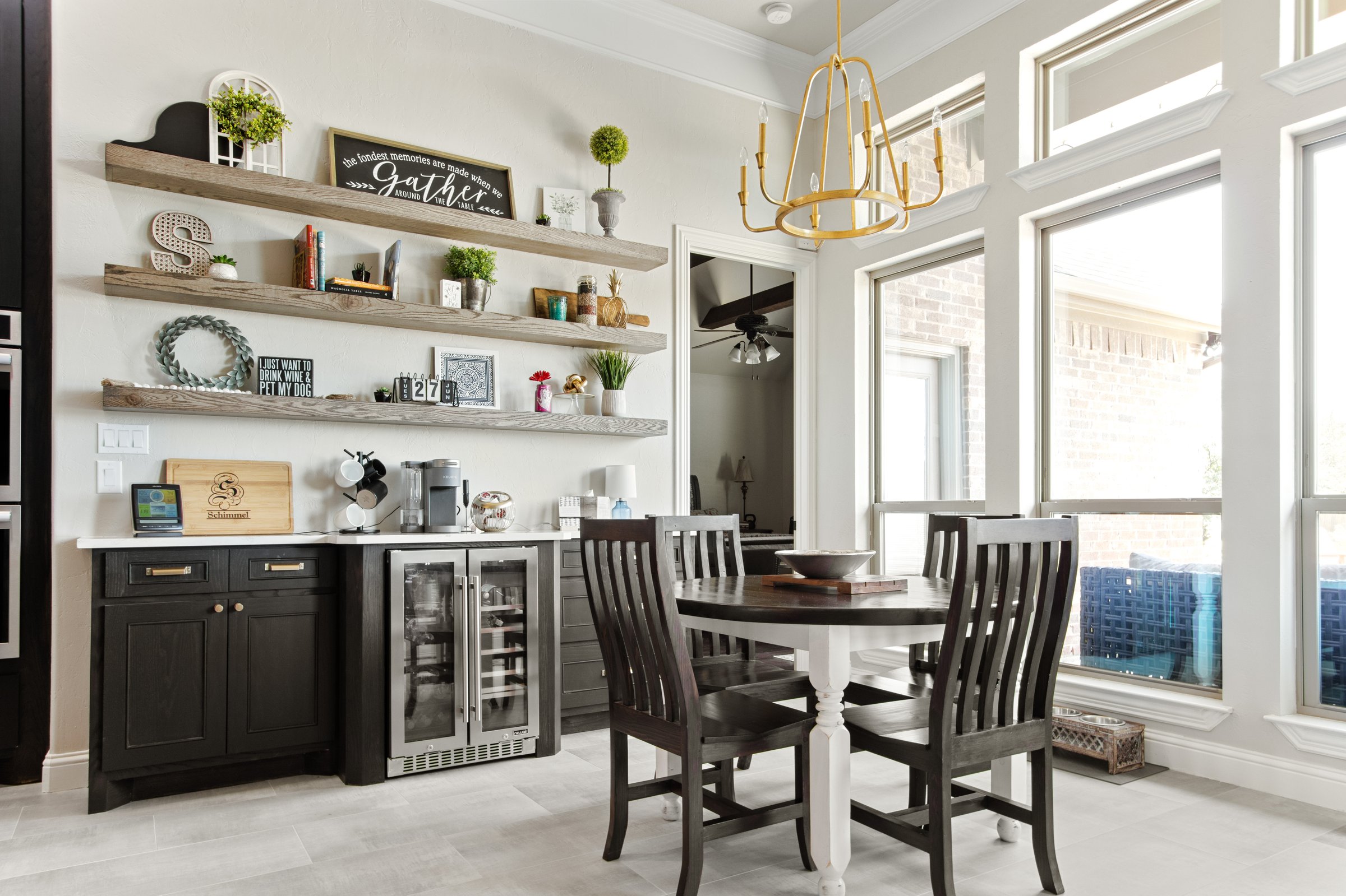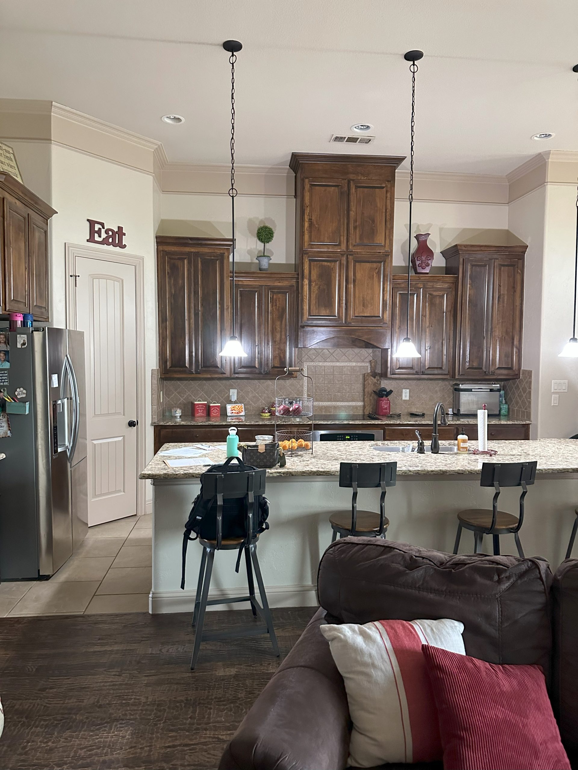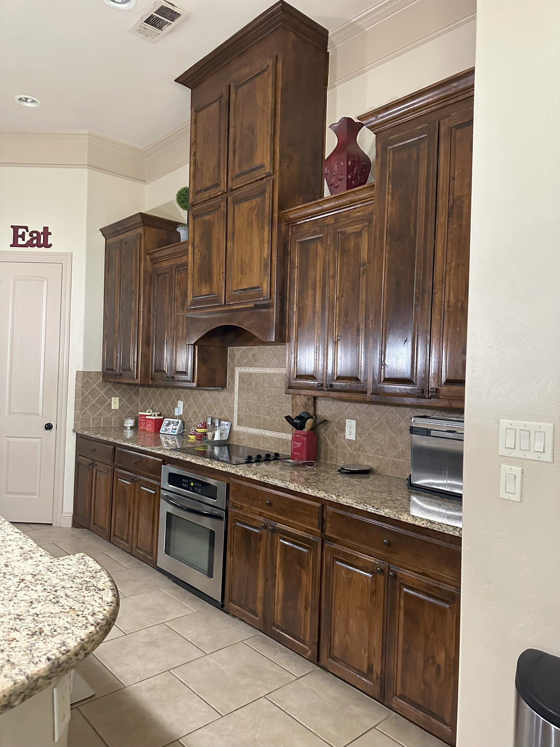 Our client’s family was limited by their existing storage space in the kitchen and worked with an external designer to use as much of the available space as possible. We removed the existing corner pantry and turned it into a pantry cabinet with large pullouts and shelving and installed new custom black-stained cabinets, built to the 12′ ceilings to maximize the space. The client loved the look of natural materials so they chose a raw stone backsplash that was installed one piece at a time. A custom vent hood was built with nail head trim, and our crews stained it in a contrasting color.