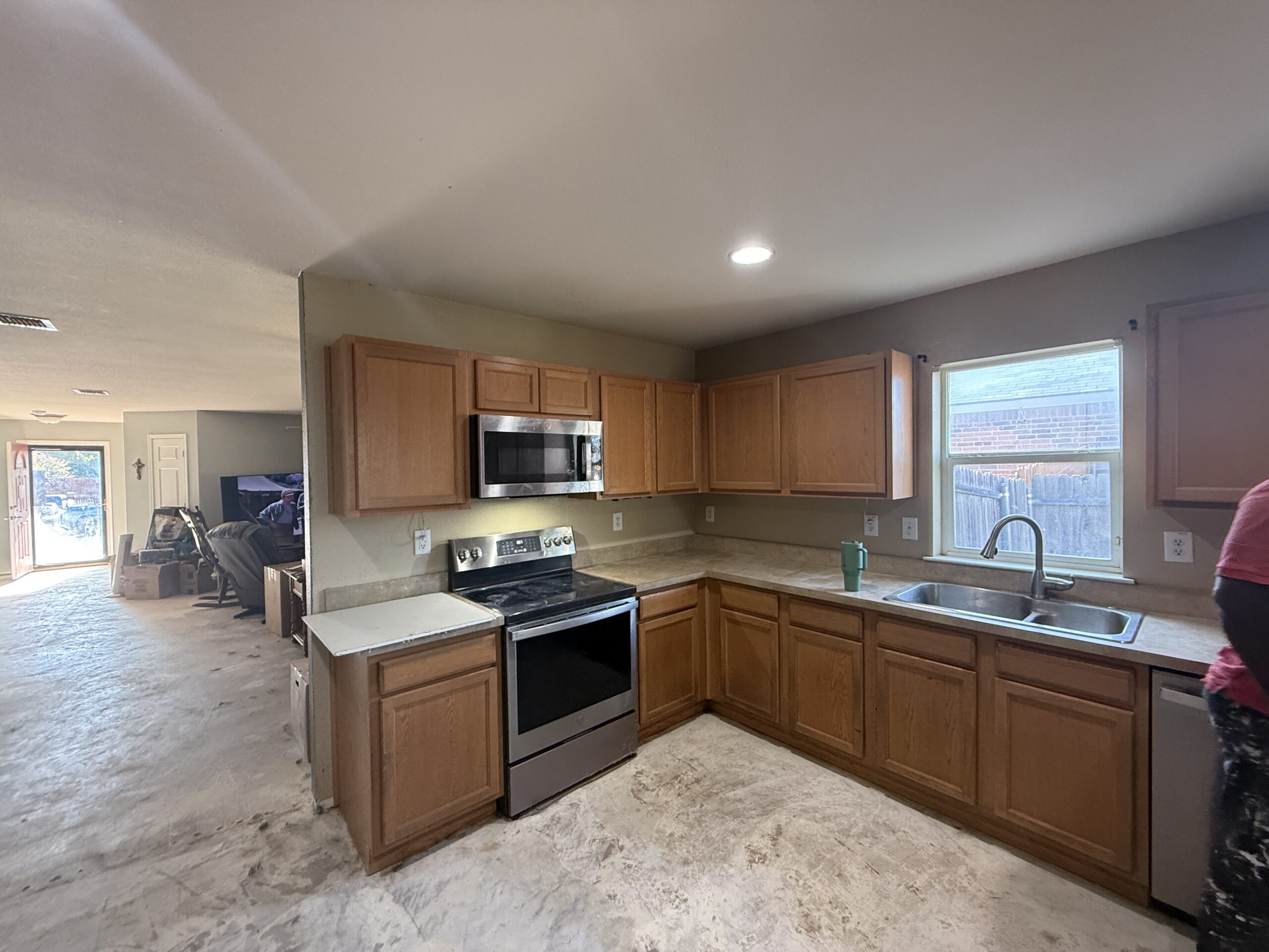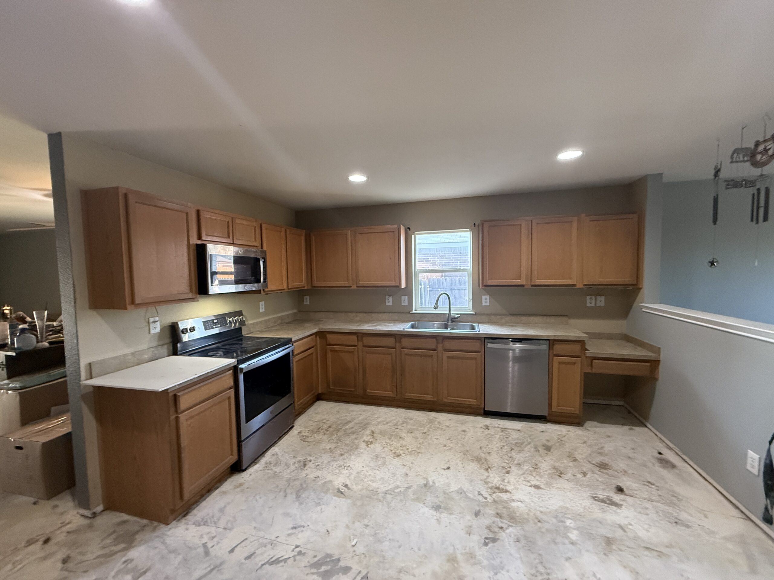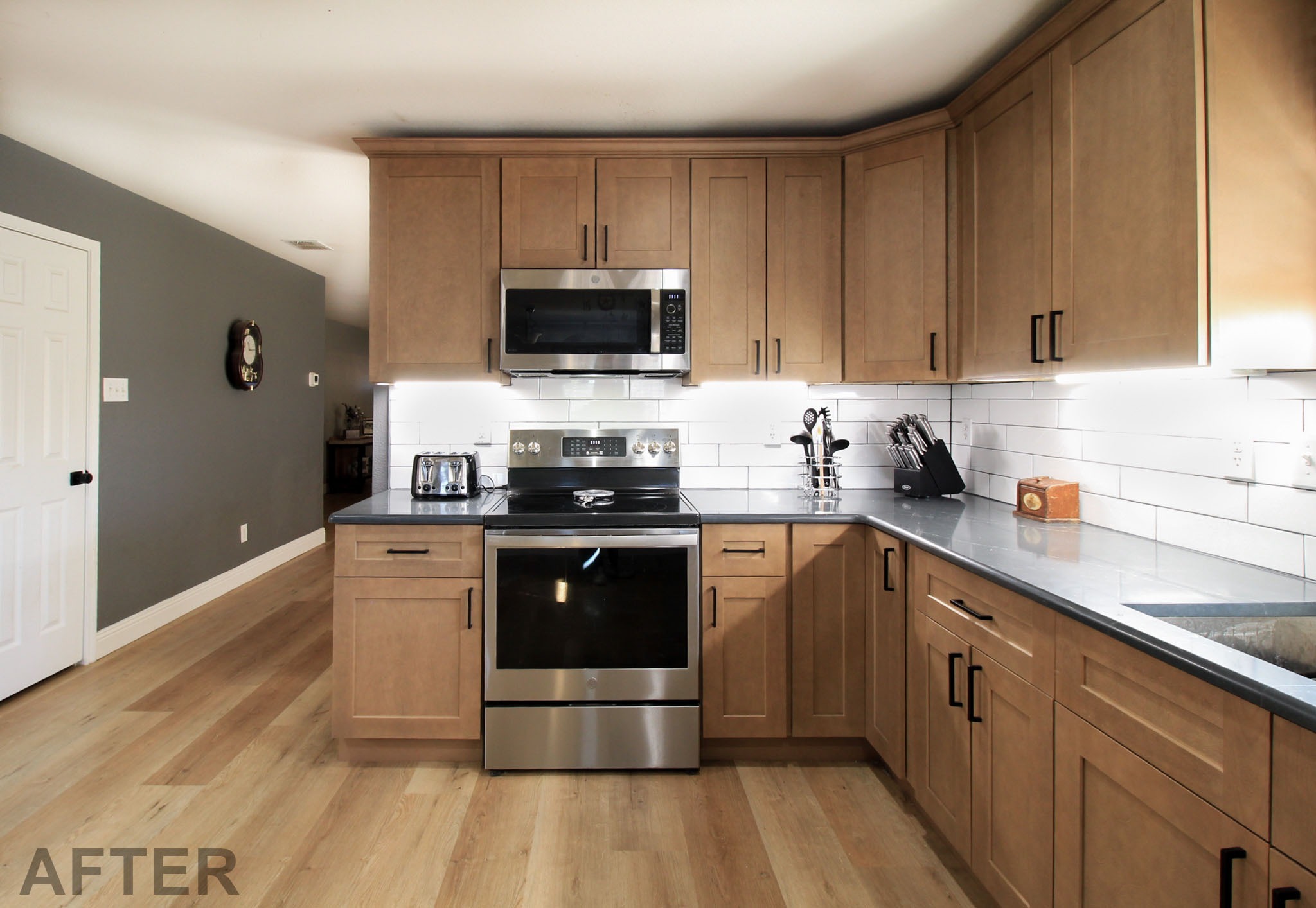 We installed new luxury vinyl plank (LVP) flooring throughout the home, including the kitchen. Our team installed semi-custom stained cabinetry that reaches all the way to the ceiling to add valuable storage for our clients.
